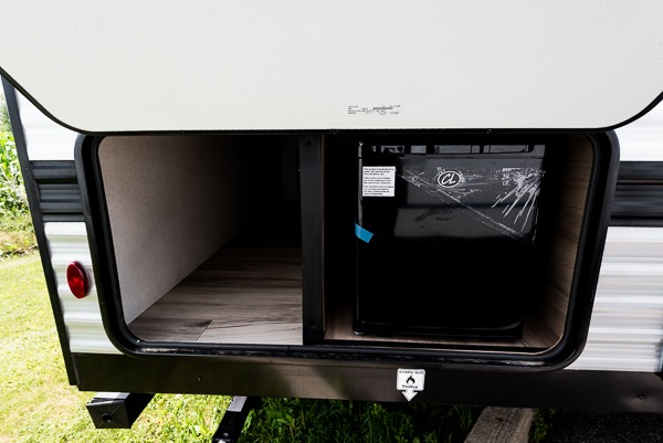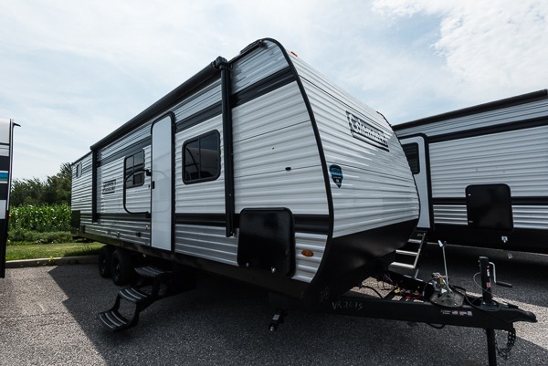 Camp cooking is easy thanks to a two-burner cooktop, microwave oven and 8-cu-ft 12-V refrigerator inside, plus an outdoor refrigerator under the 16-foot power awning for cold drinks at the campsite. The full bathroom offers a tub/shower, foot-flush toilet and sink, and there’s pass-through and bunk-house storage for all your outdoor gear. At just over 6,000 lbs dry, the 27B is towable by many half-ton trucks and measures 31 ft 11 inches long with a 41-gallon fresh water tank.