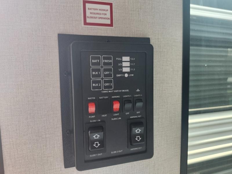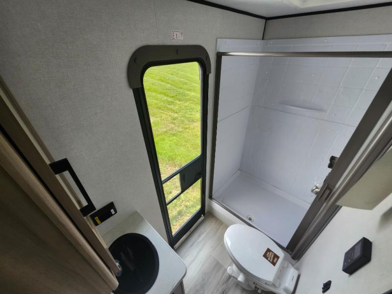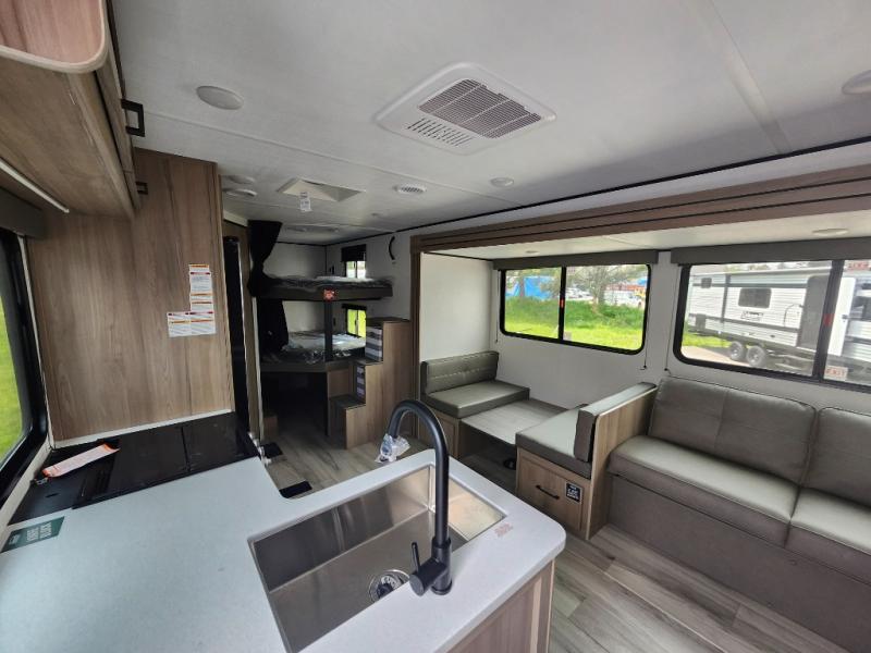 If you're needing additional sleeping space and added comfort in your next RV, this travel trailer is the one! There are double-size bunks with steps in the back for your guests or little ones, and the full bath includes one of the dual entry doors to the unit for added convenience. The combined kitchen and living area is made spacious thanks to the large slide out which houses the sofa and booth dinette. You can make meals on the three burner range or in the air fryer/convection microwave, and there is a 16 cu. ft. 12V refrigerator to keep food fresh. A 50" TV and fireplace features hidden shelves behind it for smart storage space plus there is an entryway pantry for snacks galore! Outside, the 21' power awning will provide shade as you visit in your camp chairs, and there is a 2.6 cu. ft. outdoor refrigerator to keep cold drinks on hand!