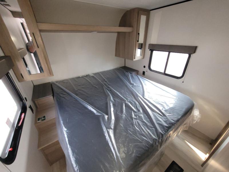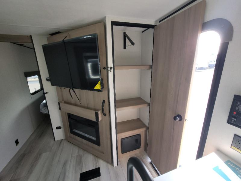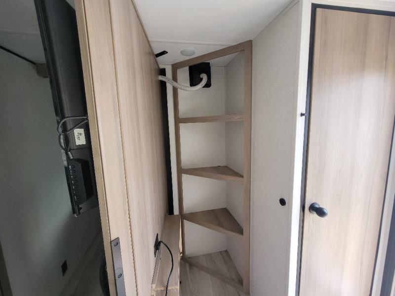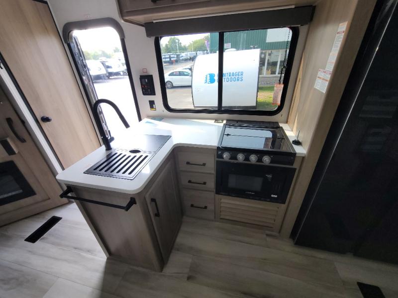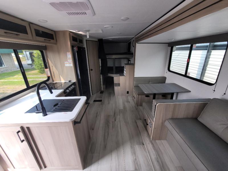 If you're needing additional sleeping space and added comfort in your next RV, this travel trailer is the one! There are double-size bunks with steps in the back for your guests or little ones, and the full bath includes one of the dual entry doors to the unit for added convenience. The combined kitchen and living area is made spacious thanks to the large slide out which houses the sofa and booth dinette. You can make meals on the three burner range or in the air fryer/convection microwave, and there is a 16 cu. ft. 12V refrigerator to keep food fresh. A 50" TV and fireplace features hidden shelves behind it for smart storage space plus there is an entryway pantry for snacks galore! Outside, the 21' power awning will provide shade as you visit in your camp chairs, and there is a 2.6 cu. ft. outdoor refrigerator to keep cold drinks on hand!