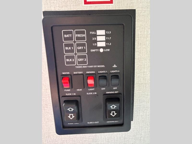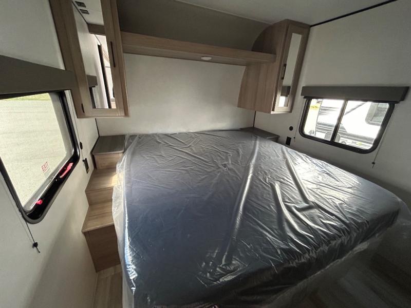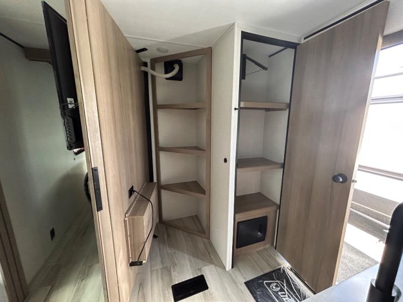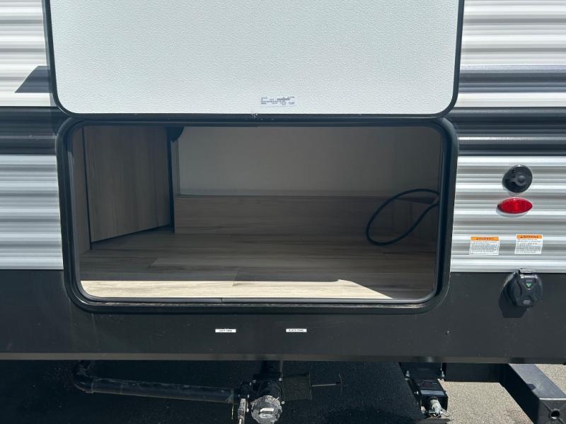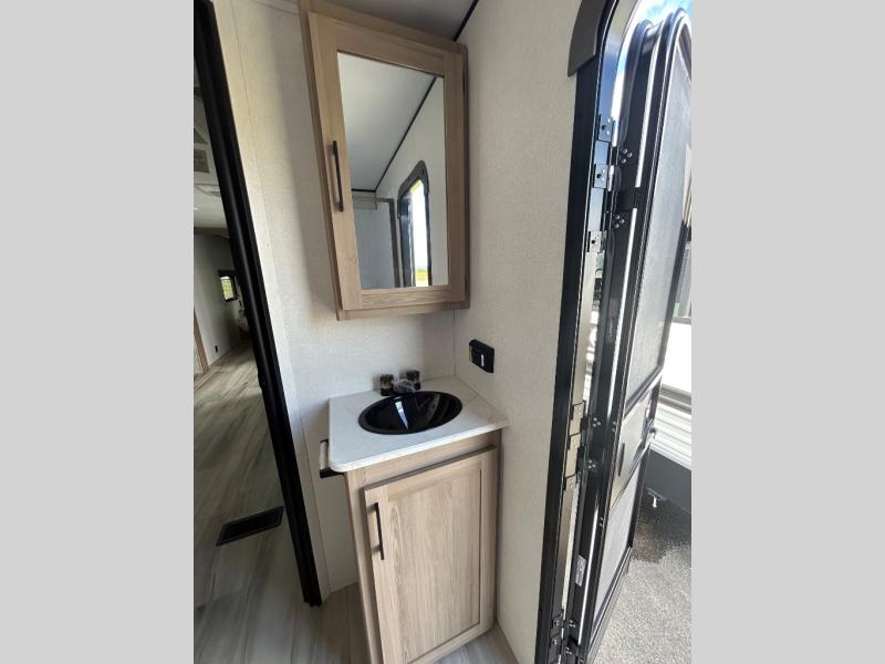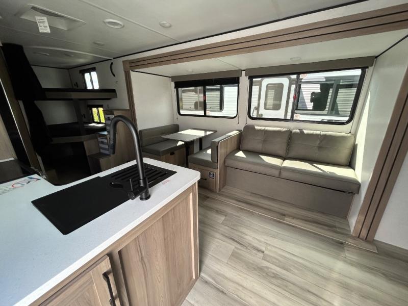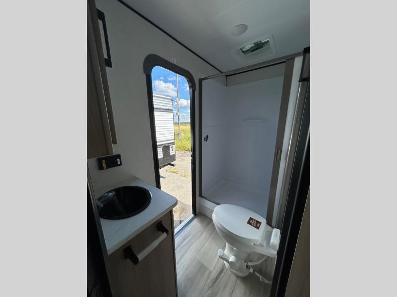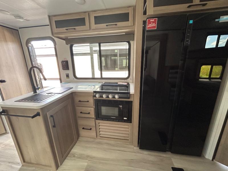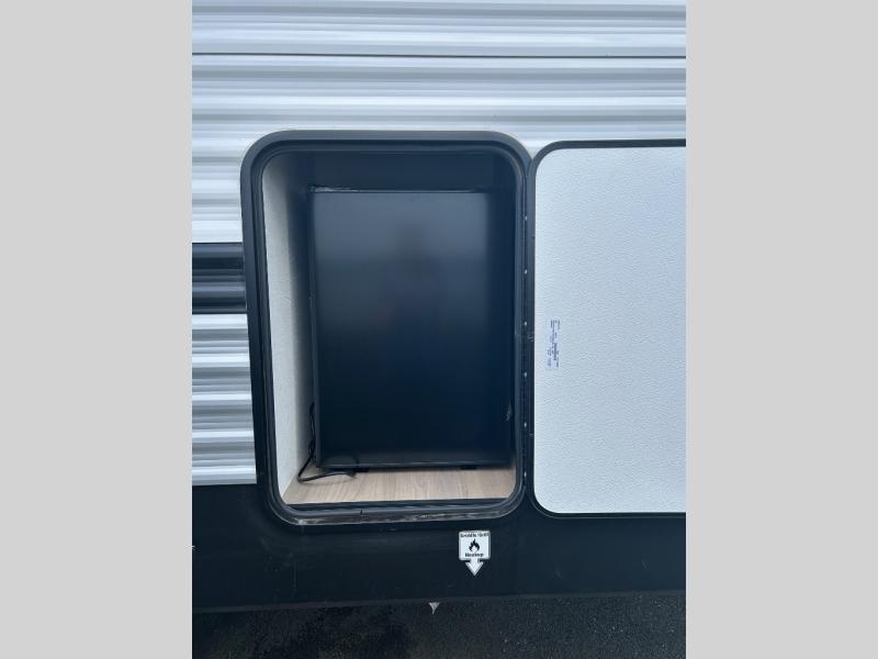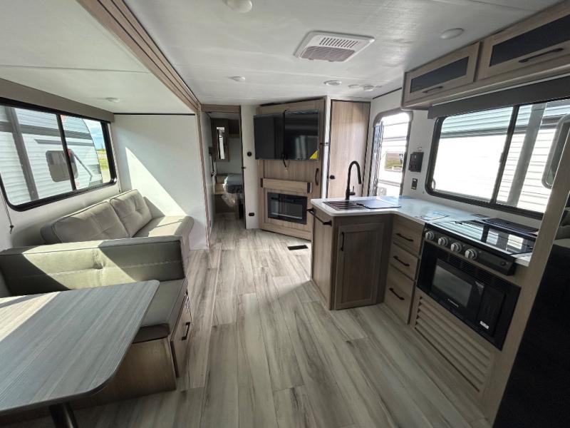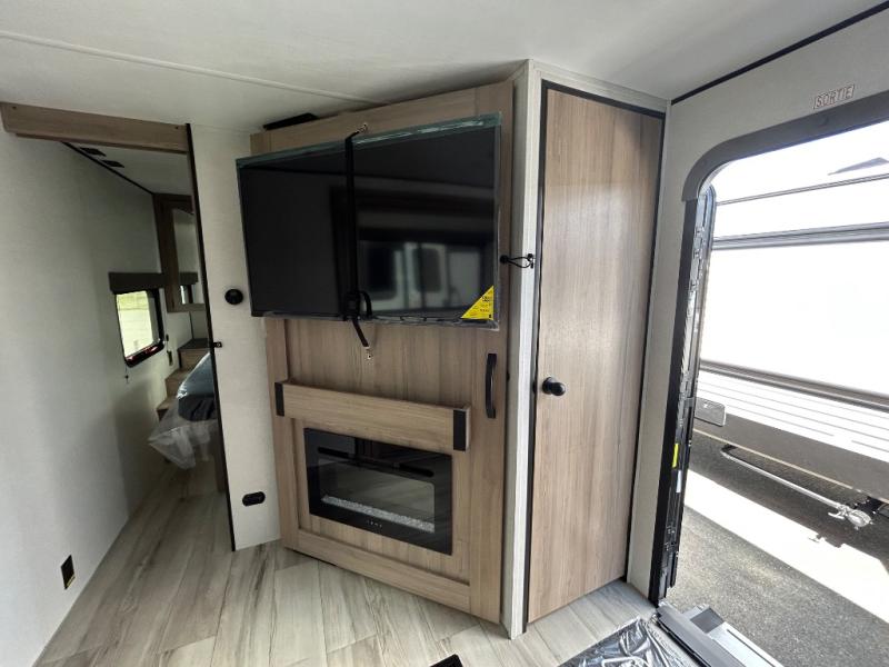 If you're needing additional sleeping space and added comfort in your next RV, this travel trailer is the one! There are double-size bunks with steps in the back for your guests or little ones, and the full bath includes one of the dual entry doors to the unit for added convenience. The combined kitchen and living area is made spacious thanks to the large slide out which houses the sofa and booth dinette. You can make meals on the three burner range or in the air fryer/convection microwave, and there is a 16 cu. ft. 12V refrigerator to keep food fresh. A 50" TV and fireplace features hidden shelves behind it for smart storage space plus there is an entryway pantry for snacks galore! Outside, the 21' power awning will provide shade as you visit in your camp chairs, and there is a 2.6 cu. ft. outdoor refrigerator to keep cold drinks on hand!