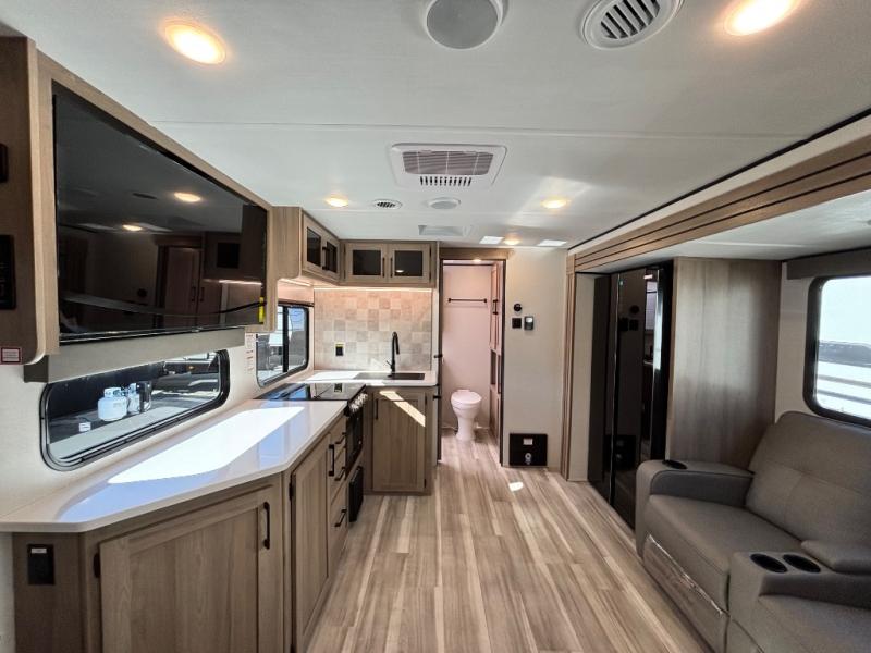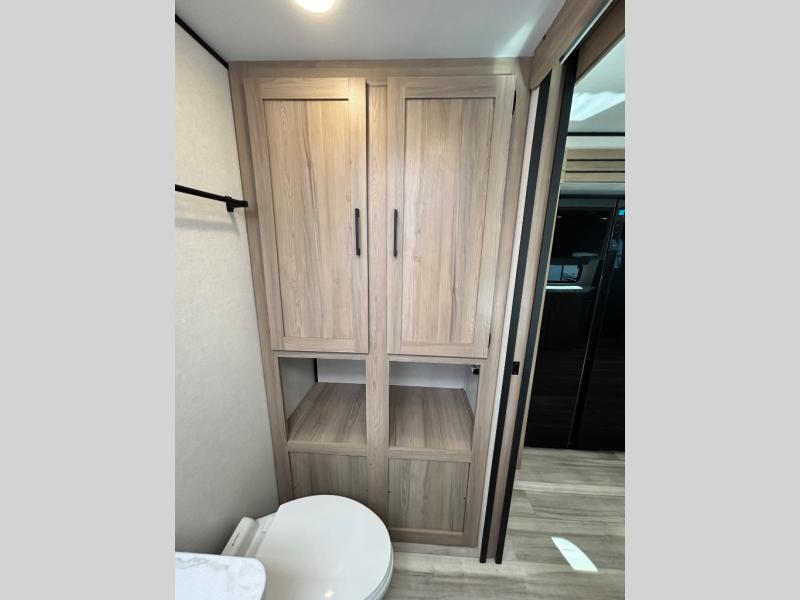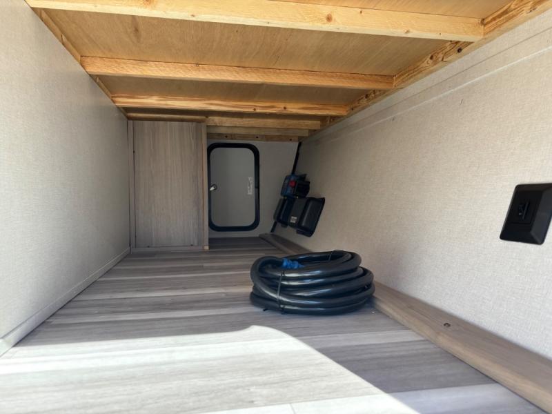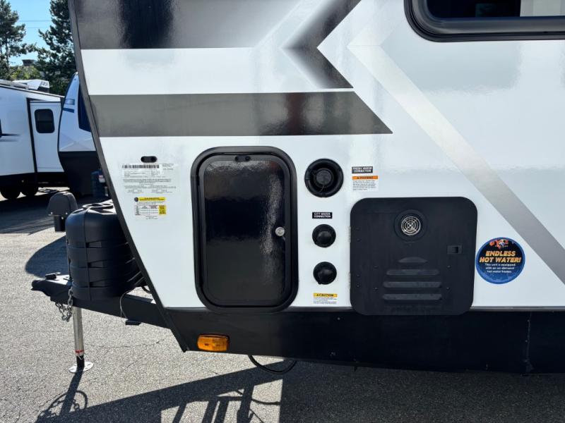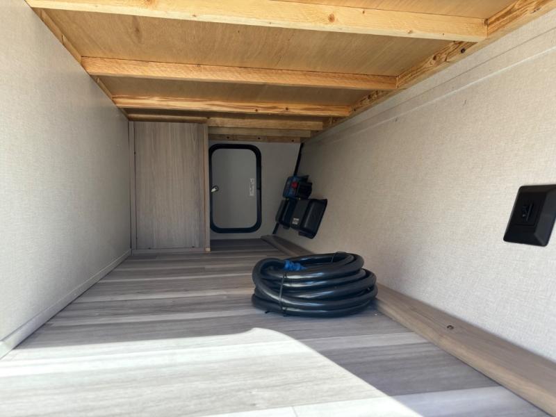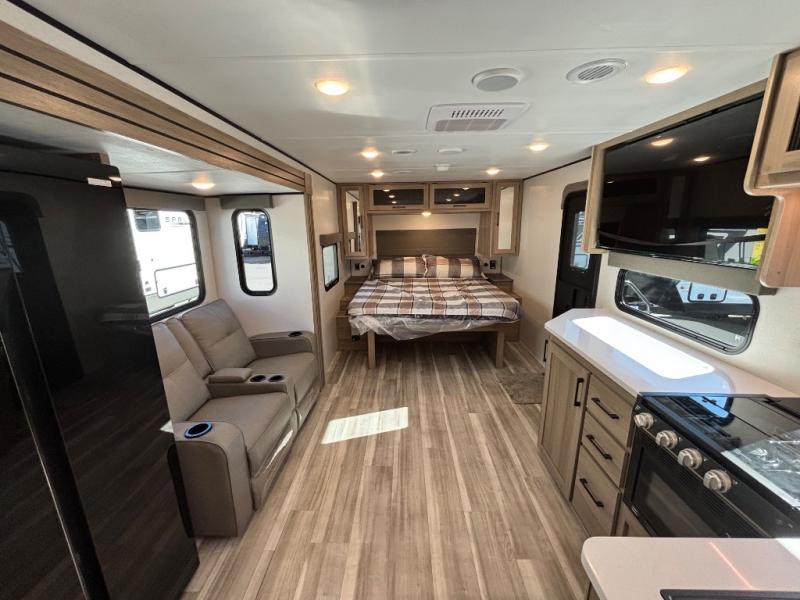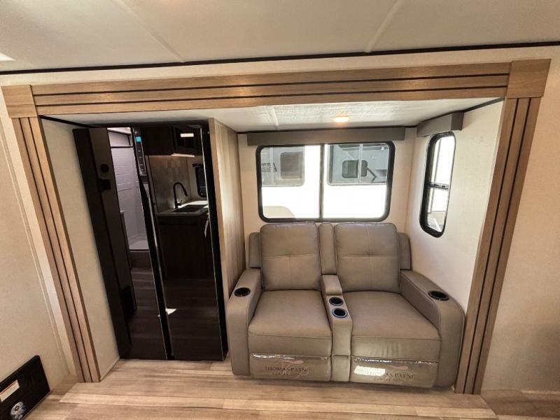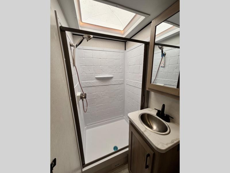 You can't go wrong with this couple's trailer! Once you arrive at the campground, you can unload the pass-through storage, then put out the 16' power awning and relax in your camp chairs. The theater seating with a removable table provides a place to relax inside if the weather isn't cooperating, and there is a 50" TV if you want to stay indoors all day and watch movies! You can make lunch on the three burner cooktop or in the air fryer/convection microwave when you get hungry, and there is a 16 cu. ft. 12V refrigerator to keep cold items fresh. The full rear bath includes a 30" x 40" spacious shower, a large linen closet, and a medicine cabinet to name a few comforts!