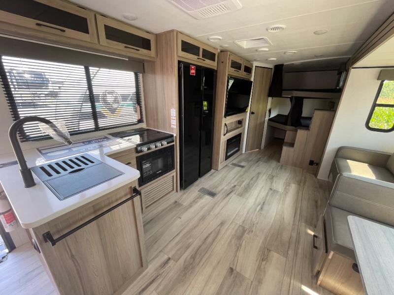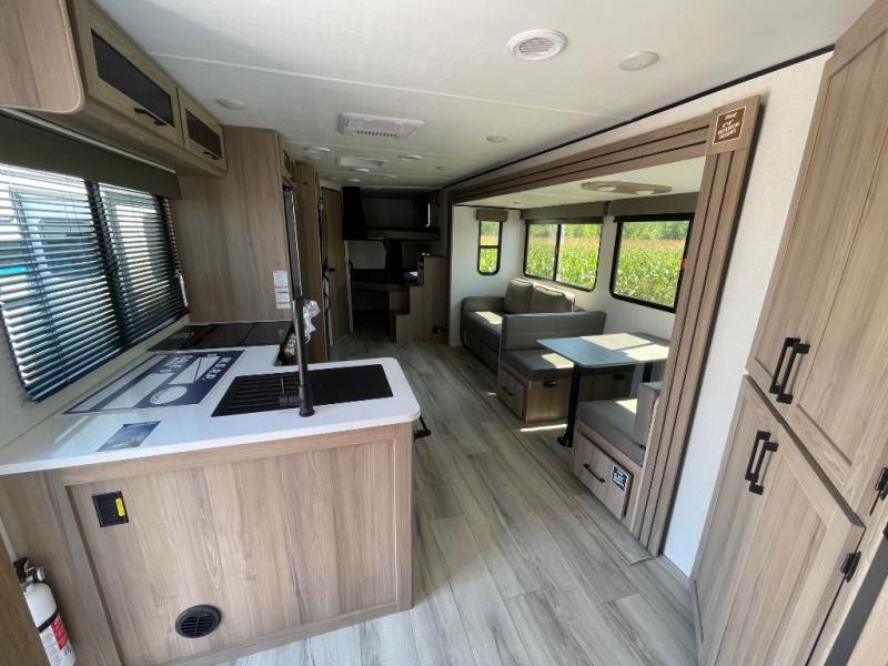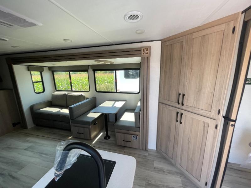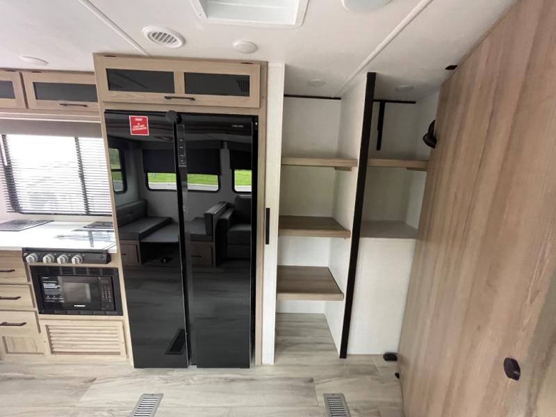 With dual entry doors in this travel trailer, you can enter in through the main living area or the full bath for added convenience. After you've unloaded the pass-through storage, you can put out the 21' power awning and take a load off in your camp chairs. Inside, the large super slide will give your crew more space to relax on the sofa, dine at the booth dinette, or cook in the full kitchen. There is a three burner cooktop here, along with an air fryer/convection microwave, and a 16 cu. ft. 12V refrigerator. The pivoting entertainment center includes a 50" TV, and there is a hidden pantry behind the TV for smart storage solutions. When it's time to call it a night, there is a king bed in the front private bedroom plus double-size bunks in the back for guests!
