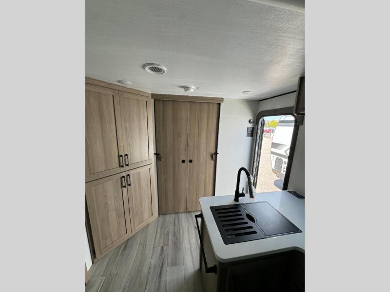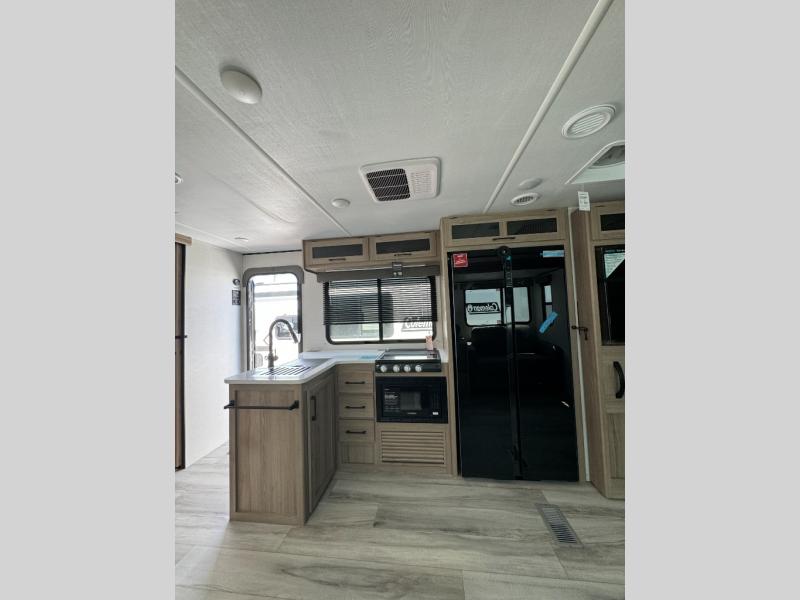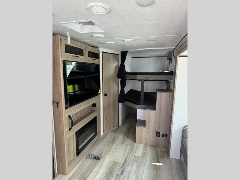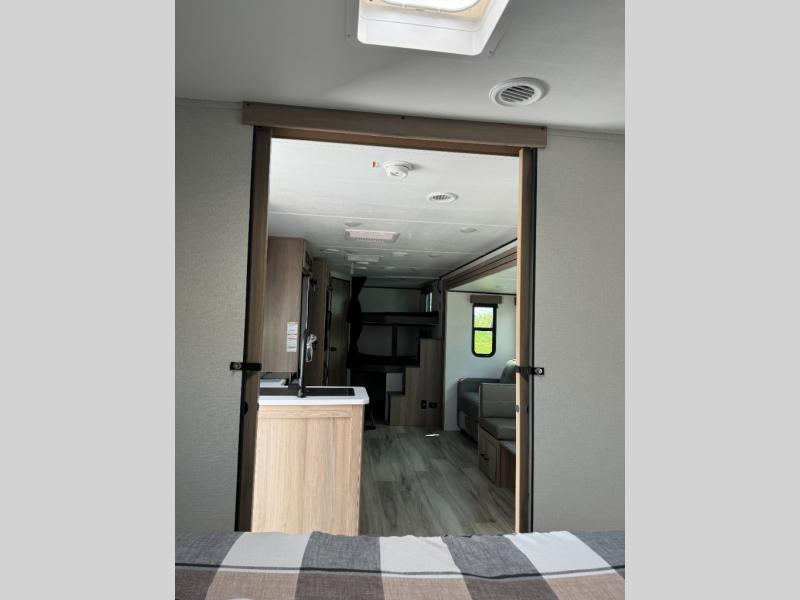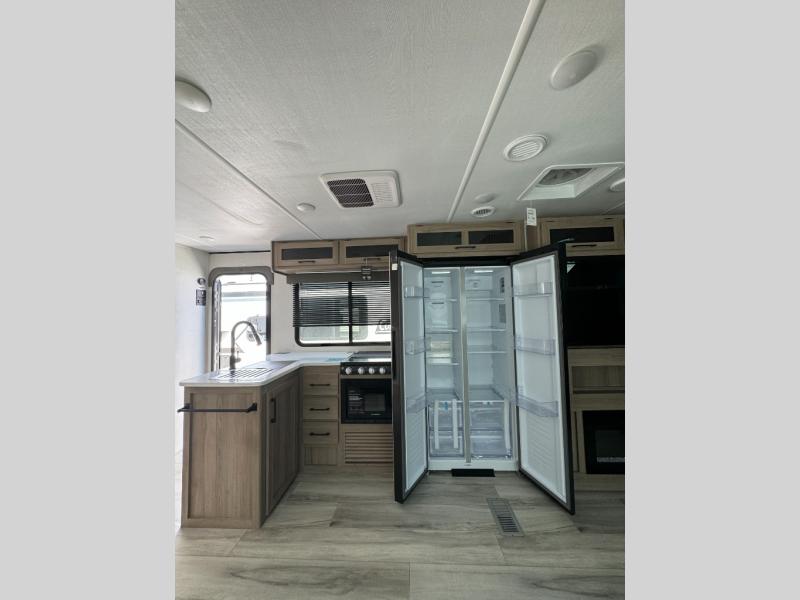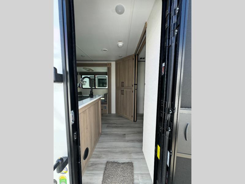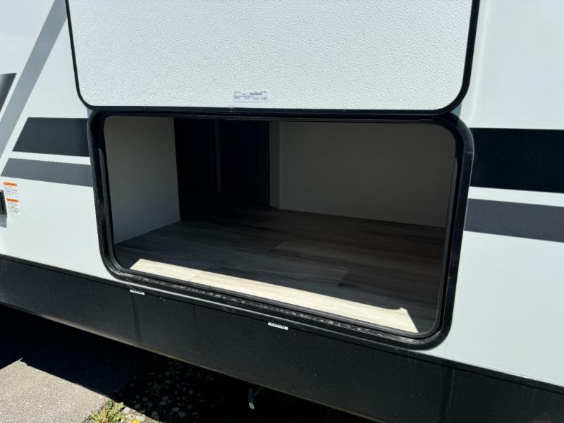 With dual entry doors in this travel trailer, you can enter in through the main living area or the full bath for added convenience. After you've unloaded the pass-through storage, you can put out the 21' power awning and take a load off in your camp chairs. Inside, the large super slide will give your crew more space to relax on the sofa, dine at the booth dinette, or cook in the full kitchen. There is a three burner cooktop here, along with an air fryer/convection microwave, and a 16 cu. ft. 12V refrigerator. The pivoting entertainment center includes a 50" TV, and there is a hidden pantry behind the TV for smart storage solutions. When it's time to call it a night, there is a king bed in the front private bedroom plus double-size bunks in the back for guests!