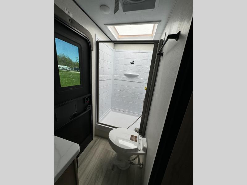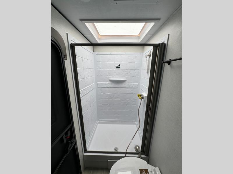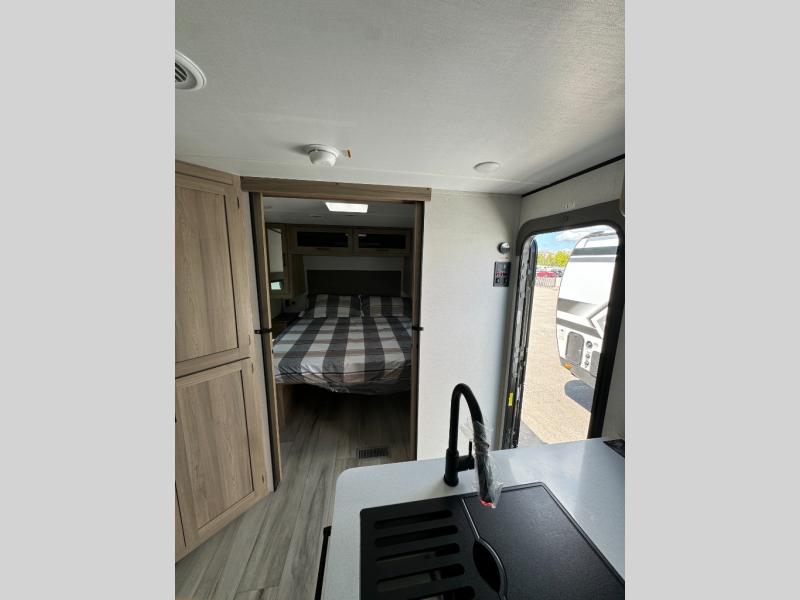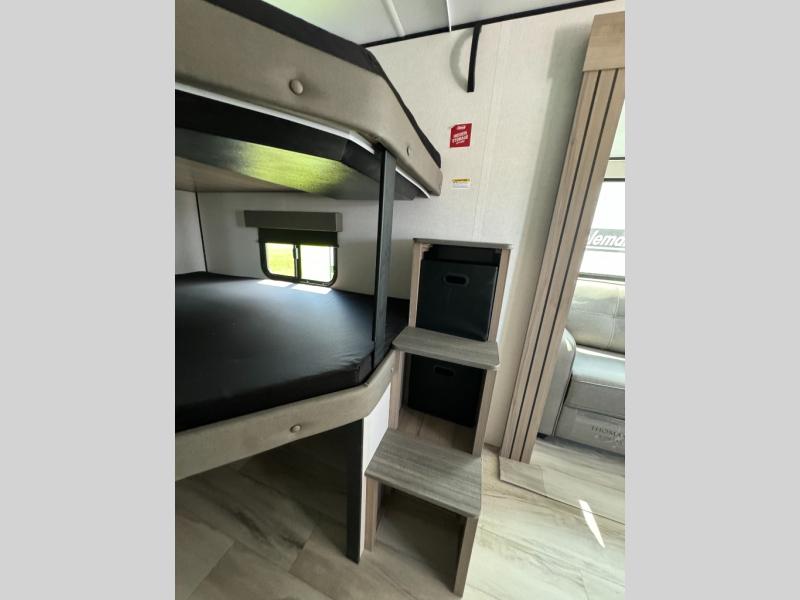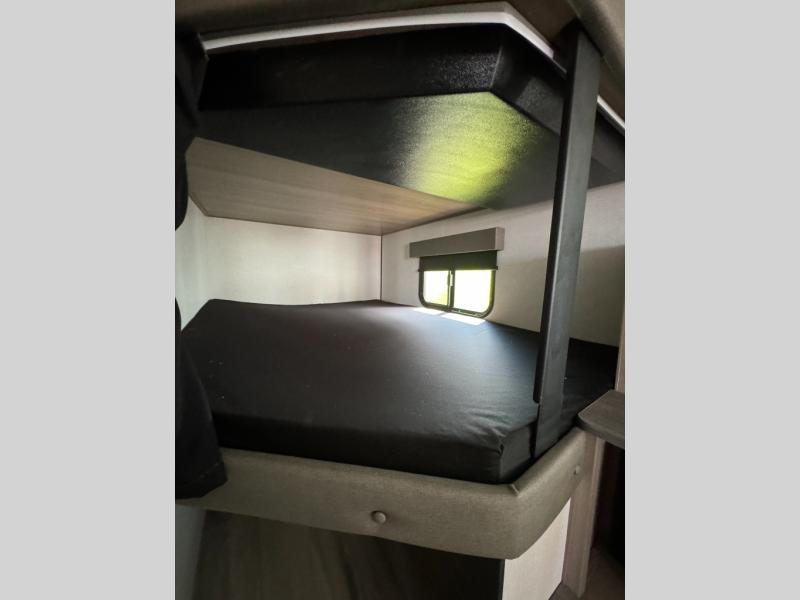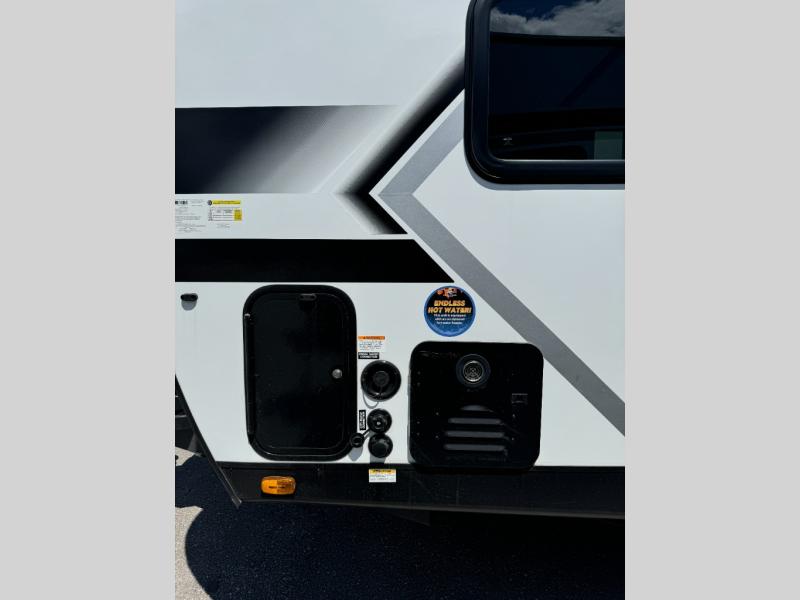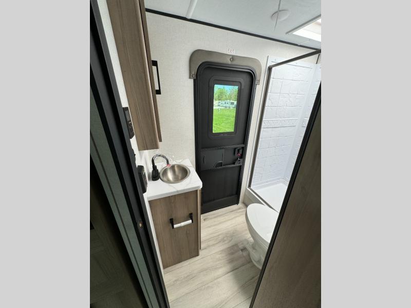 With dual entry doors in this travel trailer, you can enter in through the main living area or the full bath for added convenience. After you've unloaded the pass-through storage, you can put out the 21' power awning and take a load off in your camp chairs. Inside, the large super slide will give your crew more space to relax on the sofa, dine at the booth dinette, or cook in the full kitchen. There is a three burner cooktop here, along with an air fryer/convection microwave, and a 16 cu. ft. 12V refrigerator. The pivoting entertainment center includes a 50" TV, and there is a hidden pantry behind the TV for smart storage solutions. When it's time to call it a night, there is a king bed in the front private bedroom plus double-size bunks in the back for guests!