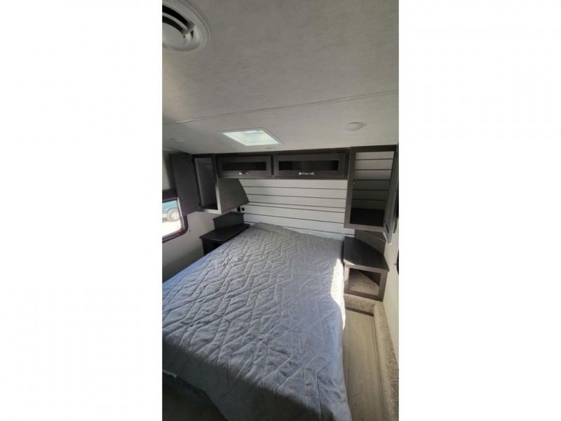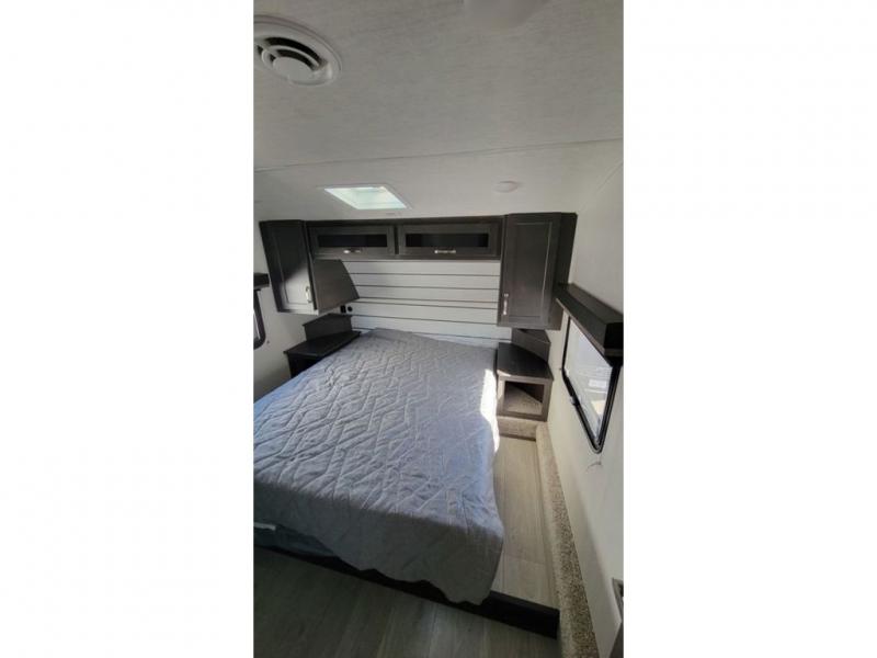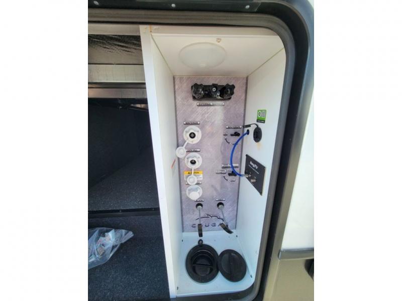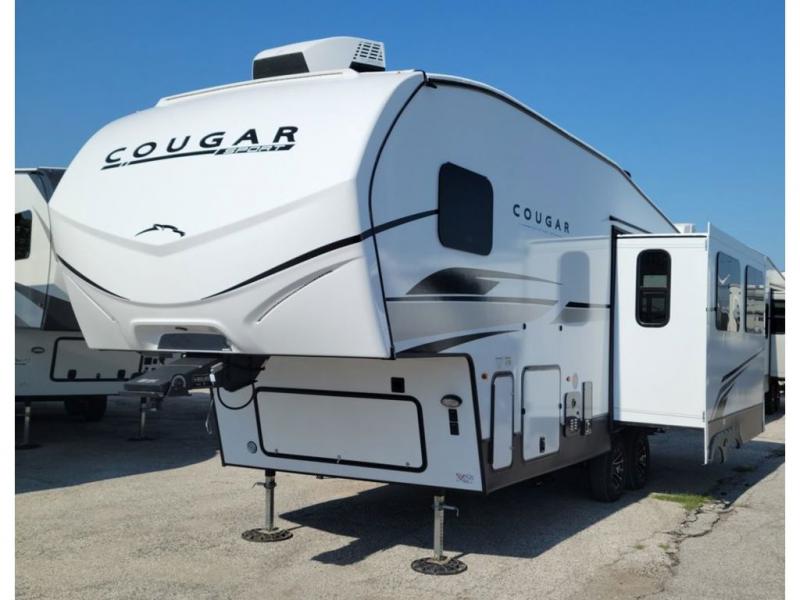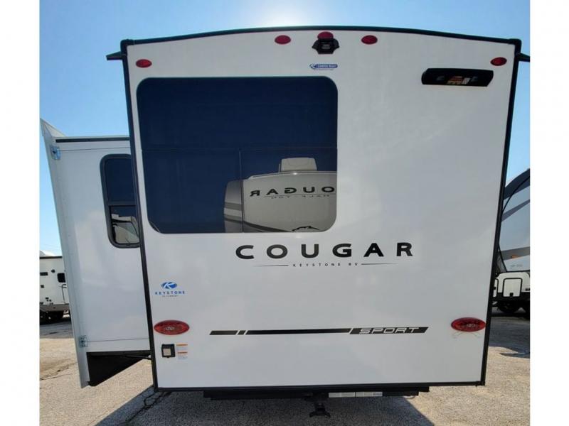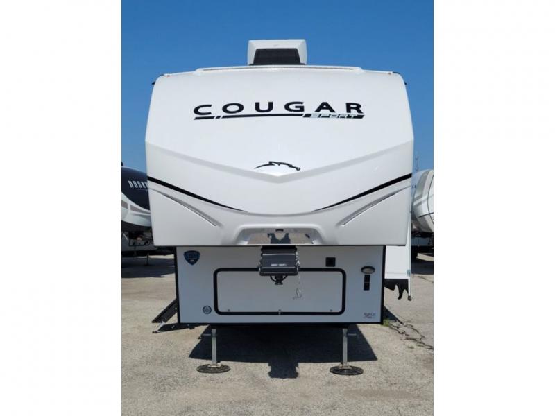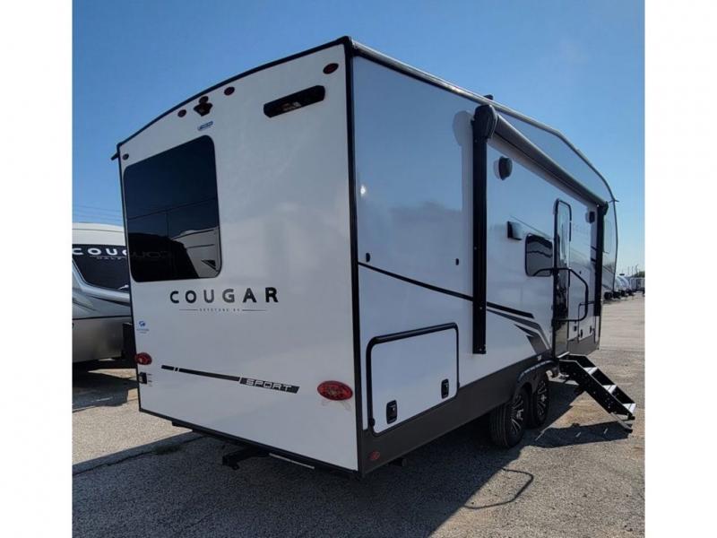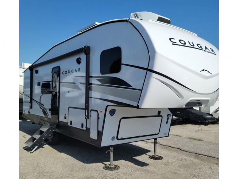The Cougar Sport structural I-beam frame with stamped steel cross-members and outriggers, plus its laminated sidewalls with five-sided aluminum superstructure and Alpha Super Flex roof membrane are what active RVers love about the construction of the Cougar line. The Cougar Sport models are no exception when it comes to a great package, as well as being smaller and lighter weight than their big brother Cougar models. A one-piece, heated and enclosed polypropylene underbelly means a longer camping season. On the inside, residential shaker style hardwood cabinet doors and decorative crown molding, plus seamless pressed countertops and an on-demand water heater will make your unit feel even more like home. You are also sure to appreciate the shiplap style decorative accent wall behind the bed, a porcelain foot flush toilet in the bathroom, plus residential kitchen hardware, and so much more.
