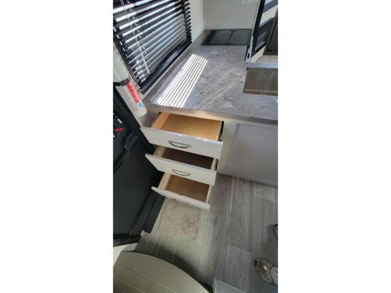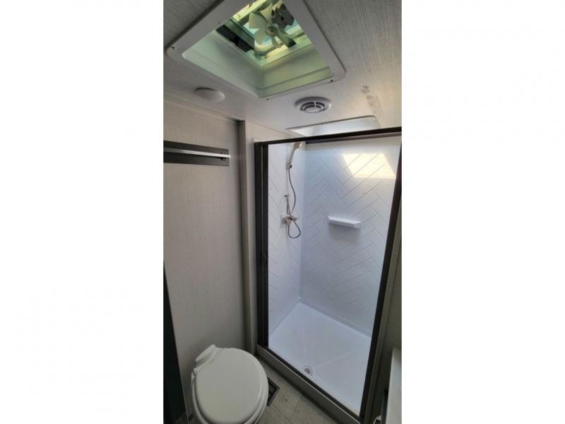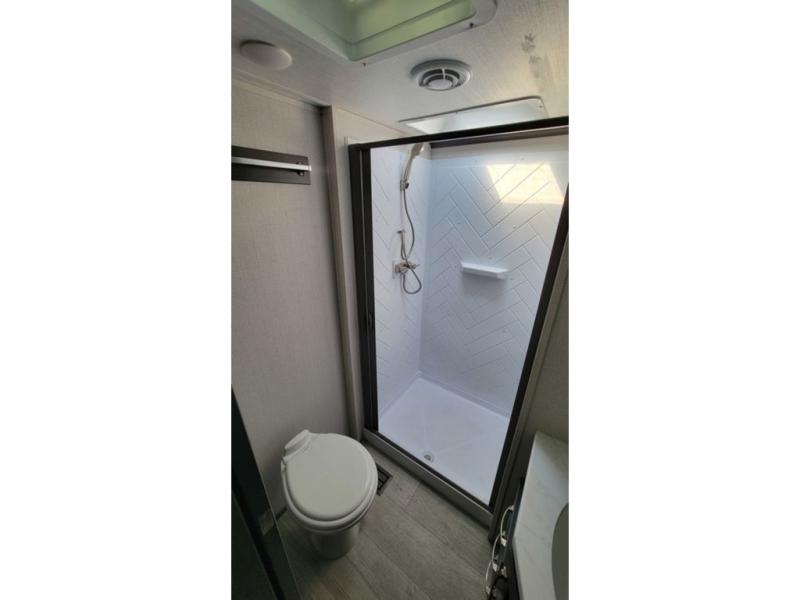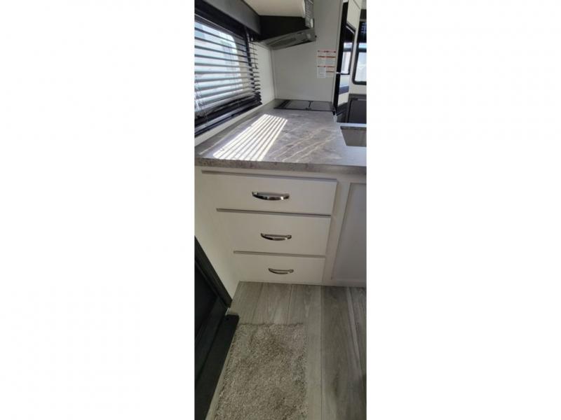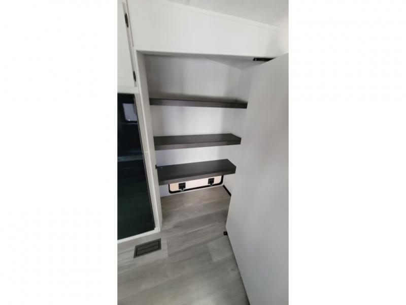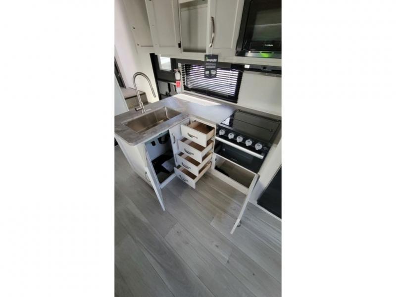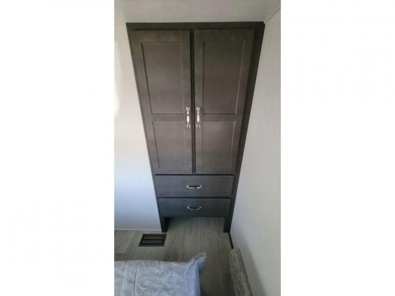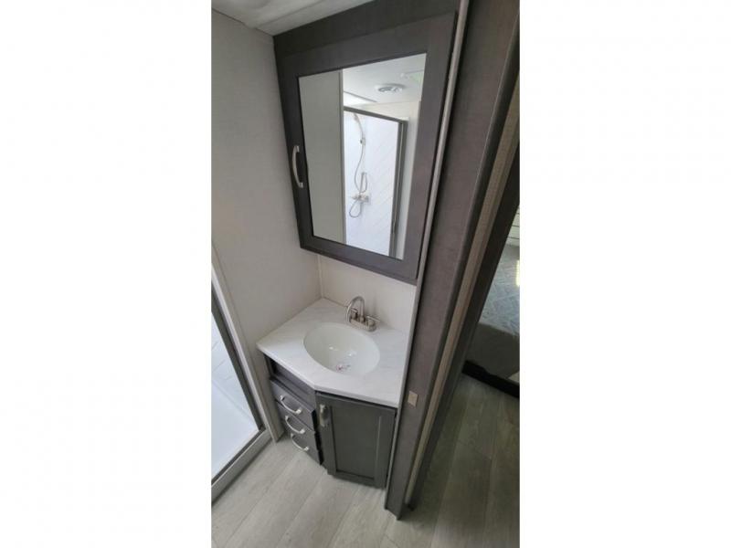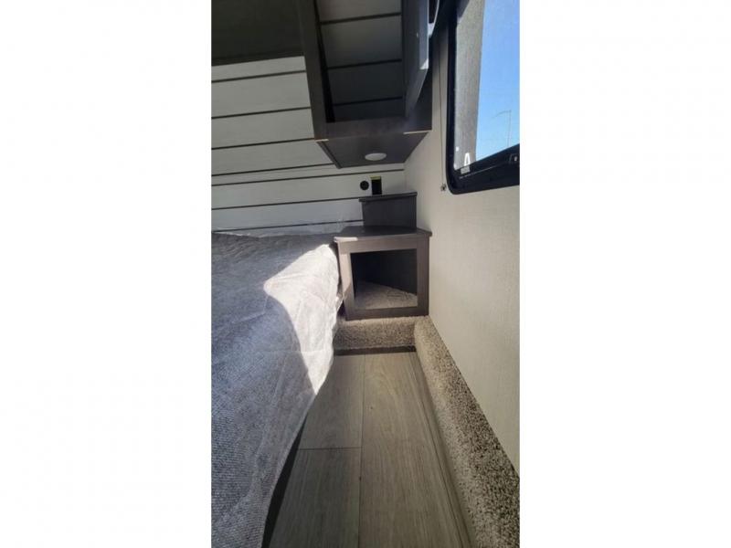 The Cougar Sport structural I-beam frame with stamped steel cross-members and outriggers, plus its laminated sidewalls with five-sided aluminum superstructure and Alpha Super Flex roof membrane are what active RVers love about the construction of the Cougar line. The Cougar Sport models are no exception when it comes to a great package, as well as being smaller and lighter weight than their big brother Cougar models. A one-piece, heated and enclosed polypropylene underbelly means a longer camping season. On the inside, residential shaker style hardwood cabinet doors and decorative crown molding, plus seamless pressed countertops and an on-demand water heater will make your unit feel even more like home. You are also sure to appreciate the shiplap style decorative accent wall behind the bed, a porcelain foot flush toilet in the bathroom, plus residential kitchen hardware, and so much more.