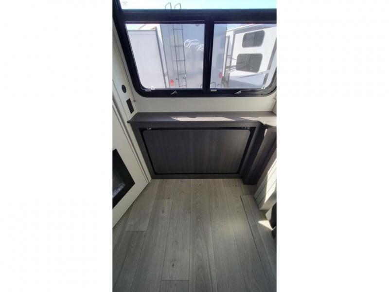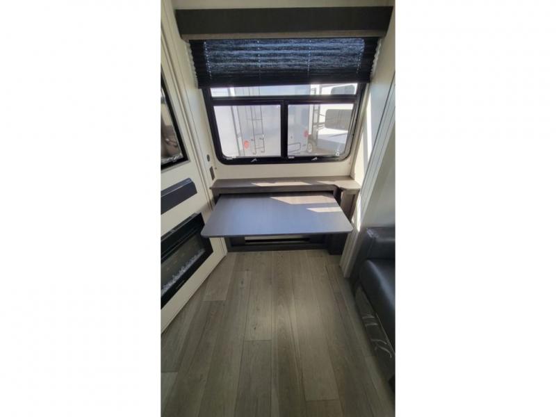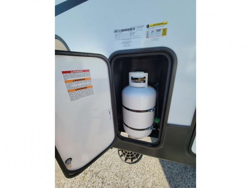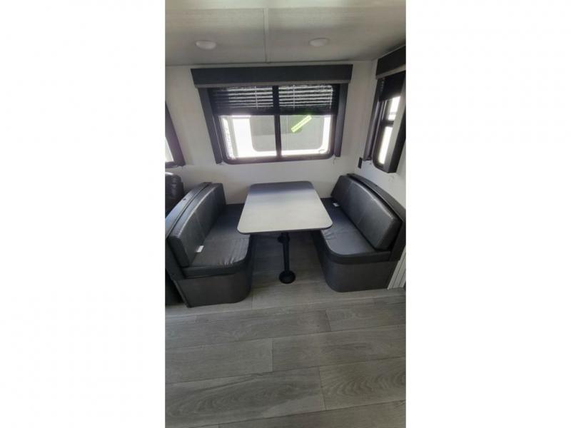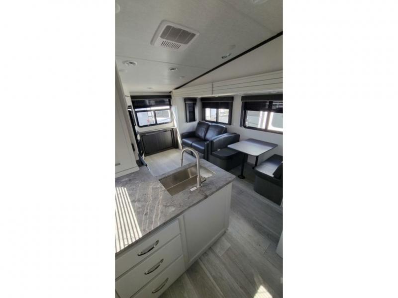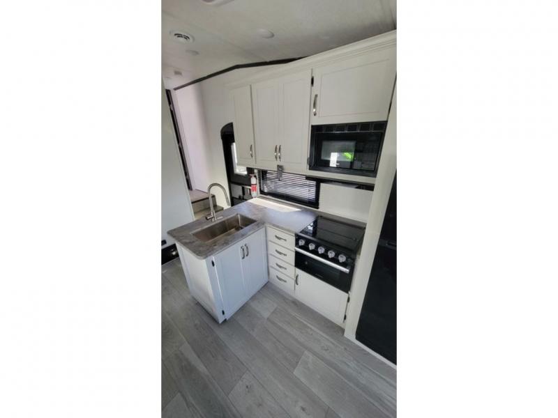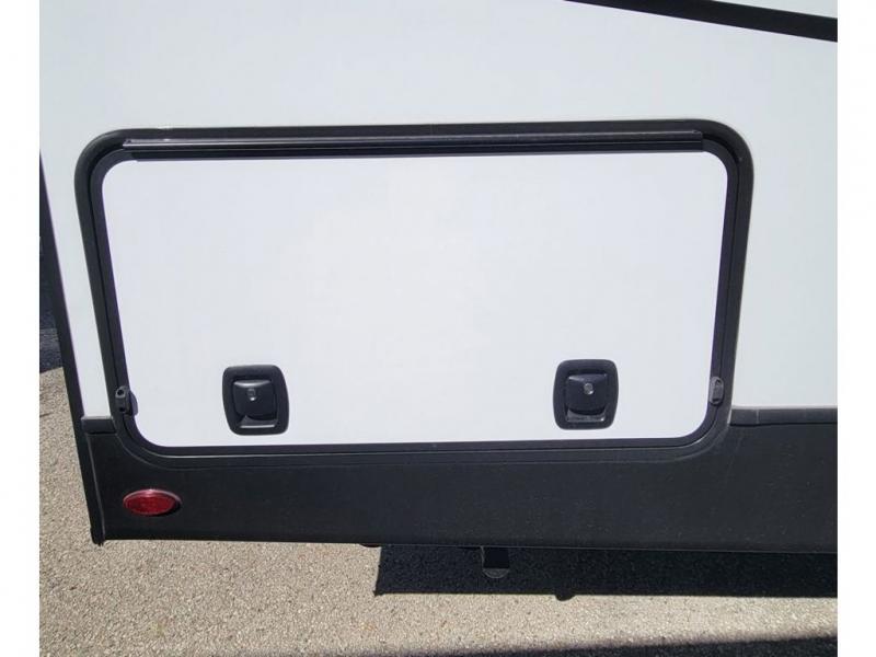 This lightweight fifth wheel is big enough for your small family to camp together! Enter to find a convenient combined kitchen and living space with large slide for added space. The slide features theater seating and a booth dinette which offers ample seating for meals and hanging out. There is a flip up table along the rear wall with a nearby 40" LED TV which features a butler pantry behind. Head up the steps to the right of the entry door to a complete bath and private front bedroom featuring a queen size bed with dual shirt wardrobes and nightstands on both sides of the bed. The bathroom offers a shower with a skylight for added headroom and natural lighting. Outside, a 16' awning provides added living space protected from the elements!