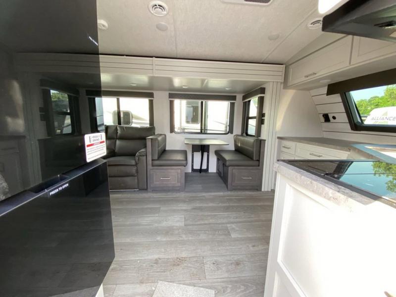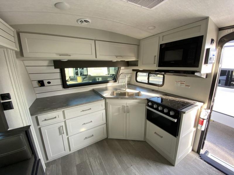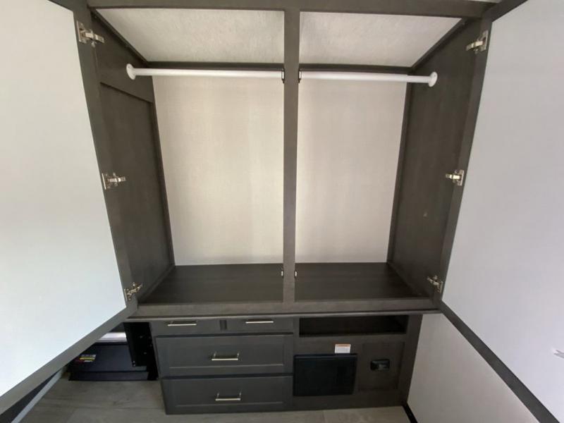 With a queen-size bed and a king bed option, this Cougar Half-Ton travel trailer shows that you can still be comfortable even while you're away from home! The bed slides out to provide more walking around space and there is a wardrobe and dresser opposite near the private entry door. The main entry up front leads into a spacious combined kitchen and living area with the front kitchen offering plenty of counter space, a pantry, and overhead storage. There is a 12-volt refrigerator to the left of the entry door, and access to a walk-in second pantry is right around the corner from the swiveling entertainment center opposite a tri-fold sofa sleeper and booth dinette slide. This unit also features a full-width walk-thru bath giving you plenty of room to shower and change.