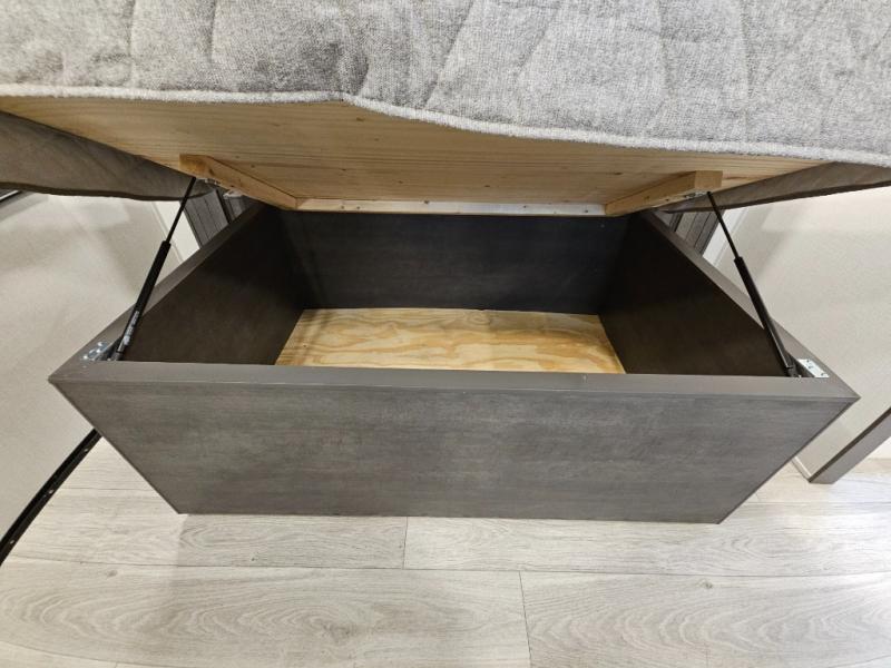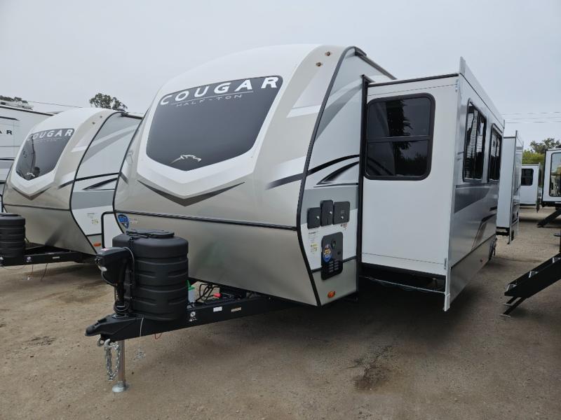 With a queen-size bed and a king bed option, this Cougar Half-Ton travel trailer shows that you can still be comfortable even while you're away from home! The bed slides out to provide more floor space and there is a wardrobe and dresser opposite near the private entry door. The main entry up front leads into a spacious combined kitchen and living area with the front kitchen offering plenty of counter space, a pantry, and overhead storage. There is a 12-volt refrigerator to the left of the entry door, and access to a walk-in second pantry is right around the corner from the pivoting entertainment center opposite a tri-fold sofa sleeper and booth dinette slide. This unit also features a full-width walk-thru bath giving you plenty of room to shower and change.
