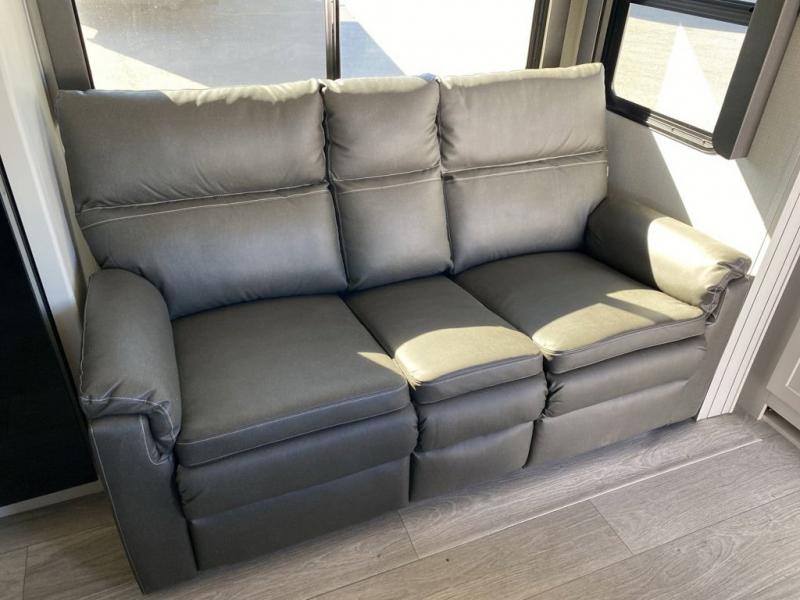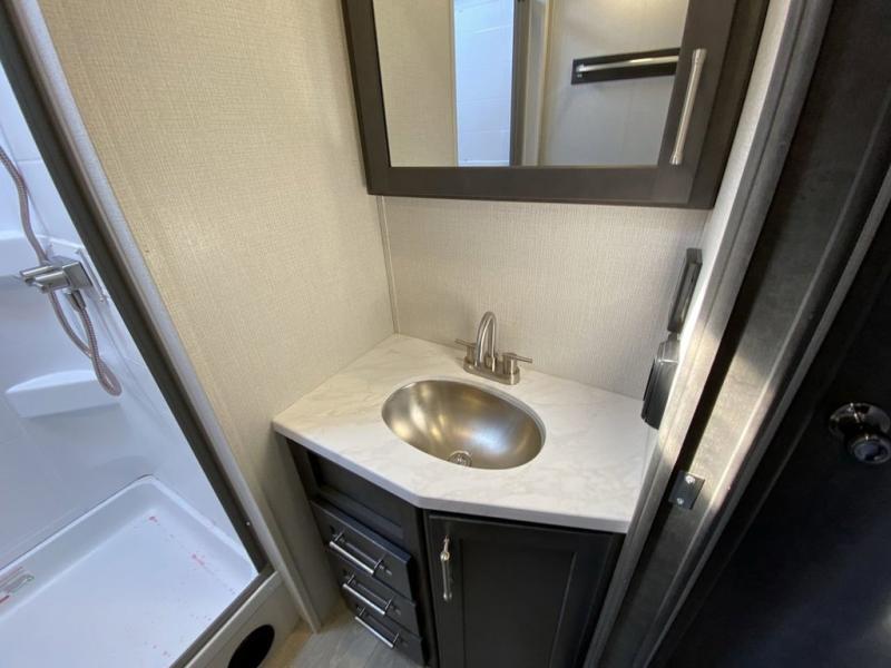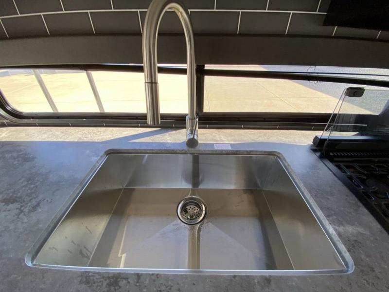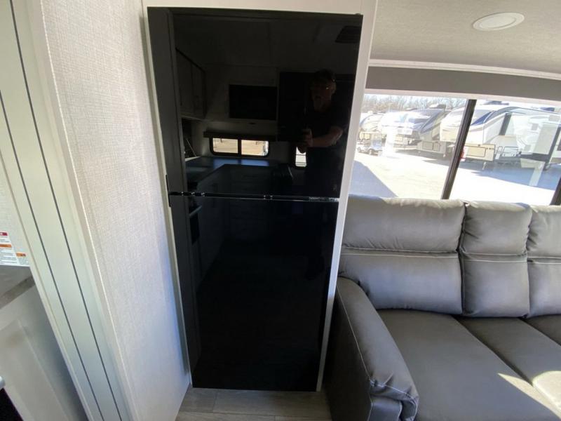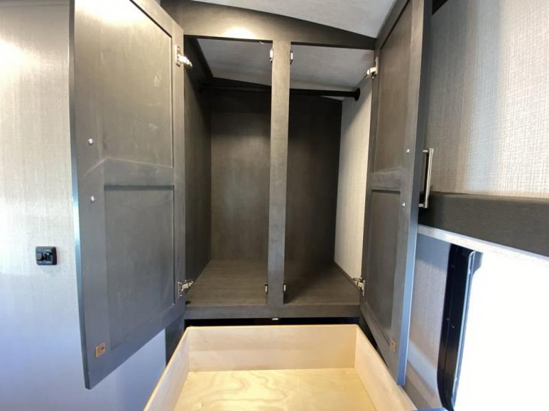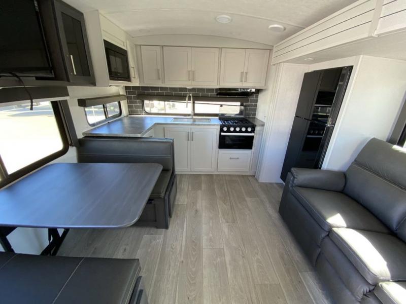 If you're ready for fun summers at the lake, make your adventures complete with this travel trailer in tow. The rear kitchen includes ample counter space to prep burgers, and you can take your preparations outside to cook on the outdoor kitchen! If the weather is nice, you might just want to eat outside too under the 18' power awning, or dine inside at the booth dinette. There is also a tri-fold sleeper sofa within the large slide out and an LED HDTV for movie nights. You'll find plenty of storage throughout, including a kitchen pantry, overhead cabinets, plus dual bedroom wardrobes on either side of the king bed!