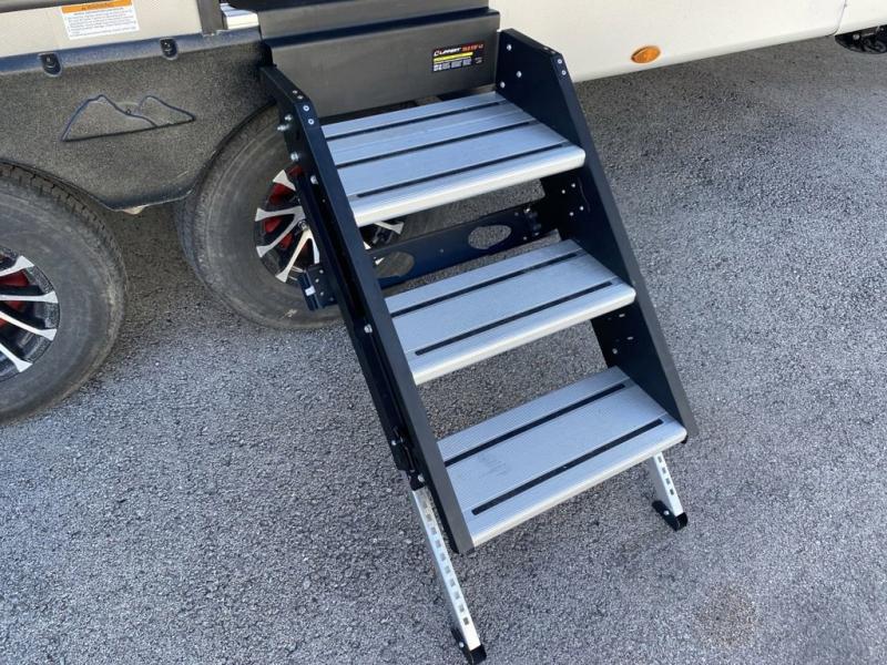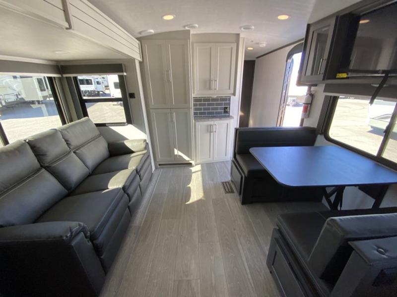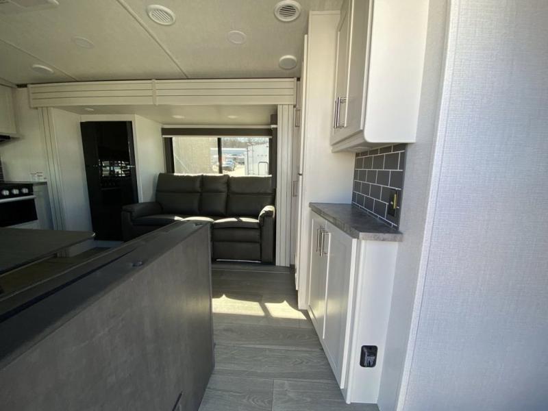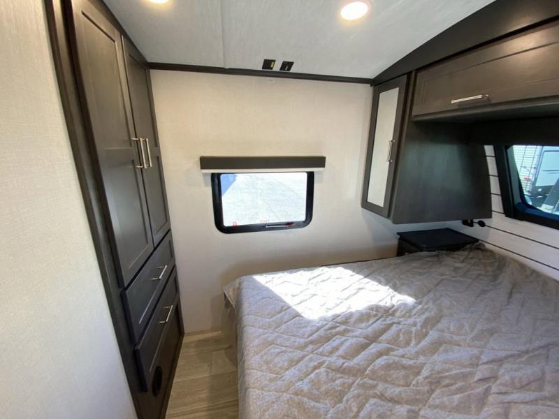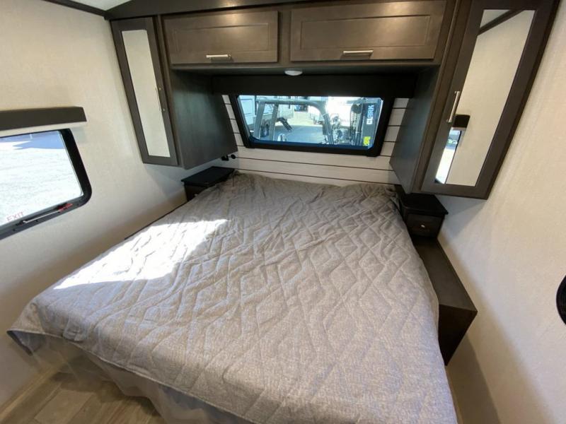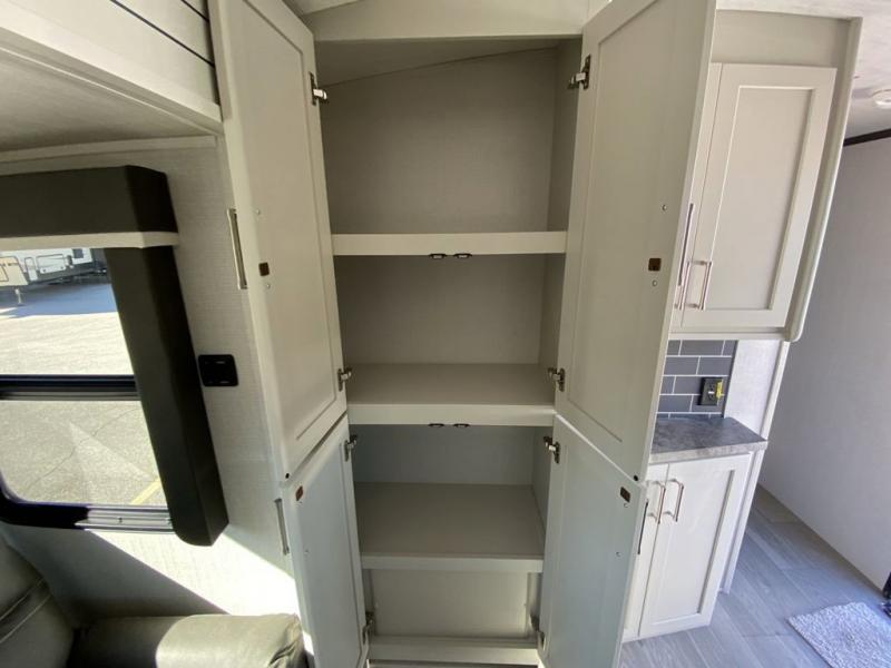 If you're ready for fun summers at the lake, make your adventures complete with this travel trailer in tow. The rear kitchen includes ample counter space to prep burgers, and you can take your preparations outside to cook on the outdoor kitchen! If the weather is nice, you might just want to eat outside too under the 18' power awning, or dine inside at the booth dinette. There is also a tri-fold sleeper sofa within the large slide out and an LED HDTV for movie nights. You'll find plenty of storage throughout, including a kitchen pantry, overhead cabinets, plus dual bedroom wardrobes on either side of the king bed!