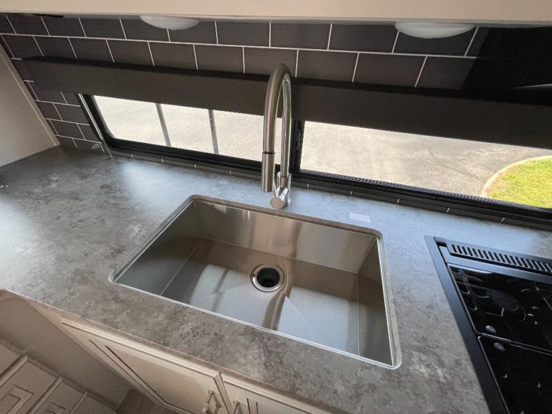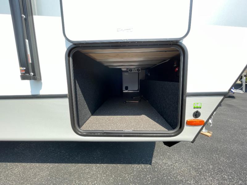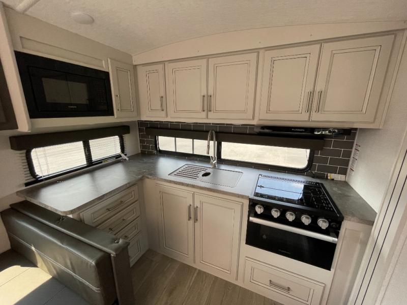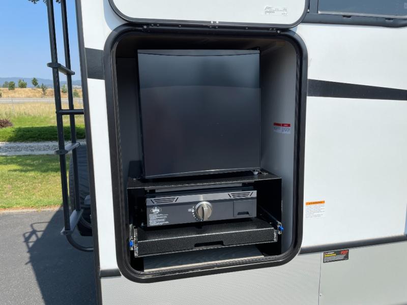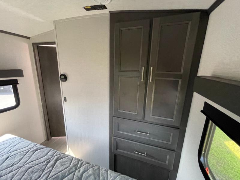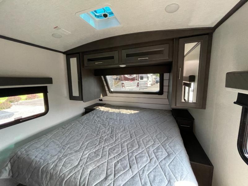 If you're ready for fun summers at the lake, make your adventures complete with this travel trailer in tow. The rear kitchen includes ample counter space to prep burgers, and you can take your preparations outside to cook on the outdoor kitchen! If the weather is nice, you might just want to eat outside too under the 18' power awning, or dine inside at the booth dinette. There is also a tri-fold sleeper sofa within the large slide out and an LED HDTV for movie nights. You'll find plenty of storage throughout, including a kitchen pantry, overhead cabinets, plus dual bedroom wardrobes on either side of the king bed!