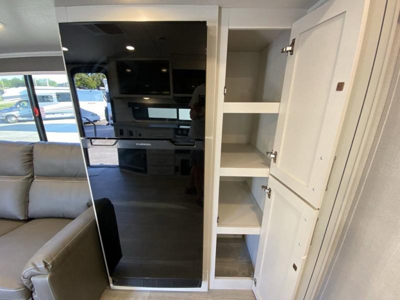 This Cougar Half-Ton travel trailer has an excellent dining area with its huge rear U-shaped dinette! Right next to the dinette is a large slide out that holds the 68" tri-fold sleeper sofa, 10.4 cu. ft. refrigerator, and a pantry. The kitchen has been excellently appointed with a Furrion range, seamless, pressed countertops, a stainless steel undermount sink, and a microwave, and you will be grateful that you can access both sides of the walk-through bathroom. The private bedroom is ultra convenient with its exterior entrance, king-size bed, and dual wardrobes and dual nightstands.