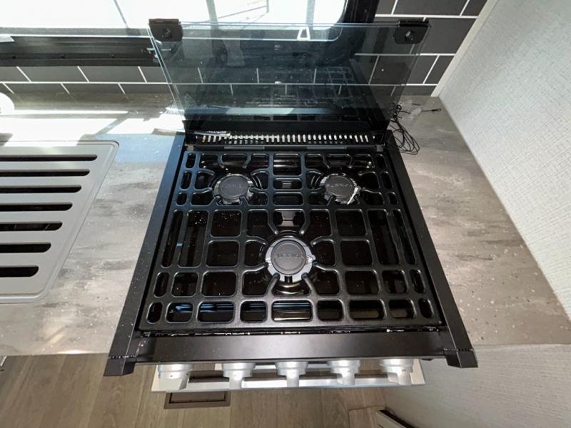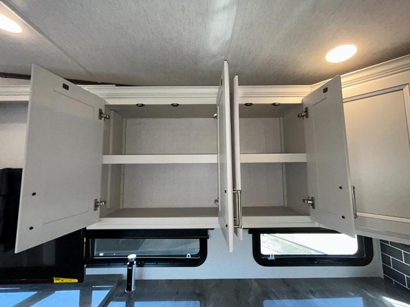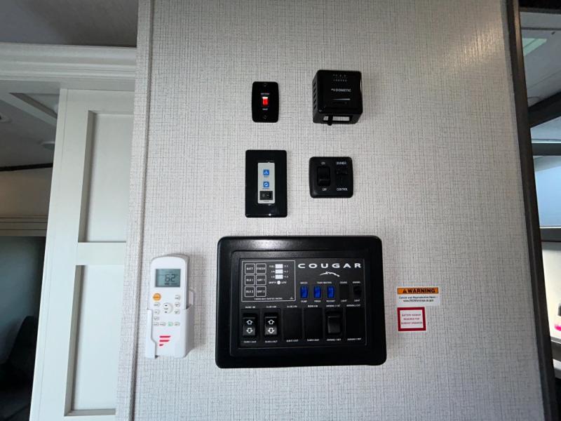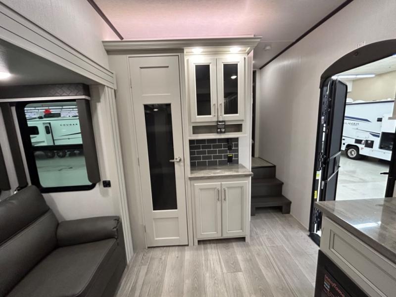 This fifth wheel is packed with premium features you won't want to camp without. You'll feel at home in the front private bedroom with its queen bed slide out with storage underneath, full-height wardrobe, plus a wardrobe with washer and dryer prep. There is even dresser with a sliding top with hidden storage for your valuables. If you have any guests, they can sleep on the tri-fold sleeper sofa within the living room slide, and there is a fireplace and LED HDTV here in perfect view for movie nights. This Cougar fifth wheel features a rear kitchen with tons of counter space, a convenient pull out trash can, and a high-rise chef's faucet and sprayer. The pull-out table in front of the fireplace will provide a place to dine at, or you can sit outdoors under the 20' power awning, and you'll also find an outside kitchen here the chef of your group is sure to love!