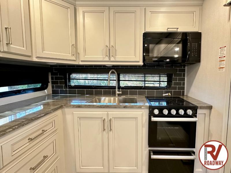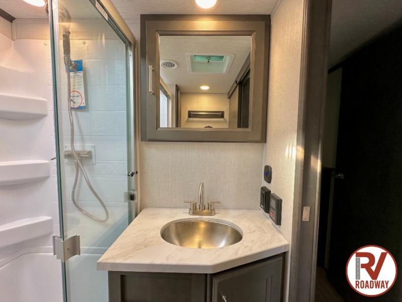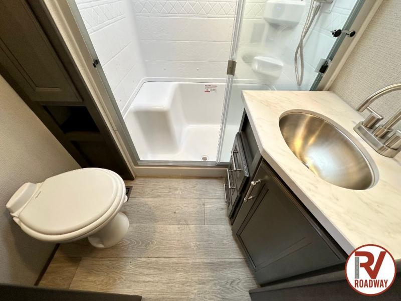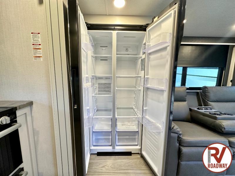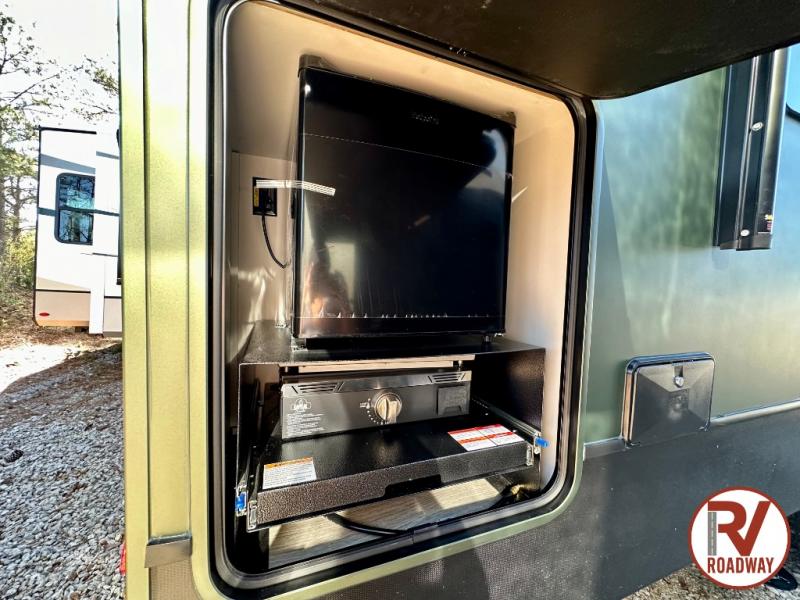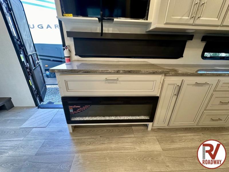 This fifth wheel is packed with premium features you won't want to camp without. You'll feel at home in the front private bedroom with its queen bed slide out with storage underneath, full-height wardrobe, plus a wardrobe with washer and dryer prep. There is even dresser with a sliding top with hidden storage for your valuables. If you have any guests, they can sleep on the tri-fold sleeper sofa within the living room slide, and there is a fireplace and LED HDTV here in perfect view for movie nights. This Cougar fifth wheel features a rear kitchen with tons of counter space, a convenient pull out trash can, and a high-rise chef's faucet and sprayer. The pull-out table in front of the fireplace will provide a place to dine at, or you can sit outdoors under the 20' power awning, and you'll also find an outside kitchen here the chef of your group is sure to love!