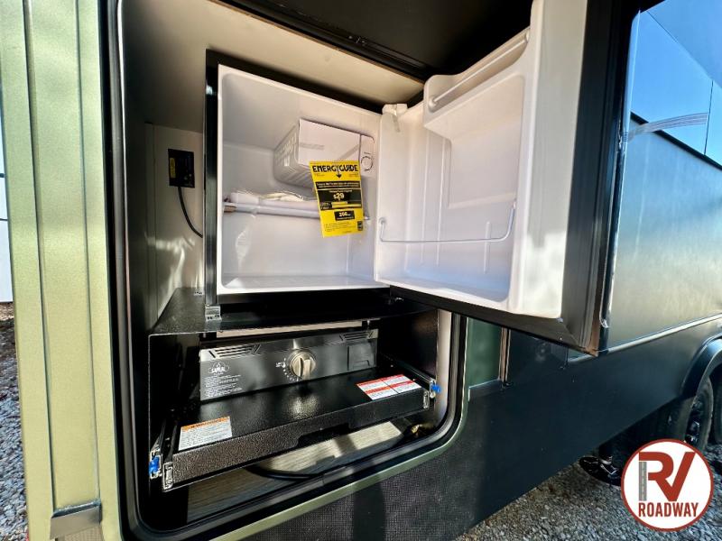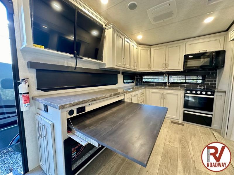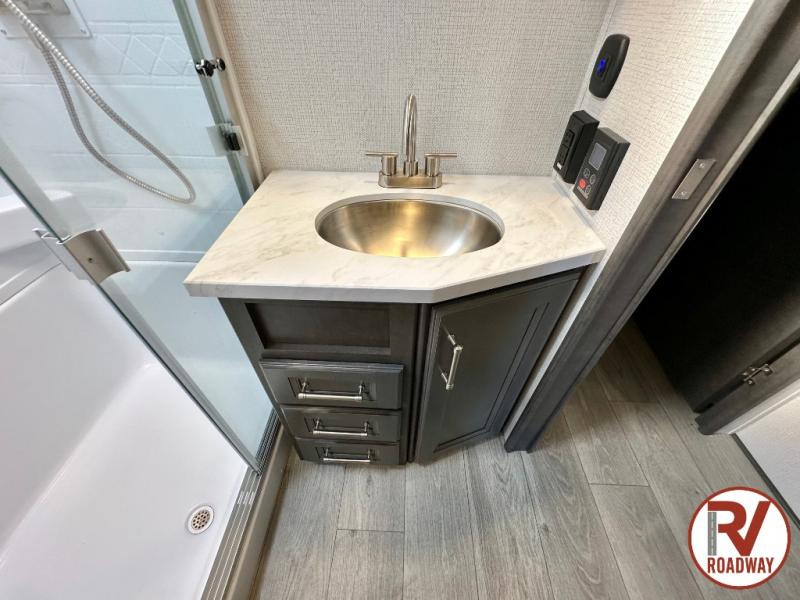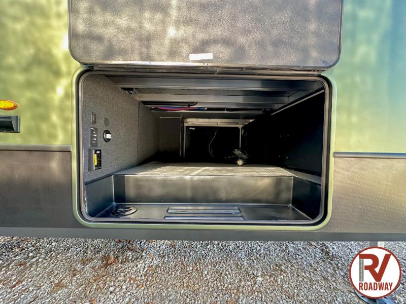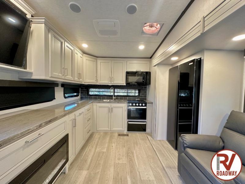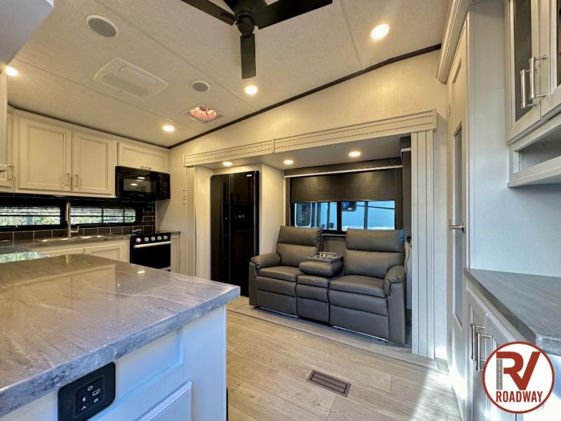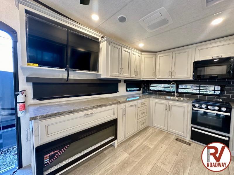 This fifth wheel is packed with premium features you won't want to camp without. You'll feel at home in the front private bedroom with its queen bed slide out with storage underneath, full-height wardrobe, plus a wardrobe with washer and dryer prep. There is even dresser with a sliding top with hidden storage for your valuables. If you have any guests, they can sleep on the tri-fold sleeper sofa within the living room slide, and there is a fireplace and LED HDTV here in perfect view for movie nights. This Cougar fifth wheel features a rear kitchen with tons of counter space, a convenient pull out trash can, and a high-rise chef's faucet and sprayer. The pull-out table in front of the fireplace will provide a place to dine at, or you can sit outdoors under the 20' power awning, and you'll also find an outside kitchen here the chef of your group is sure to love!