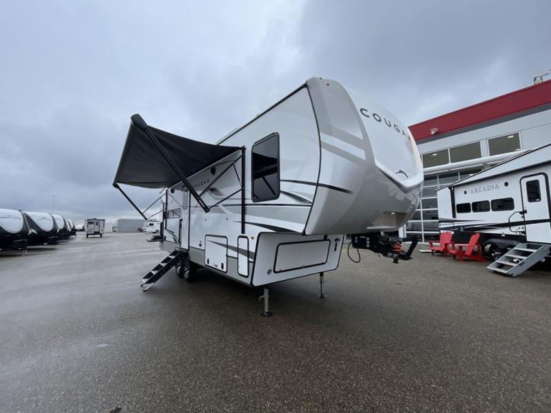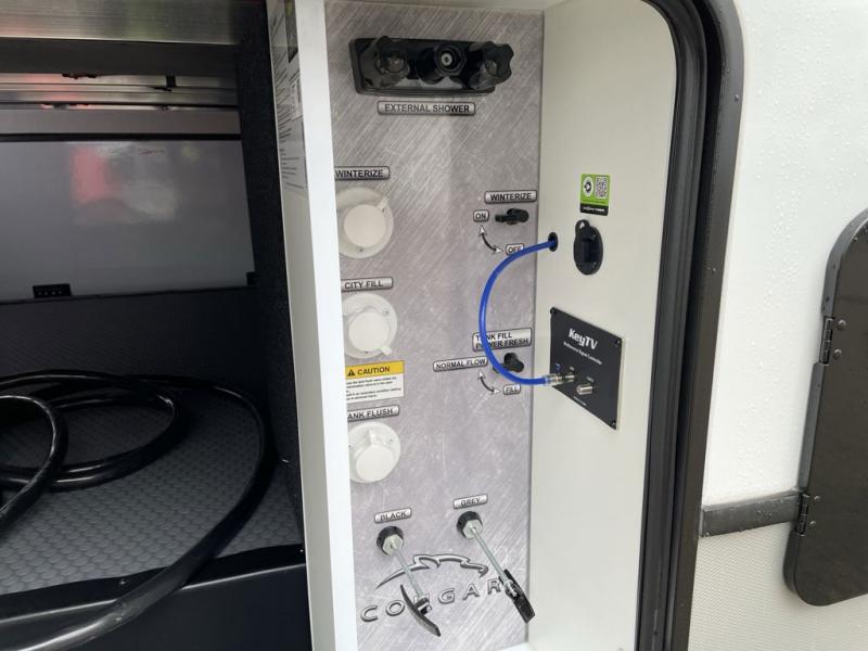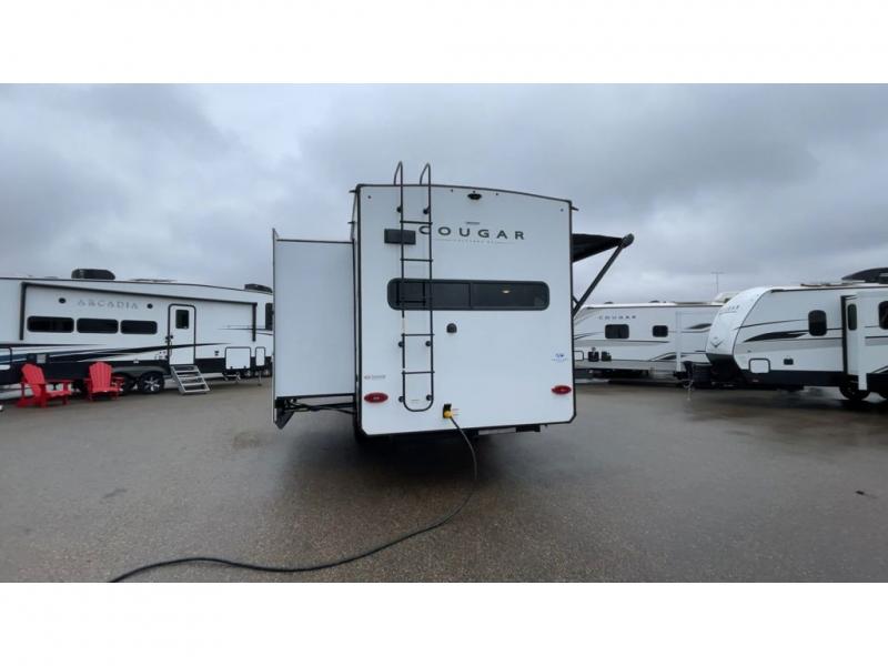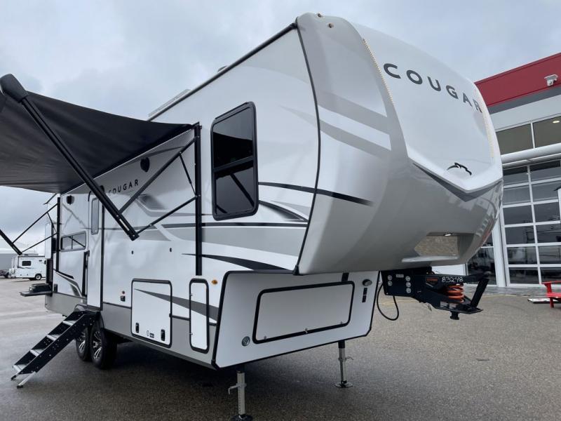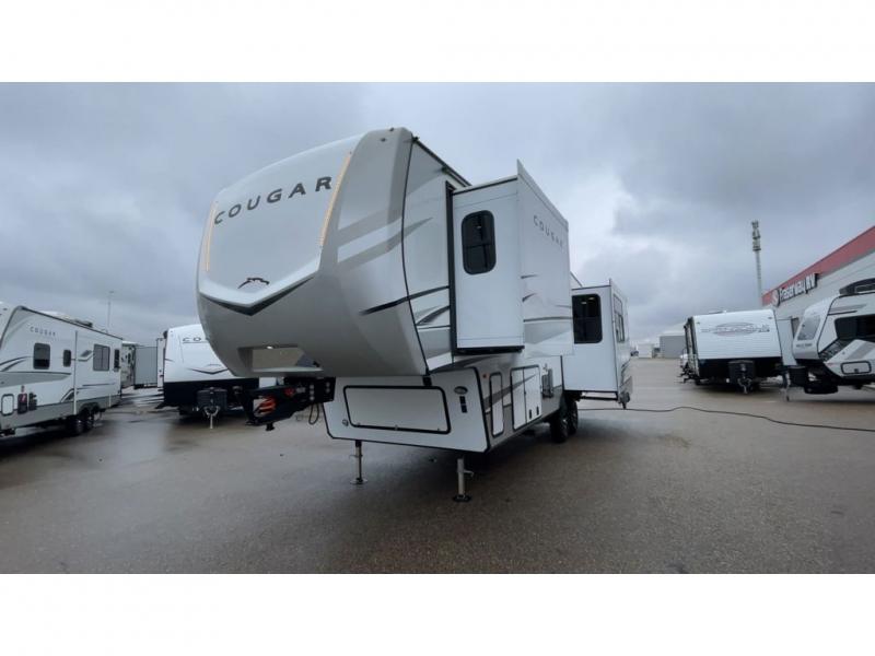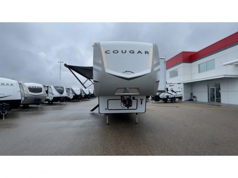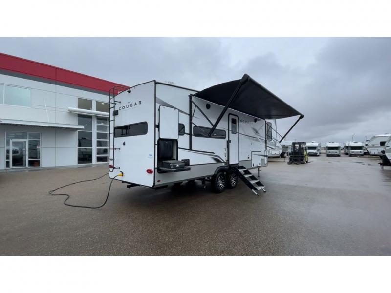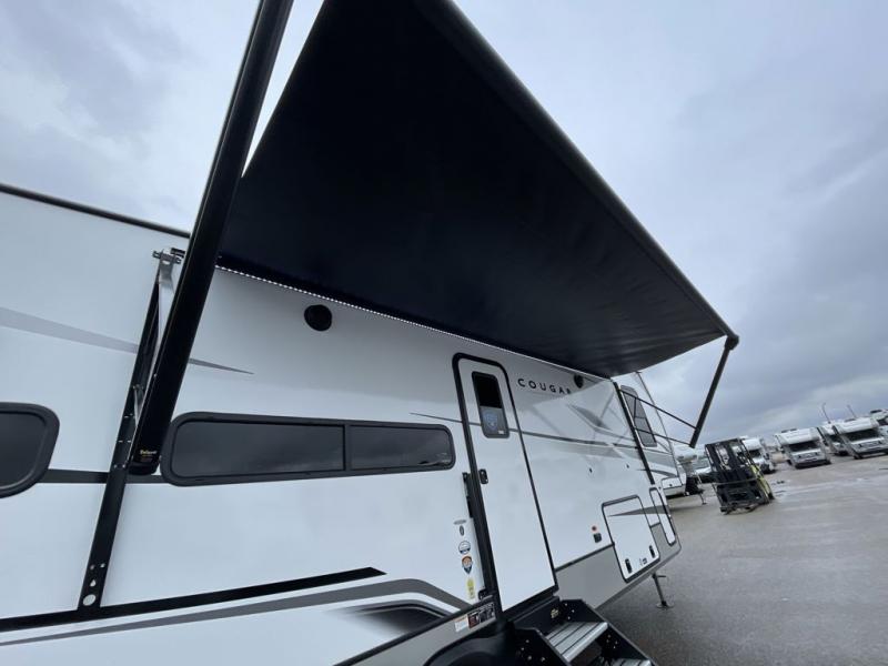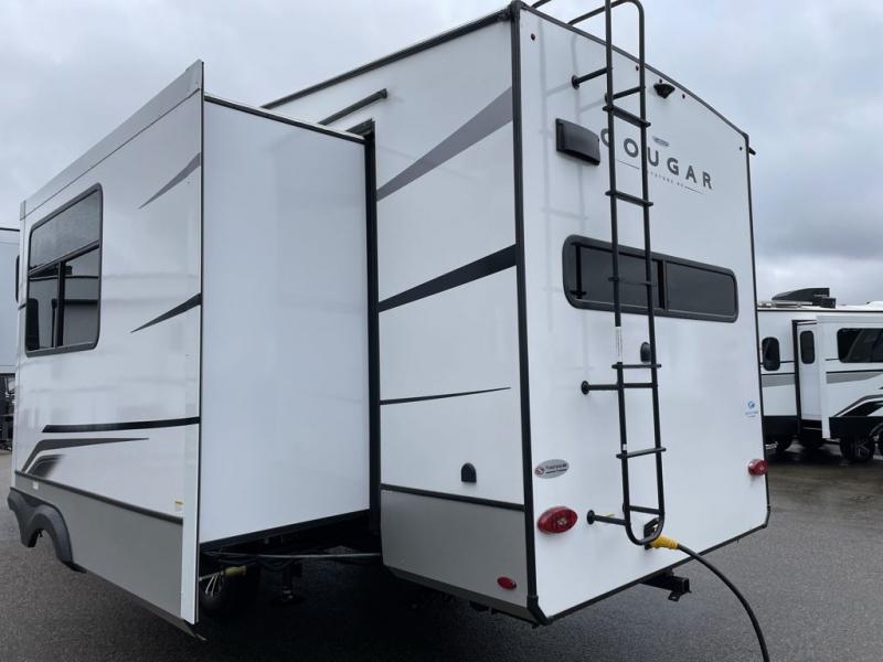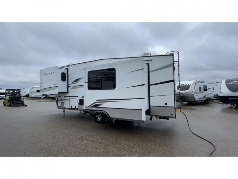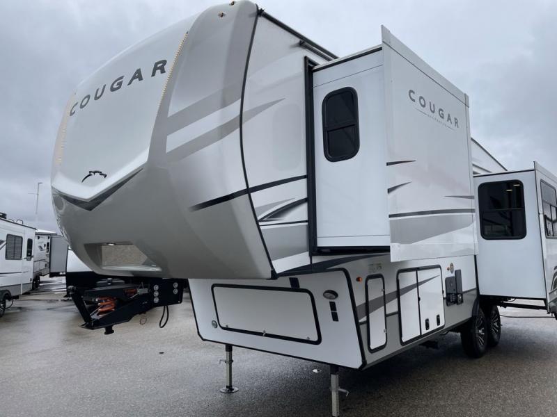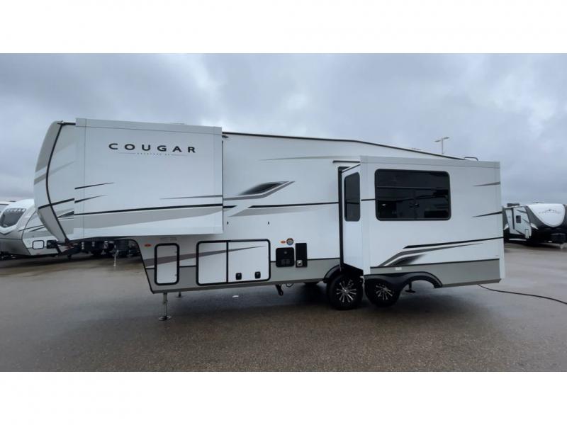 This fifth wheel is packed with premium features you won't want to camp without. You'll feel at home in the front private bedroom with its queen bed slide out with storage underneath, full-height wardrobe, plus a wardrobe with washer and dryer prep. There is even dresser with a sliding top with hidden storage for your valuables. If you have any guests, they can sleep on the tri-fold sleeper sofa within the living room slide, and there is a fireplace and LED HDTV here in perfect view for movie nights. This Cougar fifth wheel features a rear kitchen with tons of counter space, a convenient pull out trash can, and a high-rise chef's faucet and sprayer. The pull-out table in front of the fireplace will provide a place to dine at, or you can sit outdoors under the 20' power awning, and you'll also find an outside kitchen here the chef of your group is sure to love!