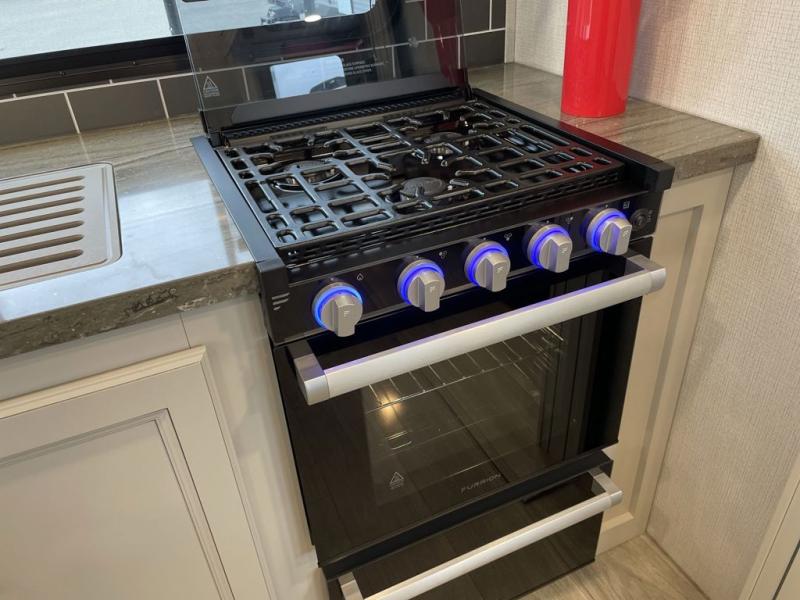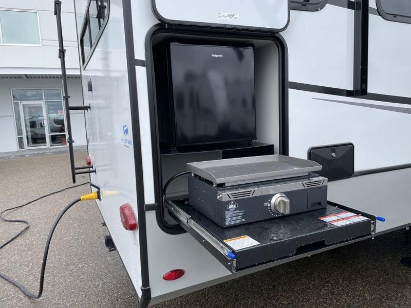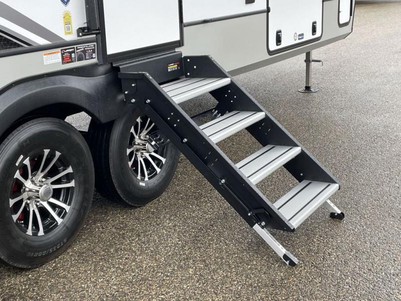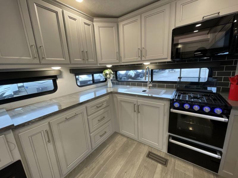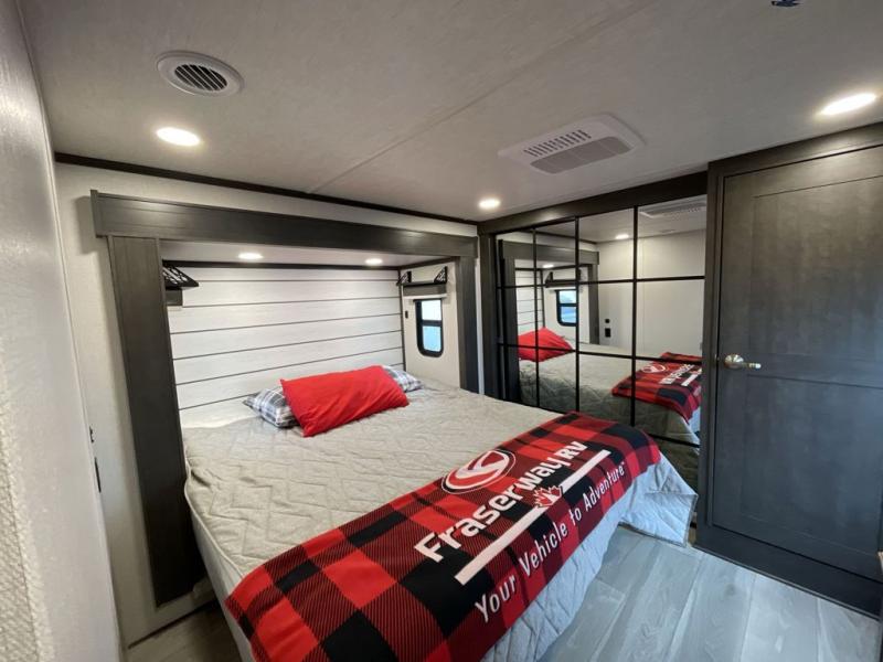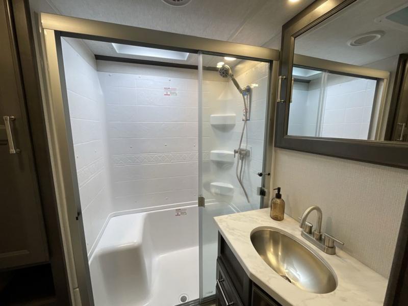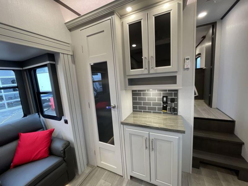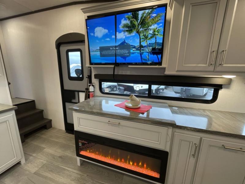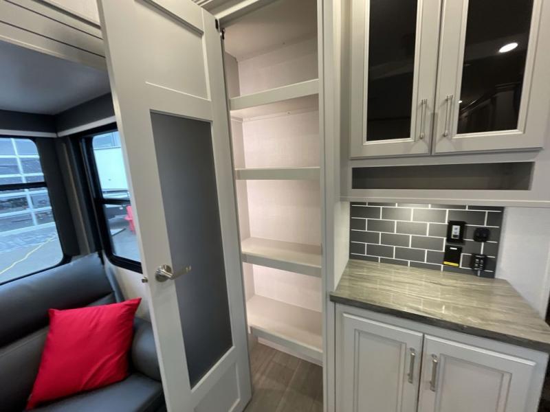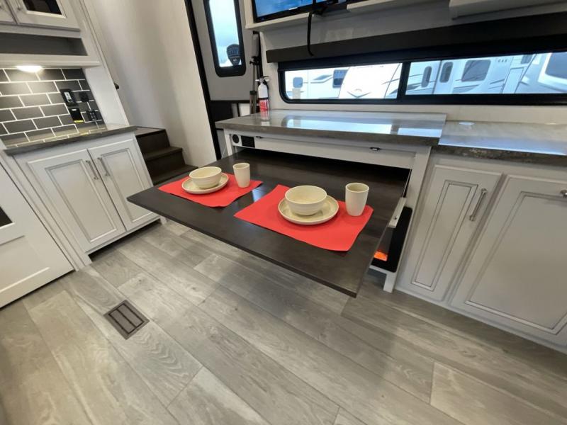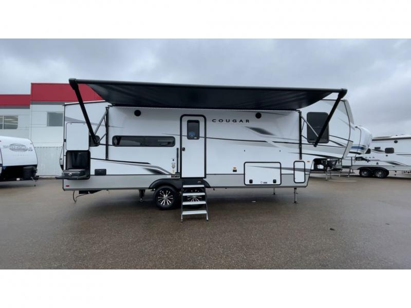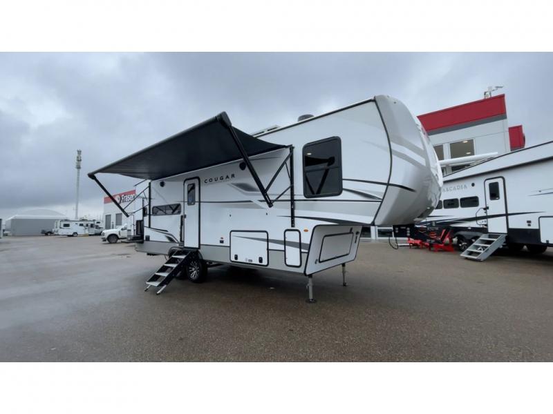 This fifth wheel is packed with premium features you won't want to camp without. You'll feel at home in the front private bedroom with its queen bed slide out with storage underneath, full-height wardrobe, plus a wardrobe with washer and dryer prep. There is even dresser with a sliding top with hidden storage for your valuables. If you have any guests, they can sleep on the tri-fold sleeper sofa within the living room slide, and there is a fireplace and LED HDTV here in perfect view for movie nights. This Cougar fifth wheel features a rear kitchen with tons of counter space, a convenient pull out trash can, and a high-rise chef's faucet and sprayer. The pull-out table in front of the fireplace will provide a place to dine at, or you can sit outdoors under the 20' power awning, and you'll also find an outside kitchen here the chef of your group is sure to love!