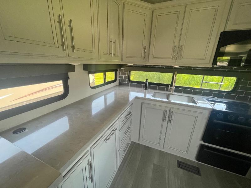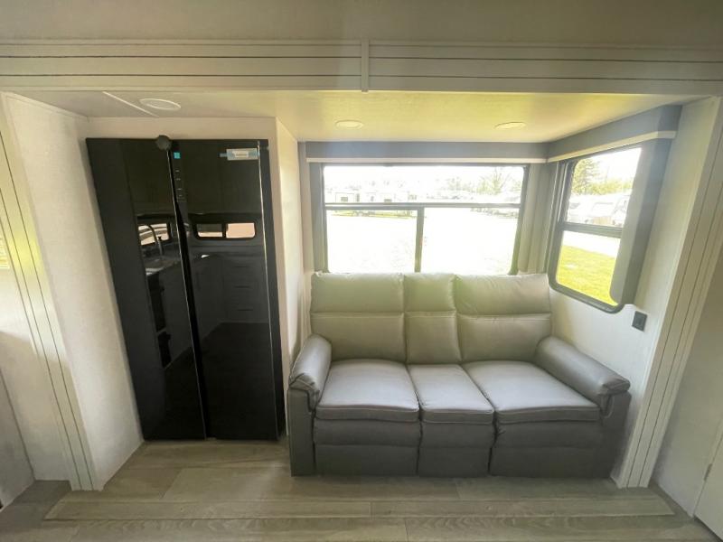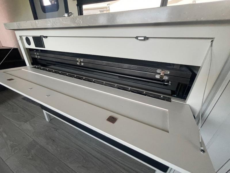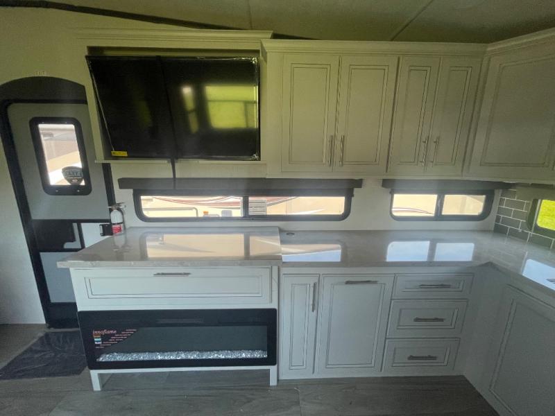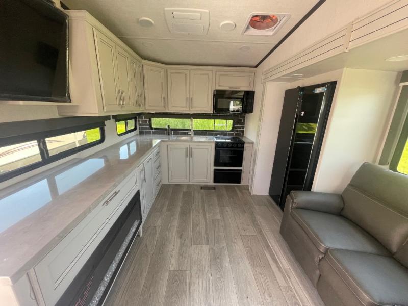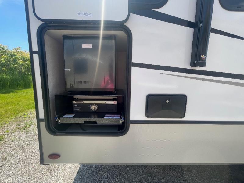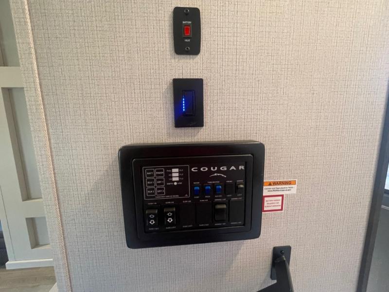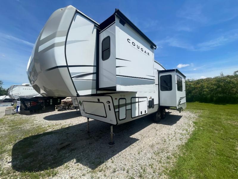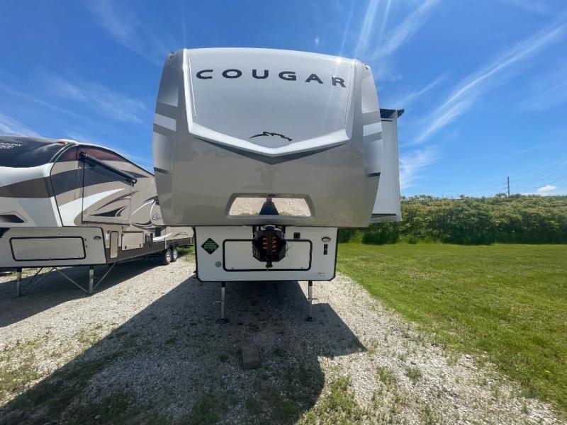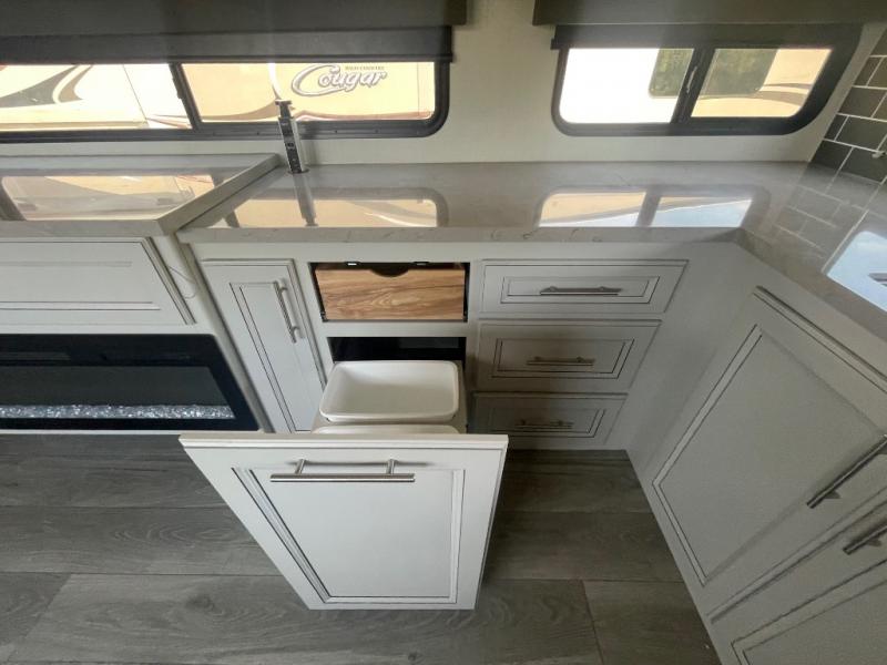 This fifth wheel is packed with premium features you won't want to camp without. You'll feel at home in the front private bedroom with its queen bed slide out with storage underneath, full-height wardrobe, plus a wardrobe with washer and dryer prep. There is even dresser with a sliding top with hidden storage for your valuables. If you have any guests, they can sleep on the tri-fold sleeper sofa within the living room slide, and there is a fireplace and LED HDTV here in perfect view for movie nights. This Cougar fifth wheel features a rear kitchen with tons of counter space, a convenient pull out trash can, and a high-rise chef's faucet and sprayer. The pull-out table in front of the fireplace will provide a place to dine at, or you can sit outdoors under the 20' power awning, and you'll also find an outside kitchen here the chef of your group is sure to love!