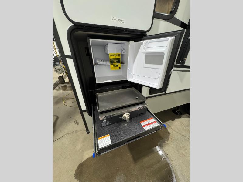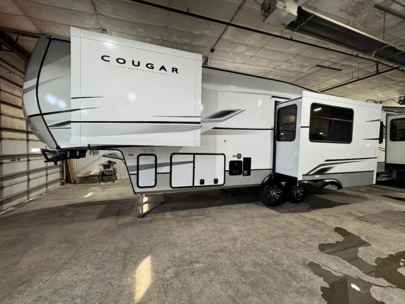 This fifth wheel is packed with premium features you won't want to camp without. You'll feel at home in the front private bedroom with its queen bed slide out with storage underneath, full-height wardrobe, plus a wardrobe with washer and dryer prep. There is even dresser with a sliding top with hidden storage for your valuables. If you have any guests, they can sleep on the tri-fold sleeper sofa within the living room slide, and there is a fireplace and LED HDTV here in perfect view for movie nights. This Cougar fifth wheel features a rear kitchen with tons of counter space, a convenient pull out trash can, and a high-rise chef's faucet and sprayer. The pull-out table in front of the fireplace will provide a place to dine at, or you can sit outdoors under the 20' power awning, and you'll also find an outside kitchen here the chef of your group is sure to love!