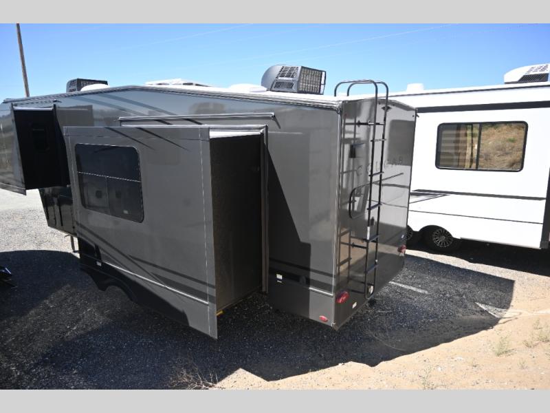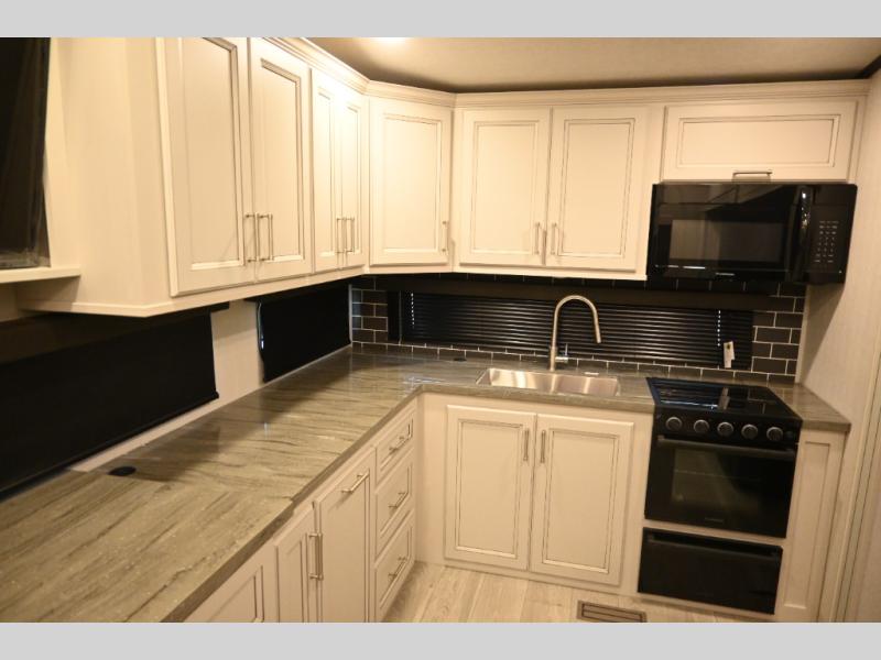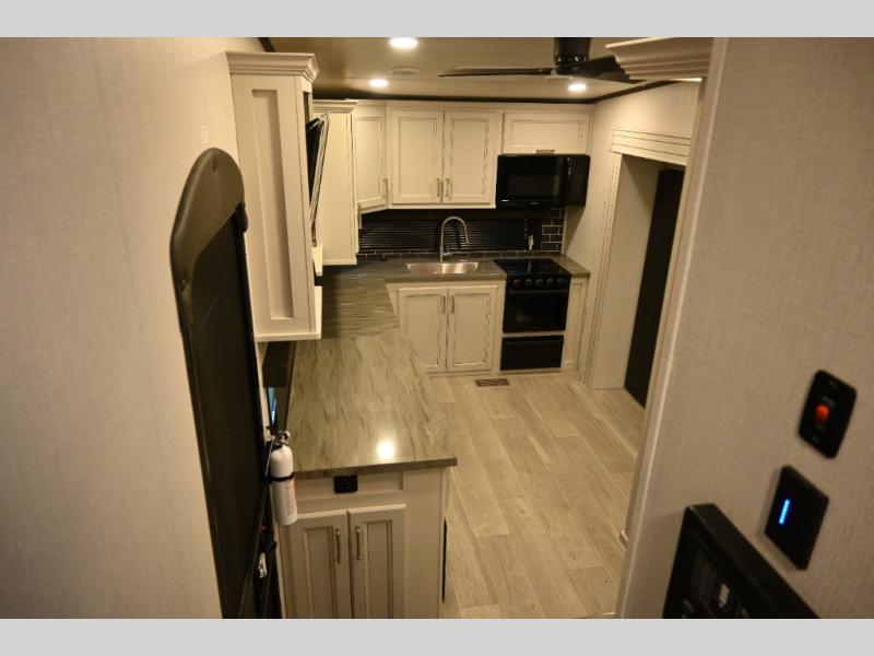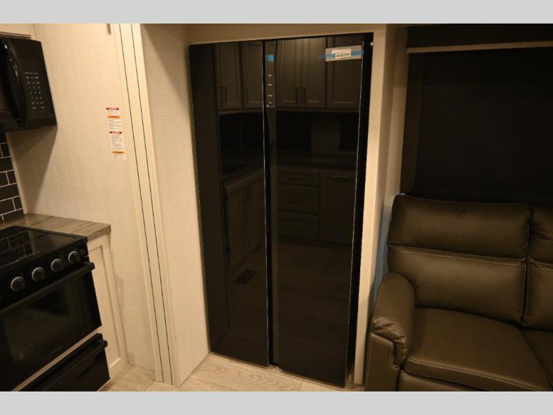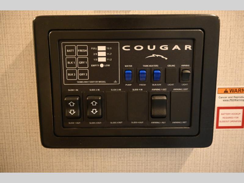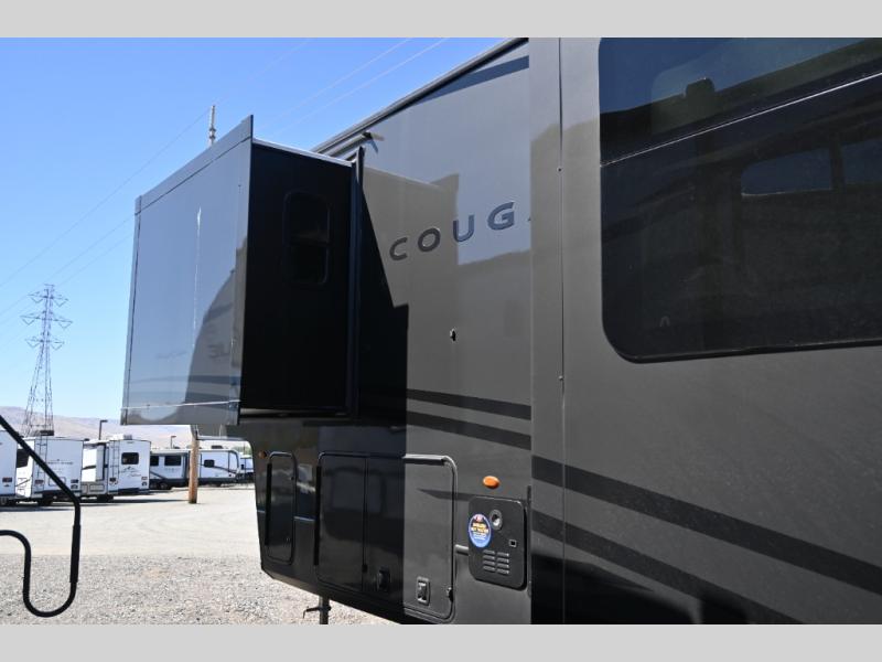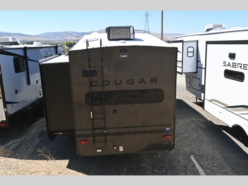 This fifth wheel is packed with premium features you won't want to camp without. You'll feel at home in the front private bedroom with its queen bed slide out with storage underneath, full-height wardrobe, plus a wardrobe with washer and dryer prep. There is even dresser with a sliding top with hidden storage for your valuables. If you have any guests, they can sleep on the tri-fold sleeper sofa within the living room slide, and there is a fireplace and LED HDTV here in perfect view for movie nights. This Cougar fifth wheel features a rear kitchen with tons of counter space, a convenient pull out trash can, and a high-rise chef's faucet and sprayer. The pull-out table in front of the fireplace will provide a place to dine at, or you can sit outdoors under the 20' power awning, and you'll also find an outside kitchen here the chef of your group is sure to love!