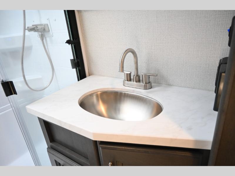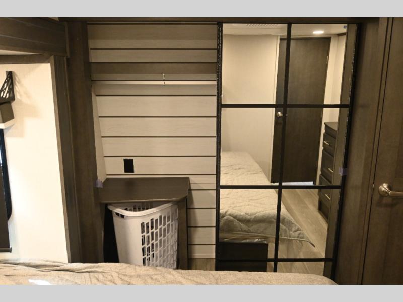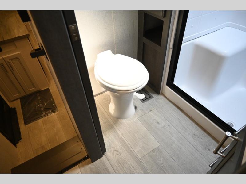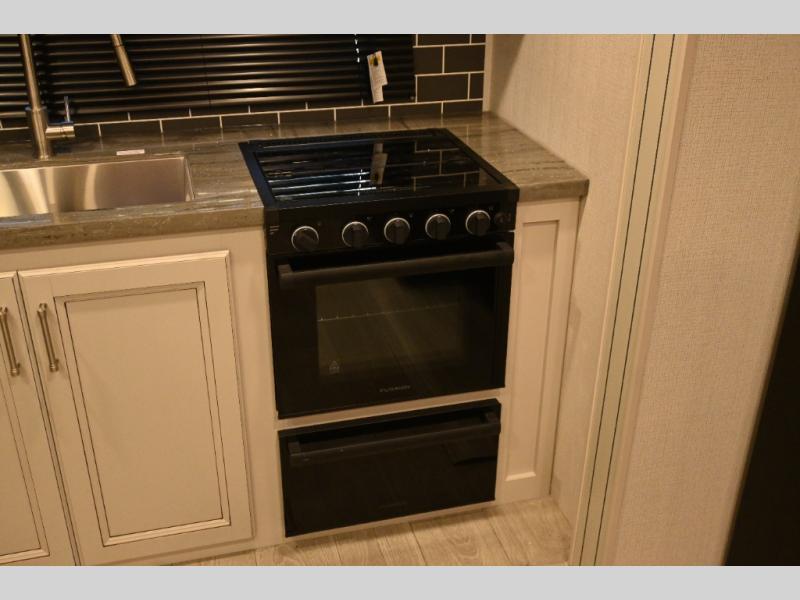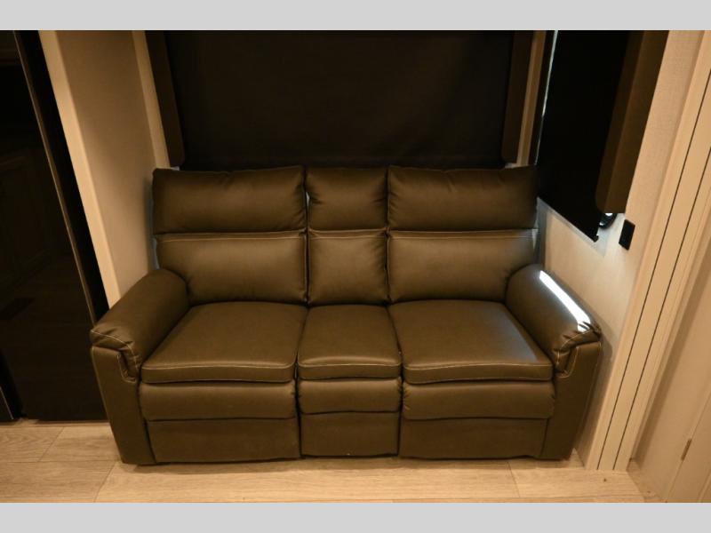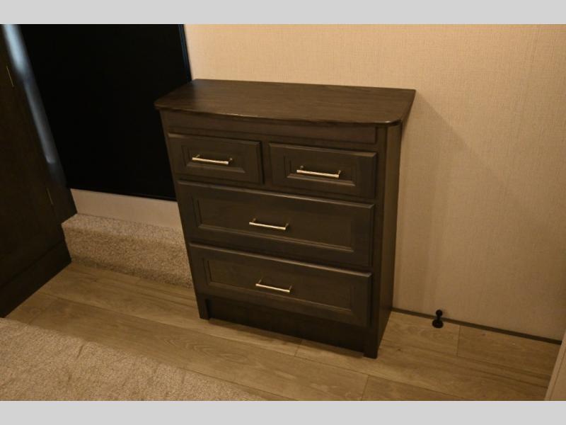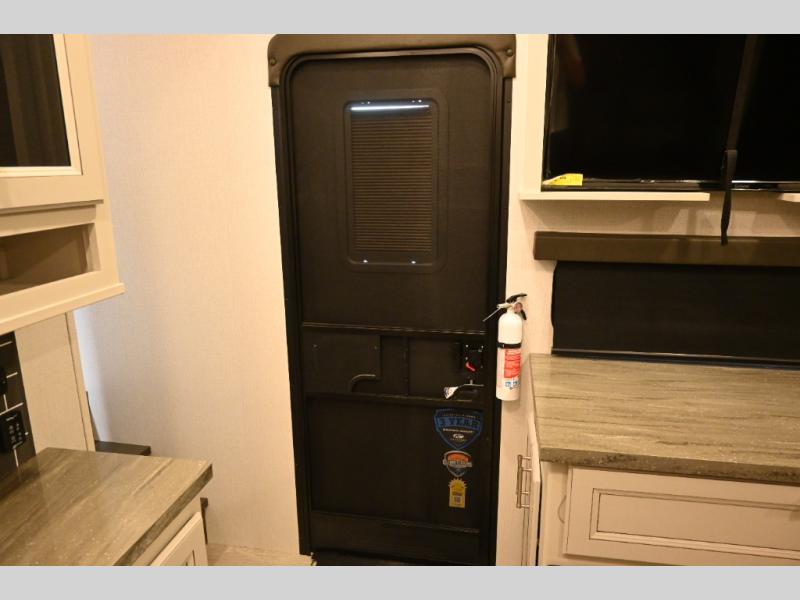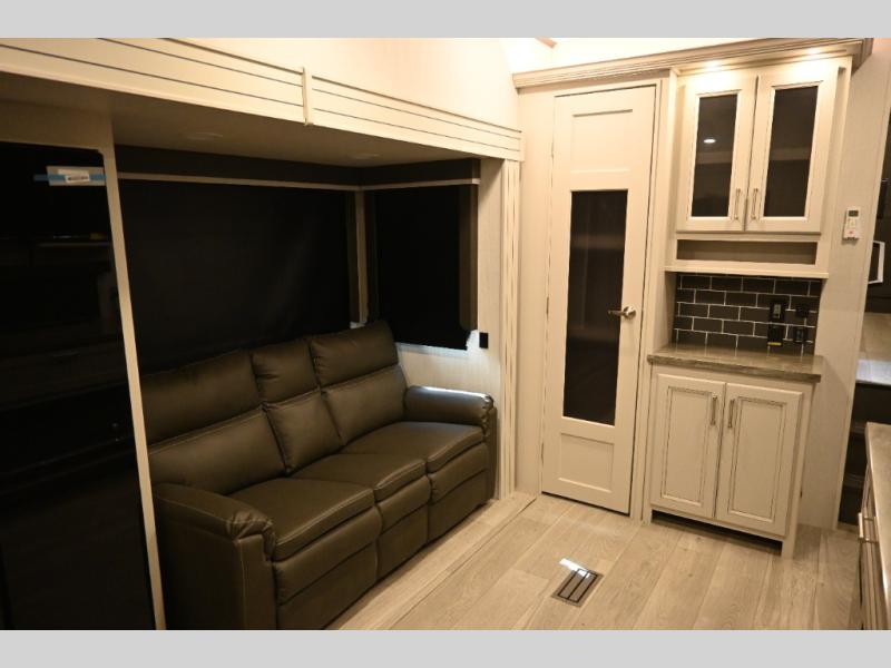 This fifth wheel is packed with premium features you won't want to camp without. You'll feel at home in the front private bedroom with its queen bed slide out with storage underneath, full-height wardrobe, plus a wardrobe with washer and dryer prep. There is even dresser with a sliding top with hidden storage for your valuables. If you have any guests, they can sleep on the tri-fold sleeper sofa within the living room slide, and there is a fireplace and LED HDTV here in perfect view for movie nights. This Cougar fifth wheel features a rear kitchen with tons of counter space, a convenient pull out trash can, and a high-rise chef's faucet and sprayer. The pull-out table in front of the fireplace will provide a place to dine at, or you can sit outdoors under the 20' power awning, and you'll also find an outside kitchen here the chef of your group is sure to love!