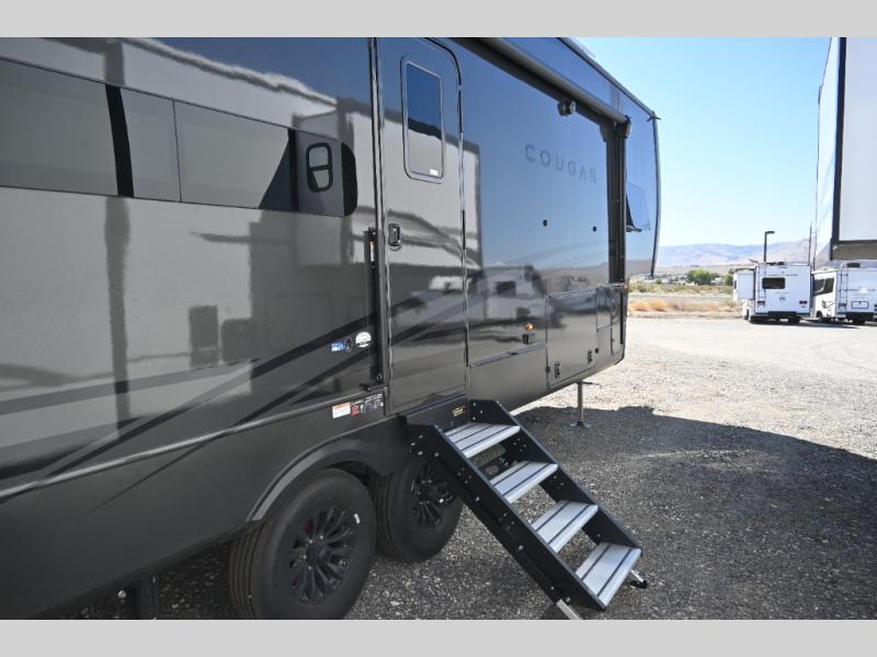 Spend more time having fun and less time worrying about your RV with the Keystone Cougar fifth wheel! These units have all that you will need for excellent vacations. The interior comes with 5/8" one-piece DynaSpan® flooring, tall slide outs for added comfort and head room, night roller shades throughout, and residential, raised-panel hardwood cabinet doors and drawers. You will also enjoy decorative crown molding, a 5,500 BTU electric fireplace with thermostat control and remote, and a Max Air exhaust fan with rain sensor. The exterior is also fully outfitted with a convenience center, friction-hinge entry door, electric four-point auto leveling system, and Lippert SolidStep® on the main entry. Each model is available with the optional Hero Edition. By choosing this edition, you can help support our nation's heros and their families by contributing to the Wounded Warrior Project. This optional package features an industry exclusive full-body paint matte finish, frameless windows, a glass entry door, blackout rims, and green LED exterior accent lighting; see dealer for more details!