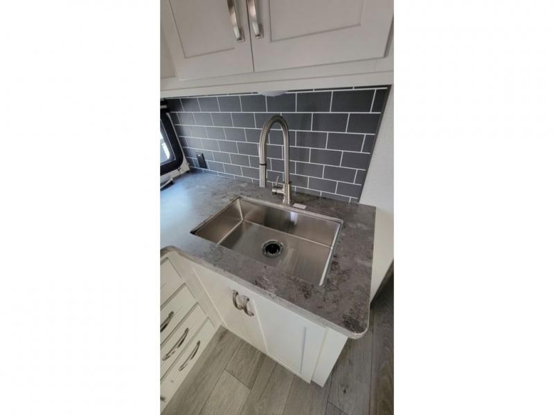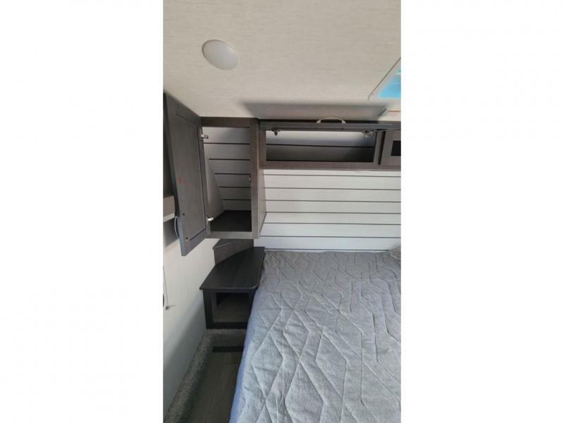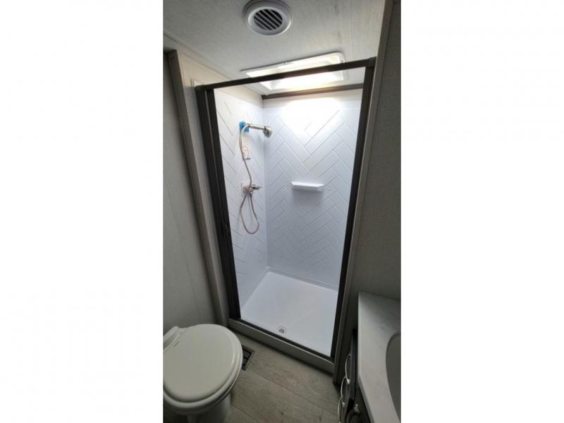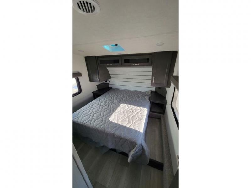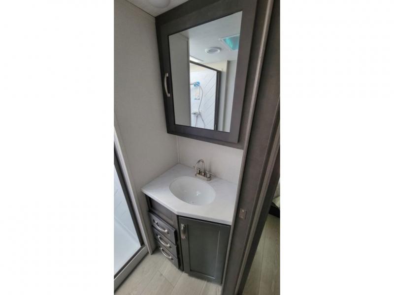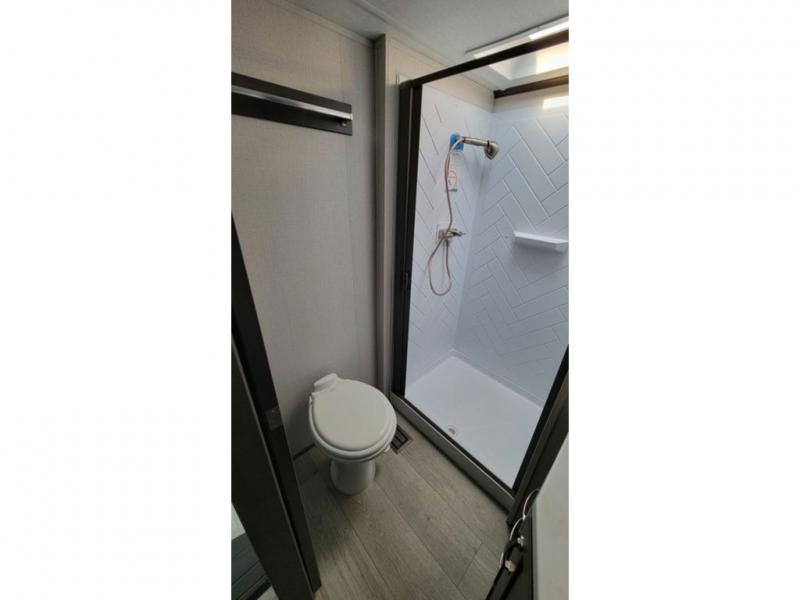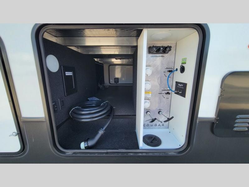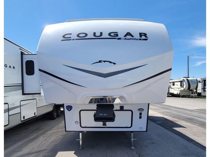The Cougar Sport structural I-beam frame with stamped steel cross-members and outriggers, plus its laminated sidewalls with five-sided aluminum superstructure and Alpha Super Flex roof membrane are what active RVers love about the construction of the Cougar line. The Cougar Sport models are no exception when it comes to a great package, as well as being smaller and lighter weight than their big brother Cougar models. A one-piece, heated and enclosed polypropylene underbelly means a longer camping season. On the inside, residential shaker style hardwood cabinet doors and decorative crown molding, plus seamless pressed countertops and an on-demand water heater will make your unit feel even more like home. You are also sure to appreciate the shiplap style decorative accent wall behind the bed, a porcelain foot flush toilet in the bathroom, plus residential kitchen hardware, and so much more.