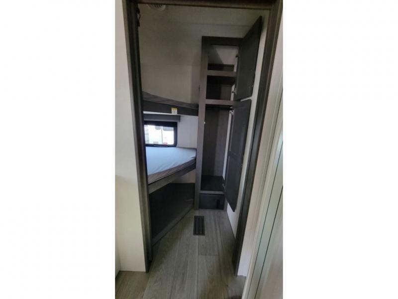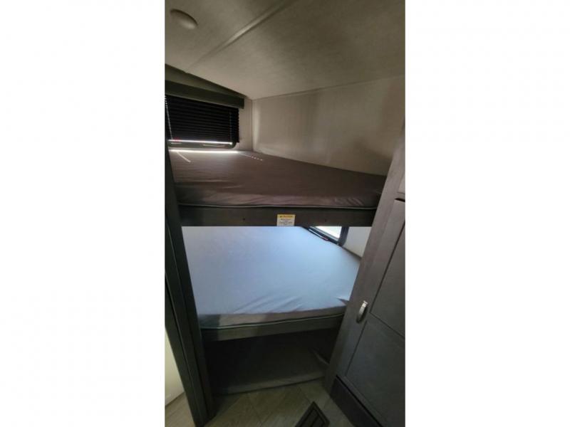 This lightweight Cougar Sport bunk model features sleeping for ten or more with triple stacked double bed bunks in the rear bunk room, a large U-shaped dinette that can be transformed into sleep space, as well as a tri-fold sofa sleeper and a queen bed in the private bedroom up front. The U-shaped dinette will seat quite a few of you for meals and even game time, plus the sofa is nearby for even more to kick back on. A fully equipped kitchen with overhead microwave, a three burner range, and large sink plus storage will make it easy to keep everyone fed and happy. A 10.4 Cu. Ft. 12 volt refrigerator will keep all of your perishable items fresh, and there are plenty of cabinets for storing snacks and dry goods as well. Head up the steps to the bathroom featuring a shower with a skylight, sink with overhead medicine cabinet, and toilet. The private front bedroom takes you away from the hustle and bustle of the main living area and bunkhouse to provide a relaxing retreat including a comfy queen bed, dual nightstands and shirt wardrobes as well as an additional wardrobe along the interior wall for even more storage.