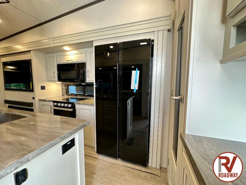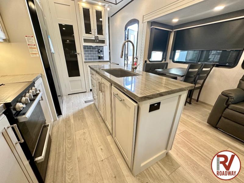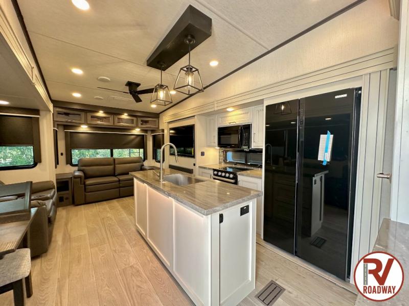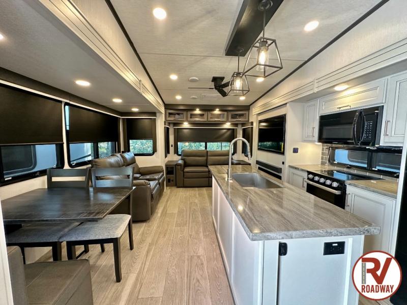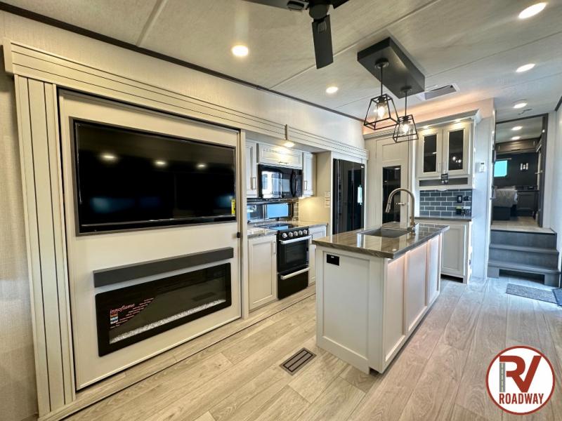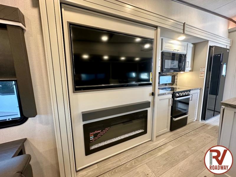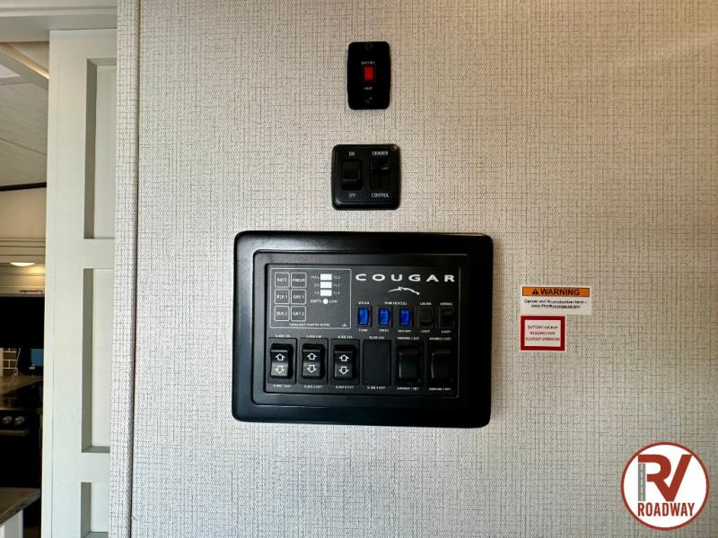Spend more time having fun and less time worrying about your RV with the Keystone Cougar fifth wheel! These units have all that you will need for excellent vacations. The interior comes with 5/8" one-piece DynaSpan® flooring, tall slide outs for added comfort and head room, night roller shades throughout, and residential, raised-panel hardwood cabinet doors and drawers. You will also enjoy decorative crown molding, a 5,500 BTU electric fireplace with thermostat control and remote, and a Max Air exhaust fan with rain sensor. The exterior is also fully outfitted with a convenience center, friction-hinge entry door, electric four-point auto leveling system, and Lippert SolidStep® on the main entry. There is a full pass-through storage with slam-latch baggage doors, an industry-best 80-gallon fresh tank capacity, a 2" accessory hitch with 300-LB storage capacity, and an outside shower.