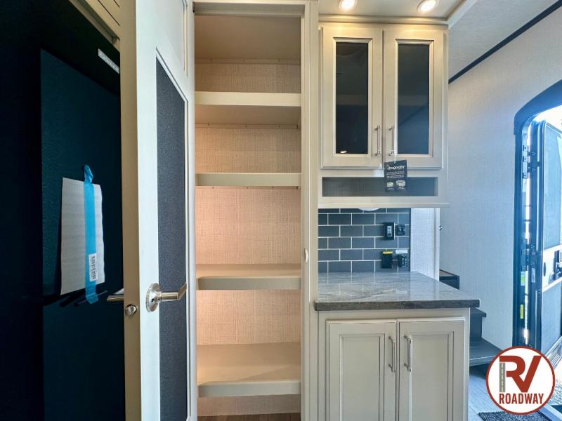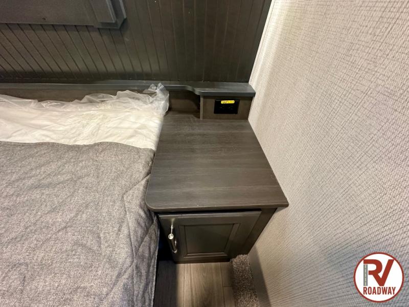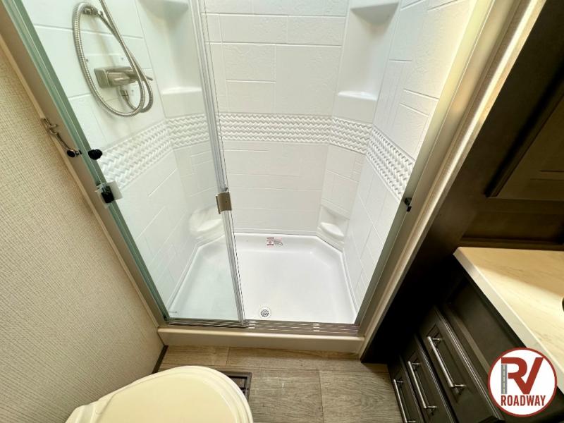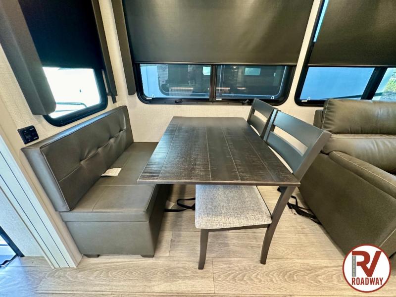 Gain some freedom to travel with this Cougar fifth wheel! You will be oh-so comfortable in the front private bedroom as you sleep on the queen-size bed, and the wardrobe slide will provide you with clothing storage. You'll be right next to the full bathroom while you're in the bedroom, so you can easily step inside the bathroom for a quick rinse in the 30" x 40" shower. The main living area offers you more space with its opposing slides, and you'll be able to get comfortable each evening on the tri-fold sleeper sofa and theater seating, or play a game at the free-standing dinette with an ottoman. There is also a pivoting entertainment door with a pantry and cordless vacuum prep!