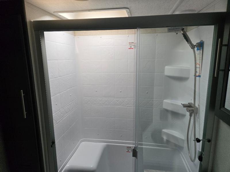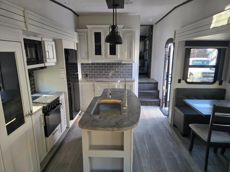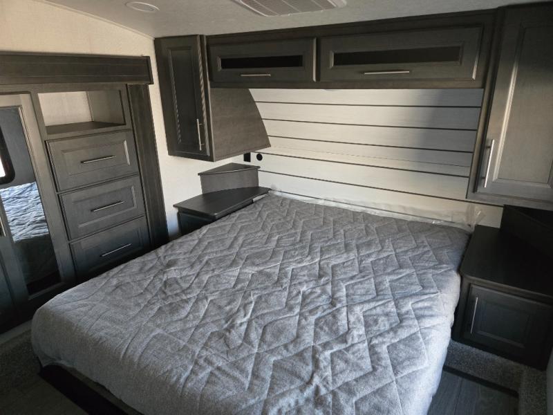 You will have the time of your life in this Cougar Half-Ton fifth wheel! There is so much comfort with the theater seating and 68" tri-fold sleeper sofa with end tables in the living area, and the comfort is taken up a notch with the addition of the fireplace below the entertainment center. You also have lots of space in this area because of the opposing slides, so you can work freely around the kitchen island preparing dinner or washing dishes. The booth dinette is right next to the kitchen, so you won't have to go far to set the table. If you don't need the dinette to serve as a bed, then you might be interested in switching it out for the optional free-standing table with chairs. The pantry is big enough to keep your favorite foods stored away, and the 10.4 cu.ft. refrigerator can hold the items that need to be kept chilled.