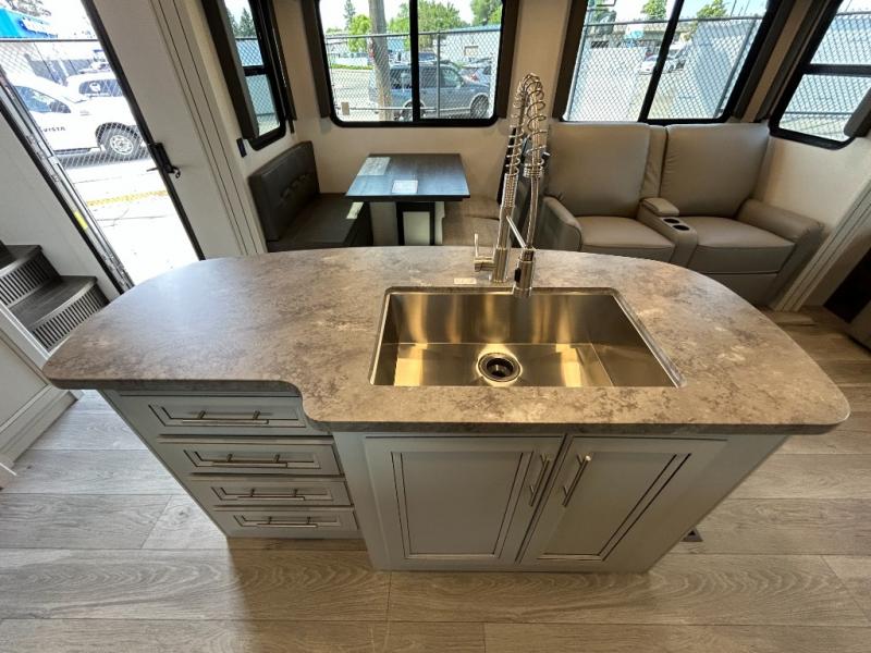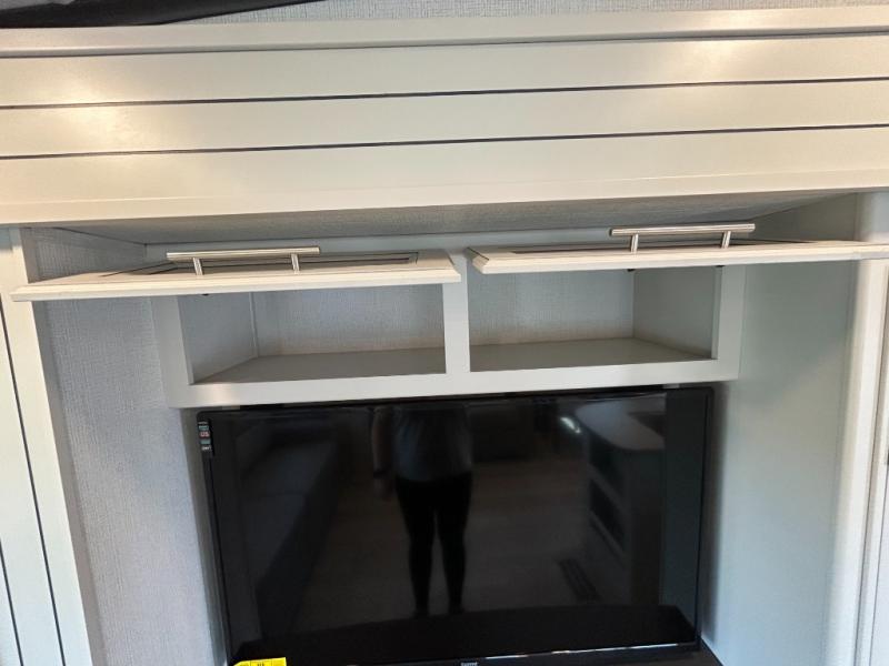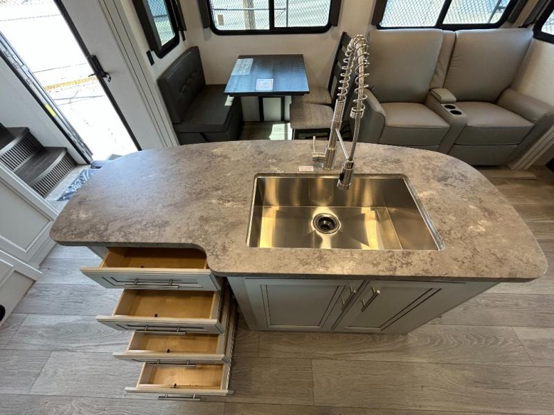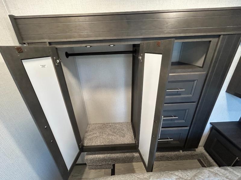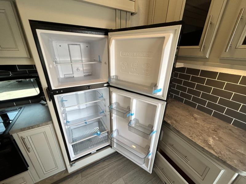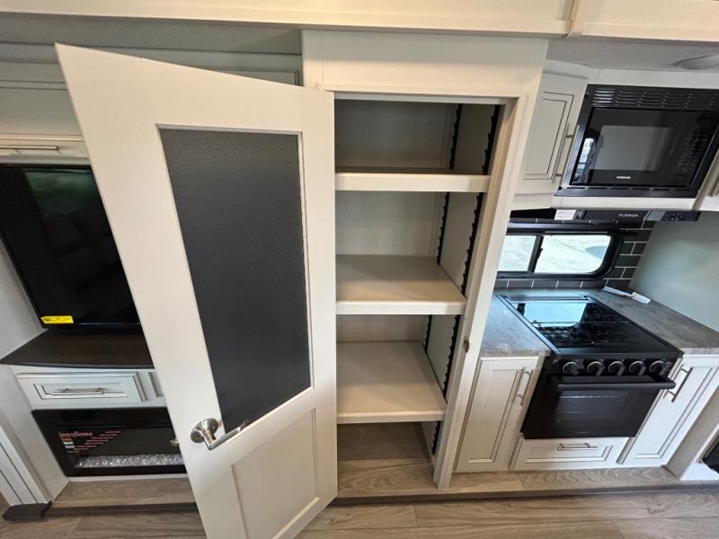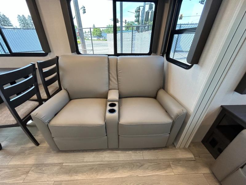 You will have the time of your life in this Cougar Half-Ton fifth wheel! There is so much comfort with the theater seating and 68" tri-fold sleeper sofa with end tables in the living area, and the comfort is taken up a notch with the addition of the fireplace below the entertainment center. You also have lots of space in this area because of the opposing slides, so you can work freely around the kitchen island preparing dinner or washing dishes. The booth dinette is right next to the kitchen, so you won't have to go far to set the table. If you don't need the dinette to serve as a bed, then you might be interested in switching it out for the optional free-standing table with chairs. The pantry is big enough to keep your favorite foods stored away, and the 10.4 cu.ft. refrigerator can hold the items that need to be kept chilled.