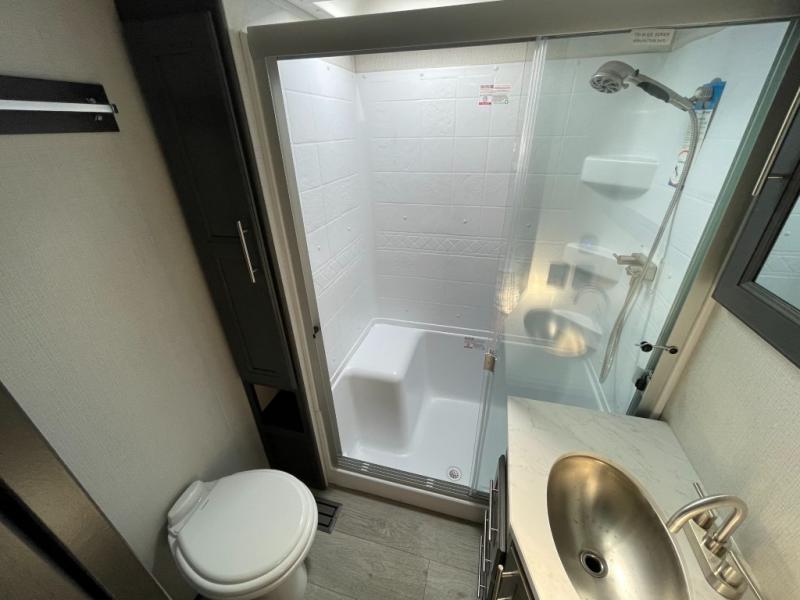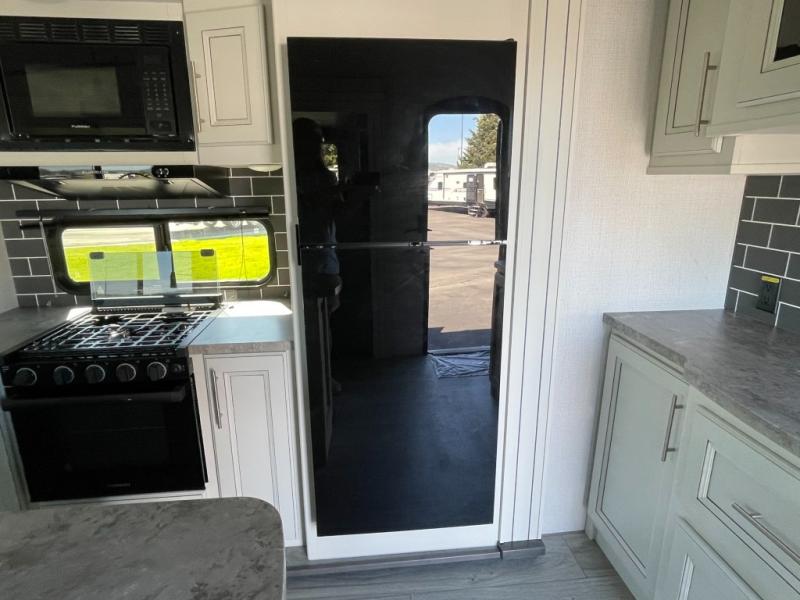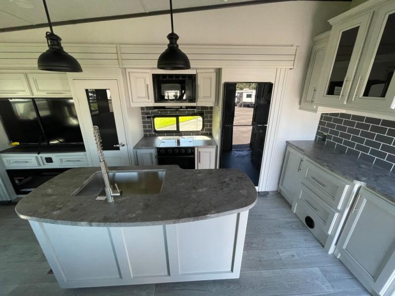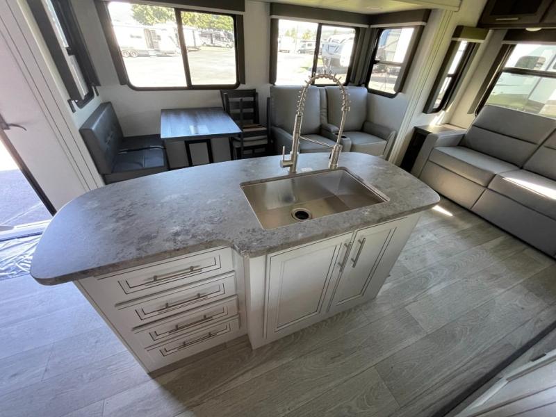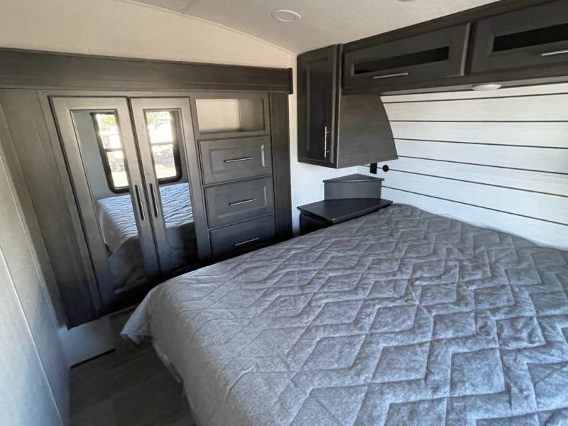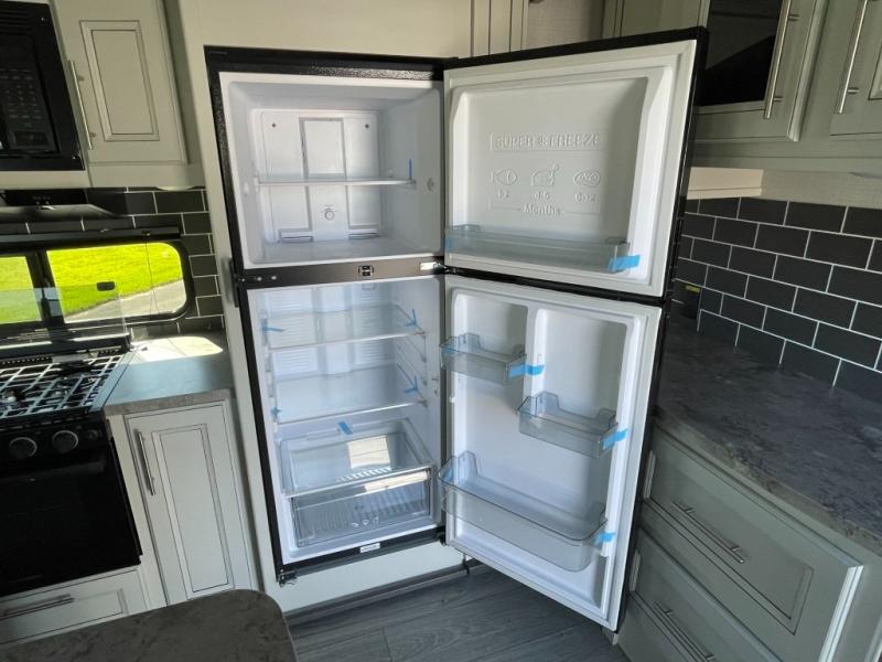 You will have the time of your life in this Cougar Half-Ton fifth wheel! There is so much comfort with the theater seating and 68" tri-fold sleeper sofa with end tables in the living area, and the comfort is taken up a notch with the addition of the fireplace below the entertainment center. You also have lots of space in this area because of the opposing slides, so you can work freely around the kitchen island preparing dinner or washing dishes. The booth dinette is right next to the kitchen, so you won't have to go far to set the table. If you don't need the dinette to serve as a bed, then you might be interested in switching it out for the optional free-standing table with chairs. The pantry is big enough to keep your favorite foods stored away, and the 10.4 cu.ft. refrigerator can hold the items that need to be kept chilled.