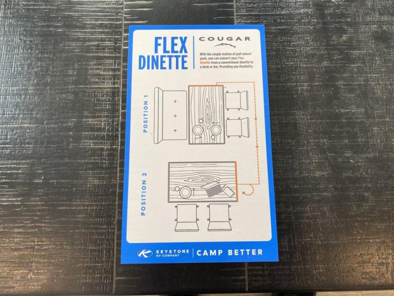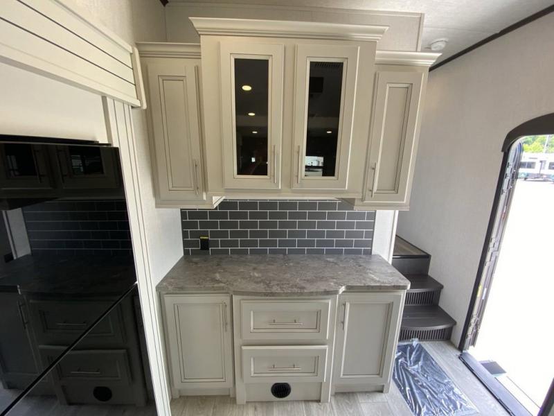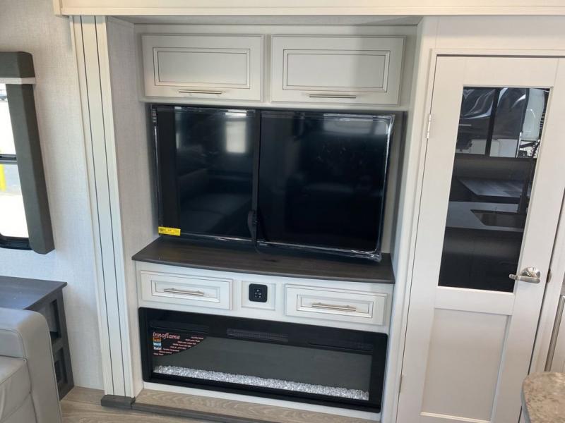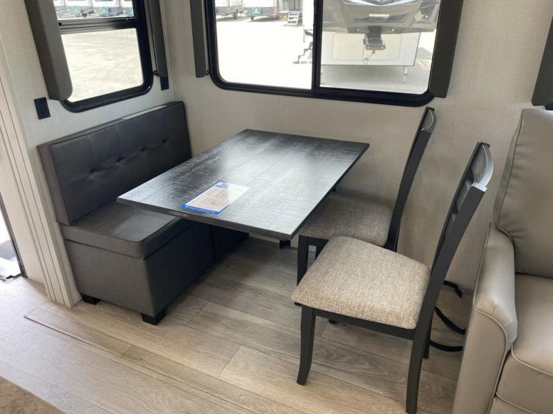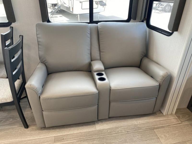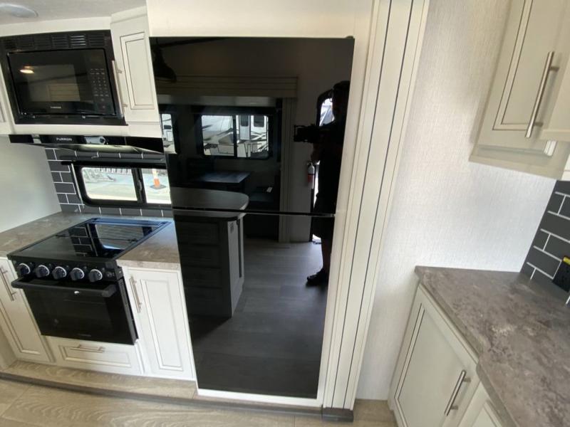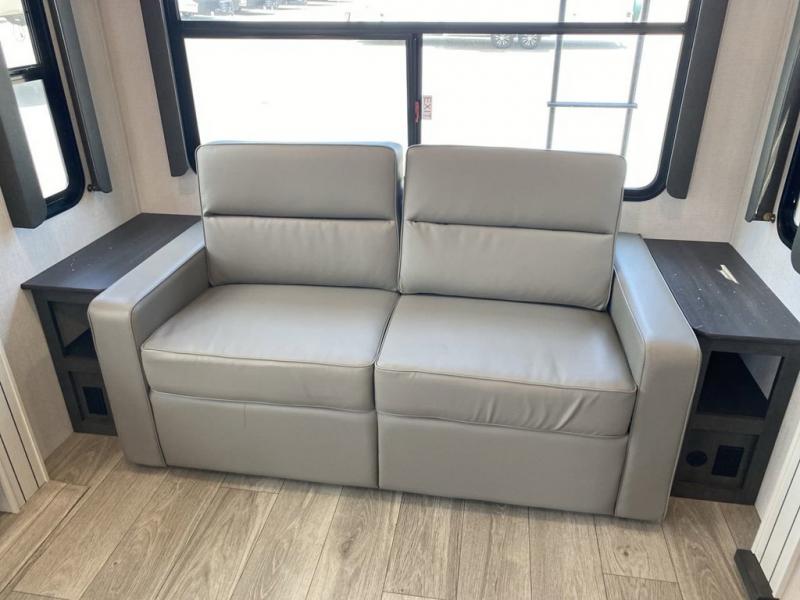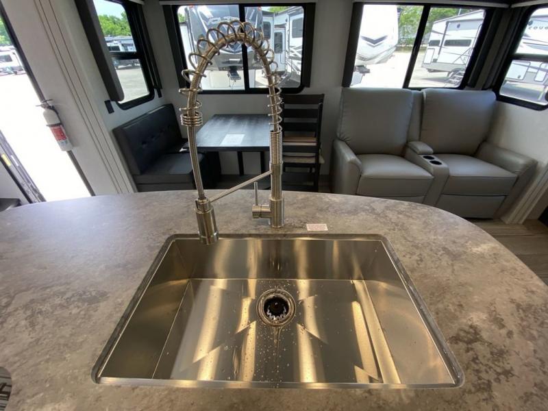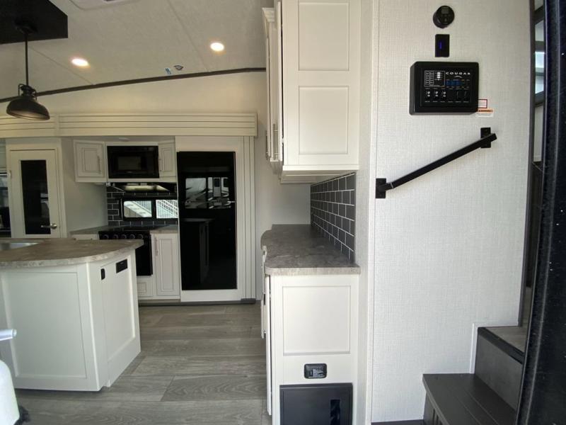 You will have the time of your life in this Cougar Half-Ton fifth wheel! There is so much comfort with the theater seating and 68" tri-fold sleeper sofa with end tables in the living area, and the comfort is taken up a notch with the addition of the fireplace below the entertainment center. You also have lots of space in this area because of the opposing slides, so you can work freely around the kitchen island preparing dinner or washing dishes. The booth dinette is right next to the kitchen, so you won't have to go far to set the table. If you don't need the dinette to serve as a bed, then you might be interested in switching it out for the optional free-standing table with chairs. The pantry is big enough to keep your favorite foods stored away, and the 10.4 cu.ft. refrigerator can hold the items that need to be kept chilled.