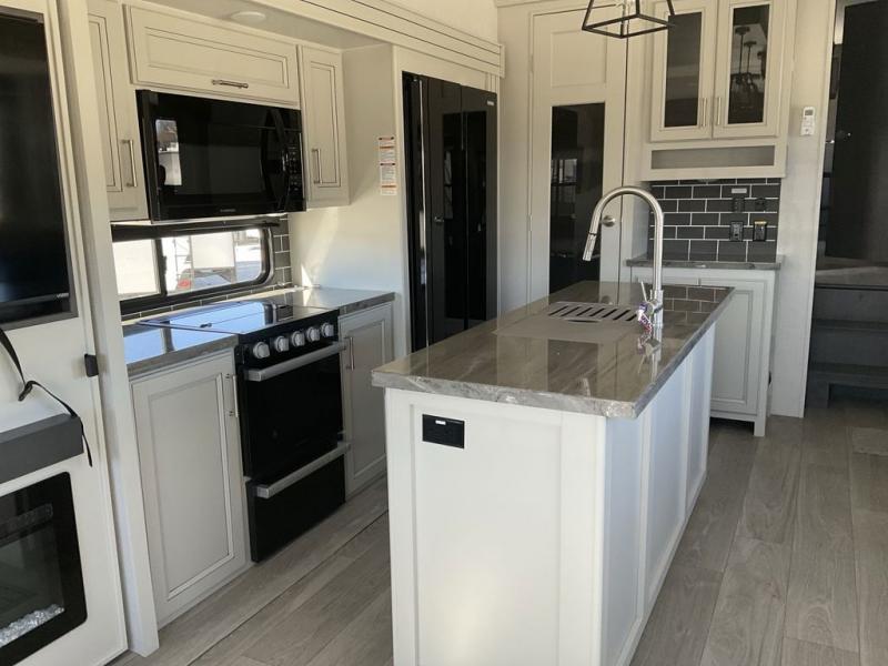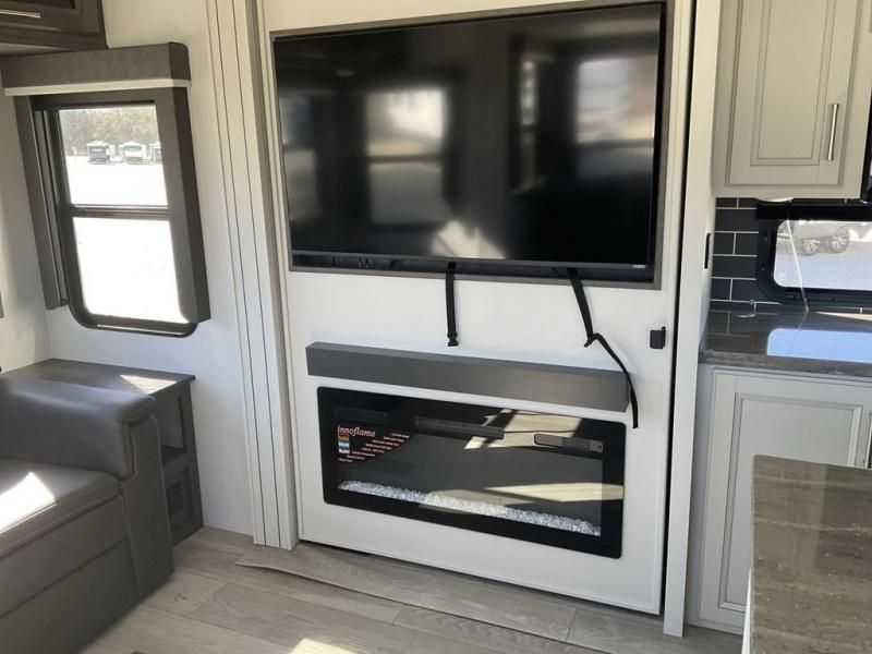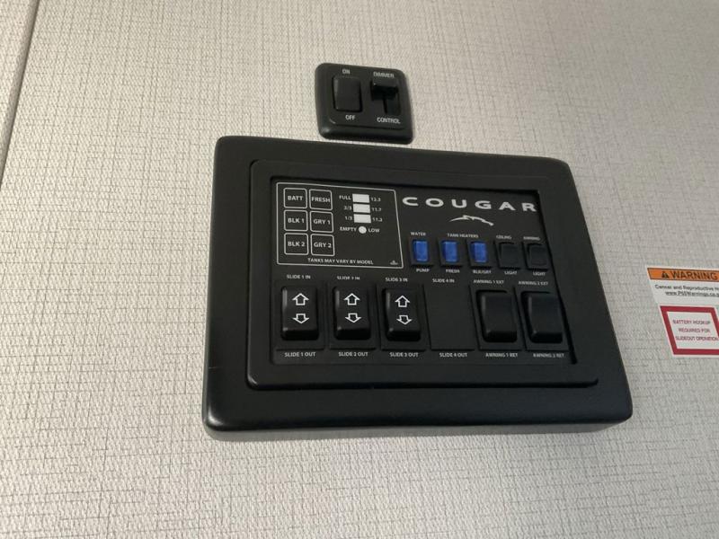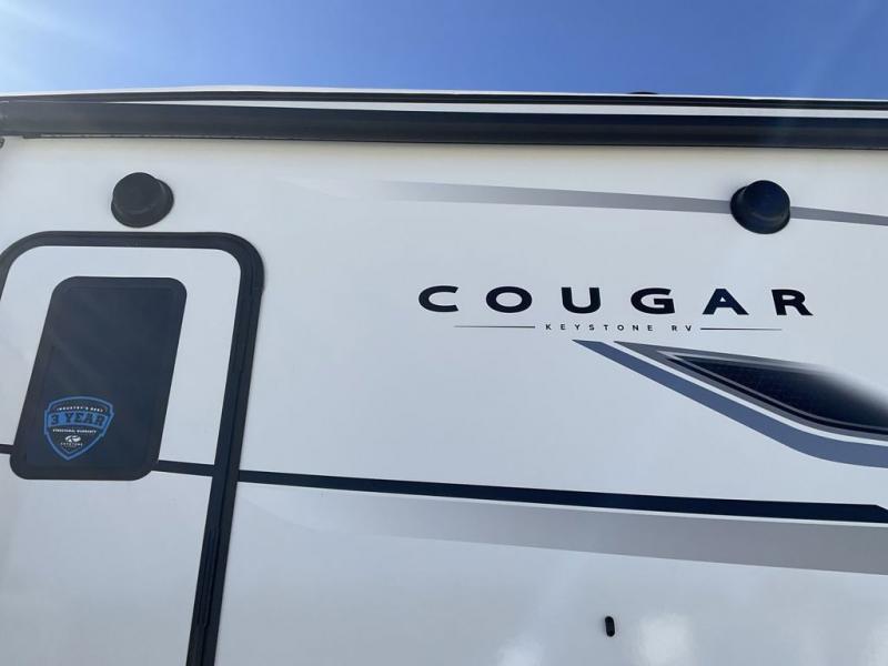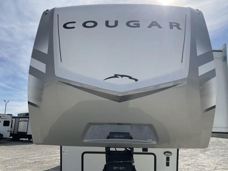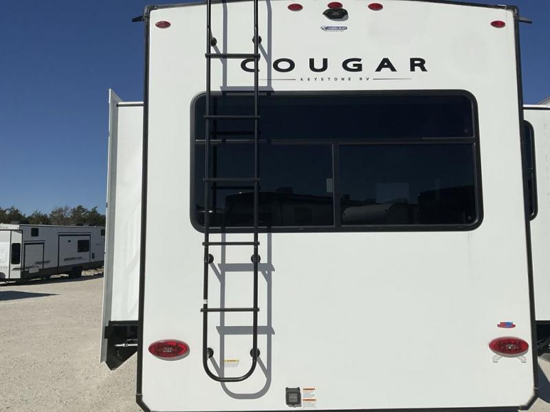 Spend more time having fun and less time worrying about your RV with the Keystone Cougar fifth wheel! These units have all that you will need for excellent vacations. The interior comes with 5/8" one-piece DynaSpan® flooring, tall slide outs for added comfort and head room, night roller shades throughout, and residential, raised-panel hardwood cabinet doors and drawers. You will also enjoy decorative crown molding, a 5,500 BTU electric fireplace with thermostat control and remote, and a Max Air exhaust fan with rain sensor. The exterior is also fully outfitted with a convenience center, friction-hinge entry door, electric four-point auto leveling system, and Lippert SolidStep® on the main entry. There is a full pass-through storage with slam-latch baggage doors, an industry-best 80-gallon fresh tank capacity, a 2" accessory hitch with 300-LB storage capacity, and an outside shower.