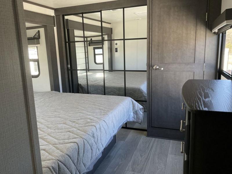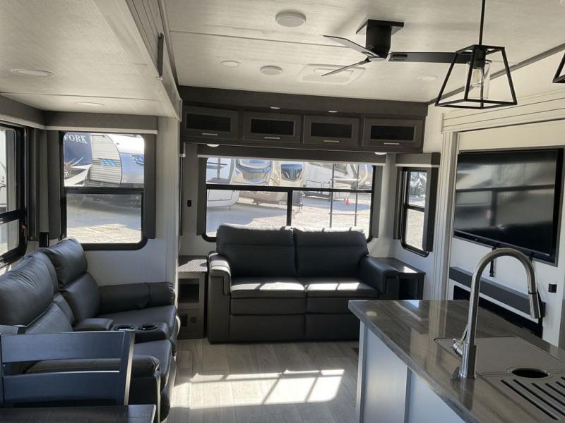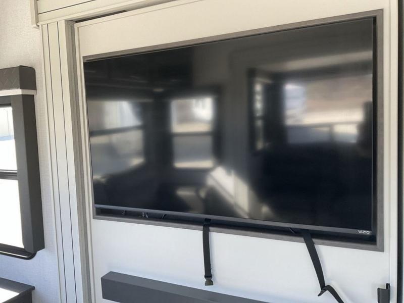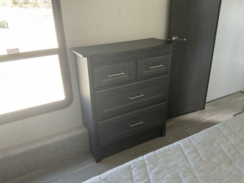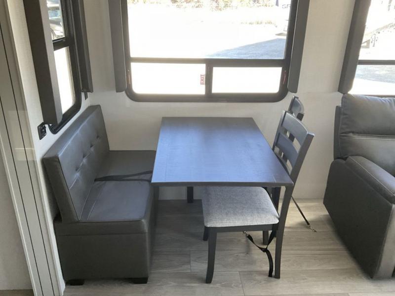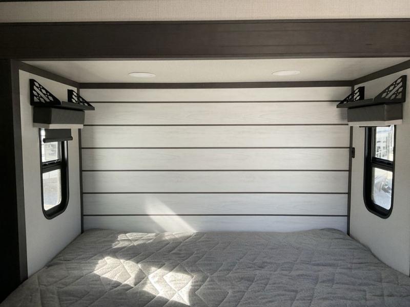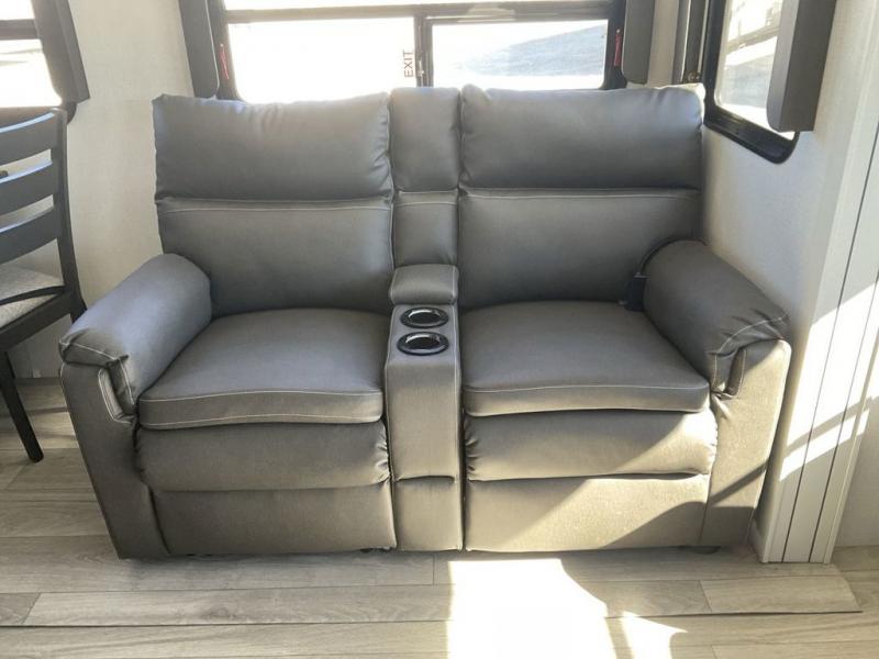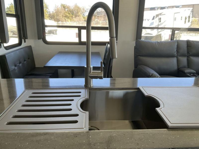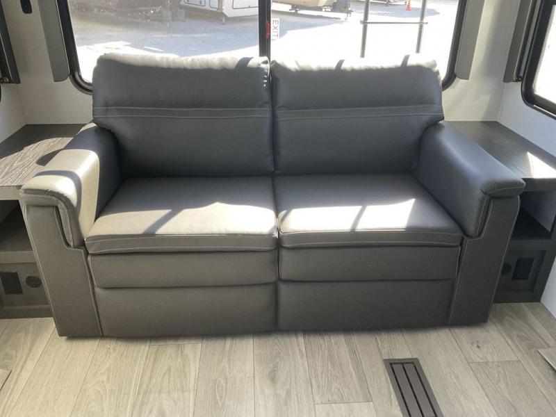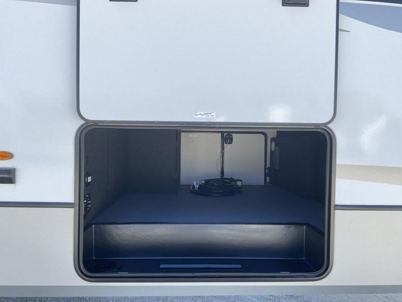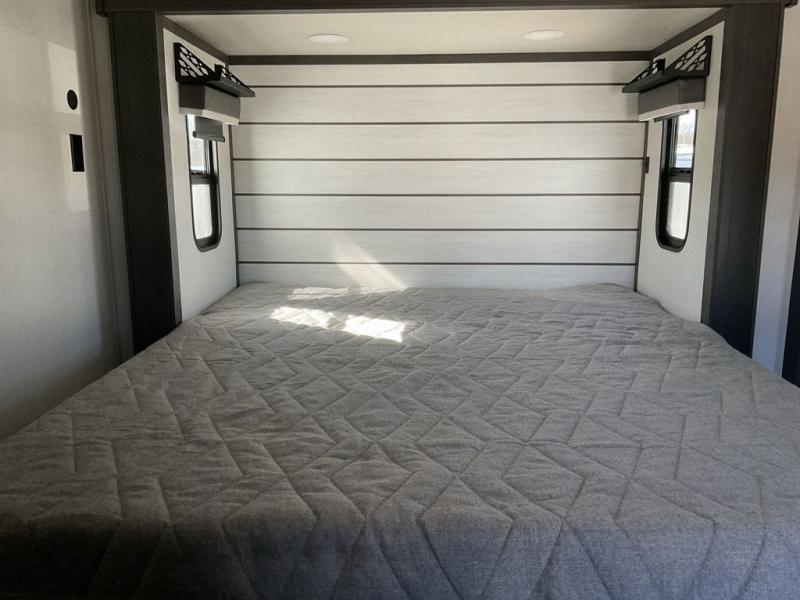 The dual-sink vanity in the full bathroom on this Cougar fifth wheel is what will make your morning routine feel just the same on the road as it does at home! You'll also sleep just as well on the queen-size bed in the front private bedroom, and there is under-bed storage, a full-height wardrobe, and a dresser with hidden storage for all of your personal belongings. As you spend time in the main living area, you'll appreciate having extra space thanks to the set of opposing slides, and the kitchen island will be easy to work around. You'll be able to relax on the tri-fold sleeper sofa and theater seating while you watch the LED HDTV with an pivoting entertainment door and hidden pantry. There is also a booth dinette with storage drawers, convenient shoe storage right as you enter the unit, and an exterior unobstructed pass-thru storage so nothing gets left behind.
