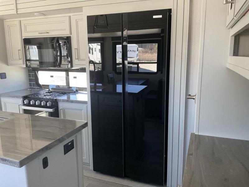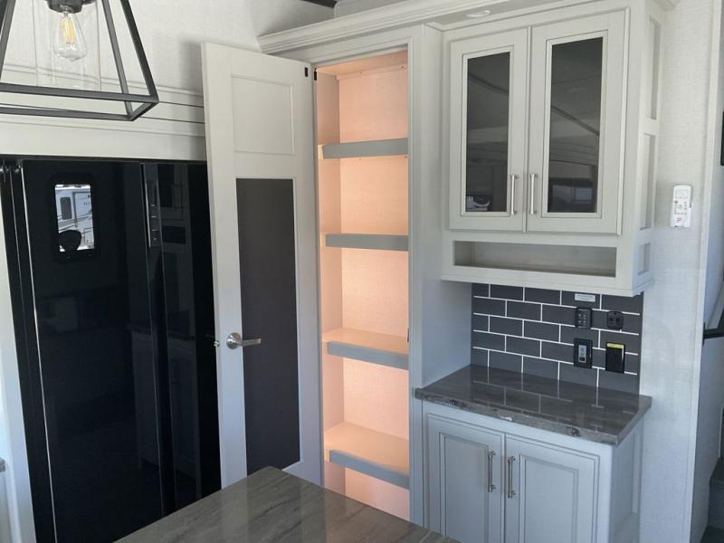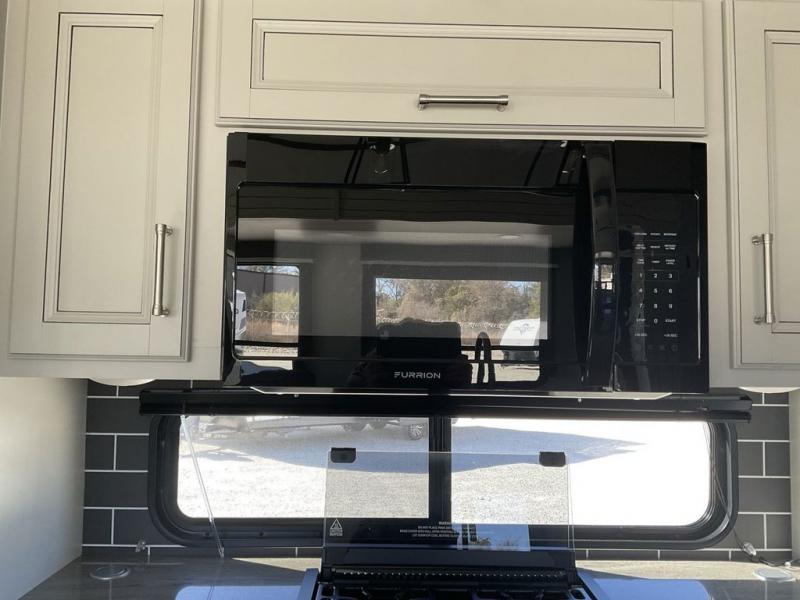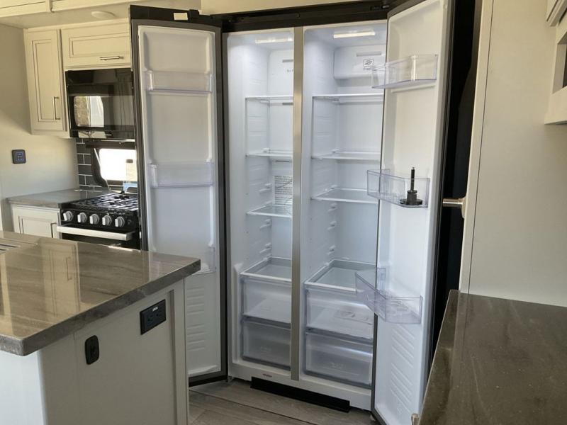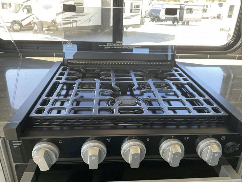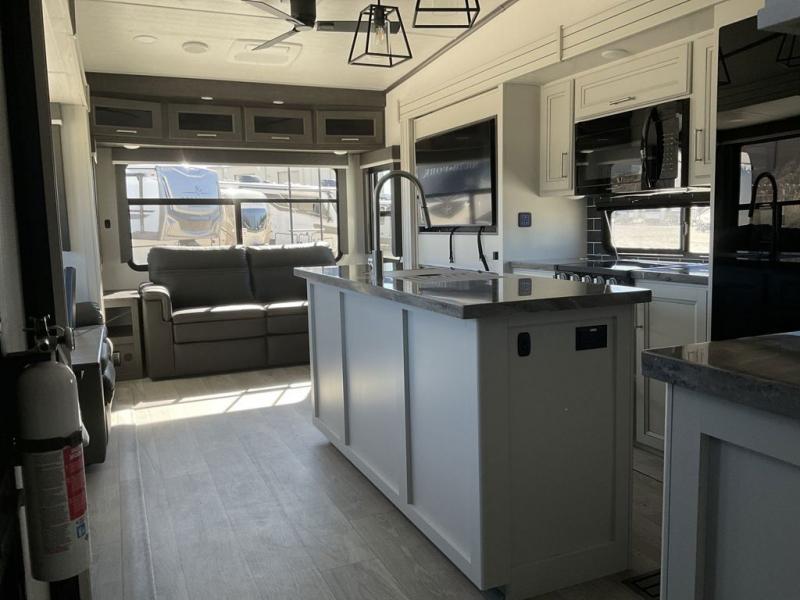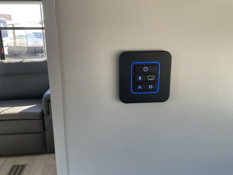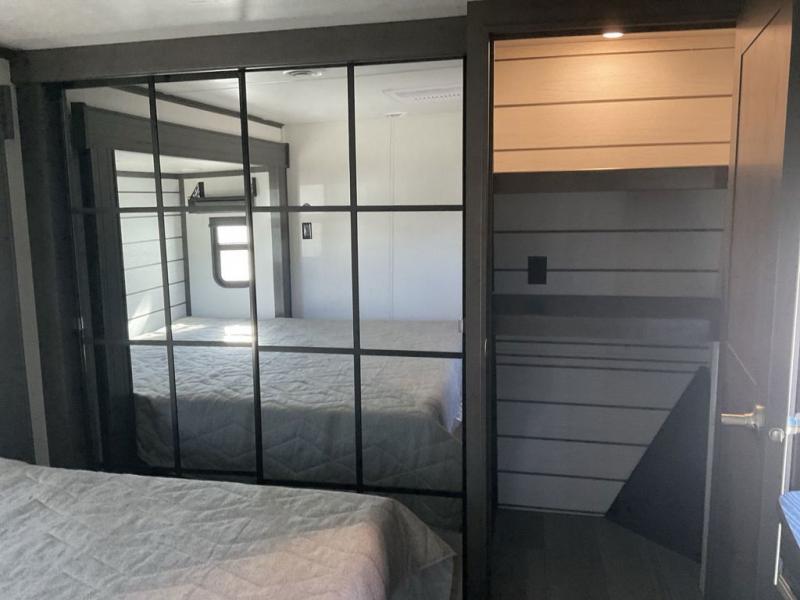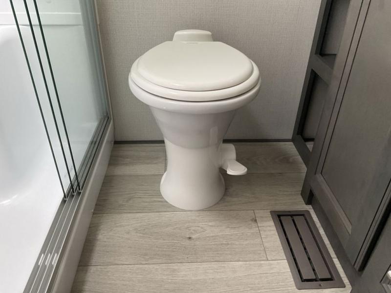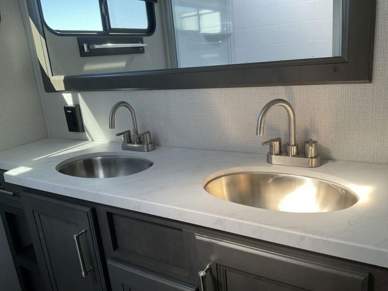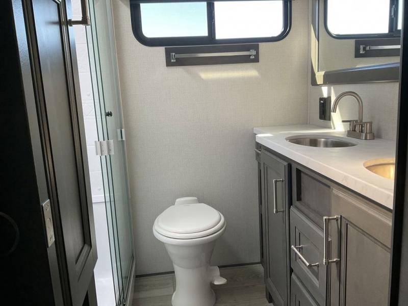 The dual-sink vanity in the full bathroom on this Cougar fifth wheel is what will make your morning routine feel just the same on the road as it does at home! You'll also sleep just as well on the queen-size bed in the front private bedroom, and there is under-bed storage, a full-height wardrobe, and a dresser with hidden storage for all of your personal belongings. As you spend time in the main living area, you'll appreciate having extra space thanks to the set of opposing slides, and the kitchen island will be easy to work around. You'll be able to relax on the tri-fold sleeper sofa and theater seating while you watch the LED HDTV with an pivoting entertainment door and hidden pantry. There is also a booth dinette with storage drawers, convenient shoe storage right as you enter the unit, and an exterior unobstructed pass-thru storage so nothing gets left behind.
