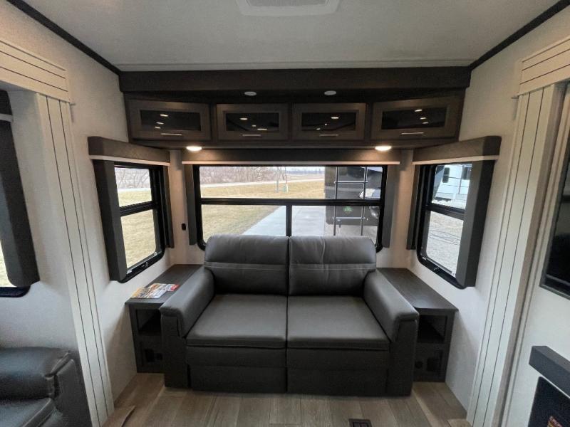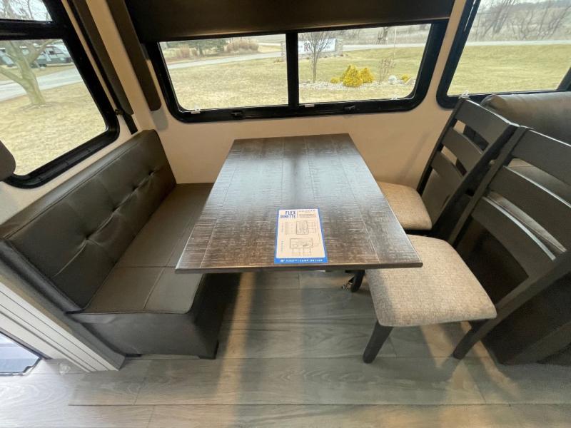 - Relaxation Areas: Includes a tri-fold sleeper sofa, theater seating, and a booth dinette with storage drawers for dining or unwinding.
