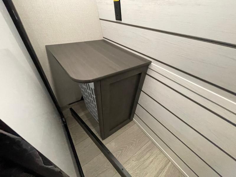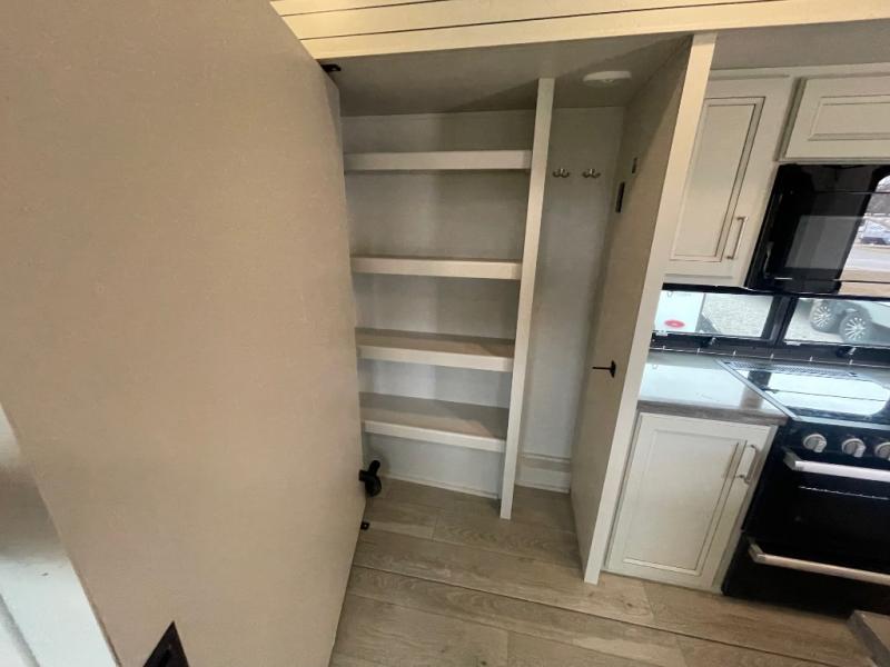 - Private Bedroom: Features a queen bed slide with under-bed storage, a full-height wardrobe, and a dresser with hidden storage.