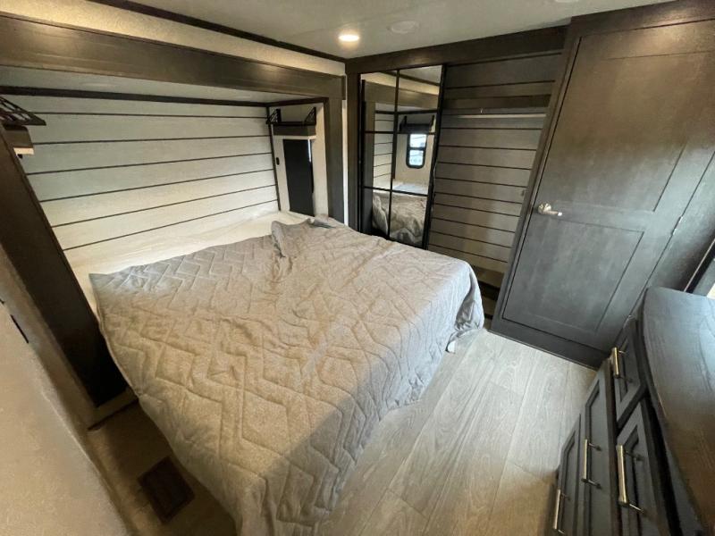 - Durable Design: 5/8" one-piece DynaSpan® flooring, tall slide-outs, and raised-panel hardwood cabinets.