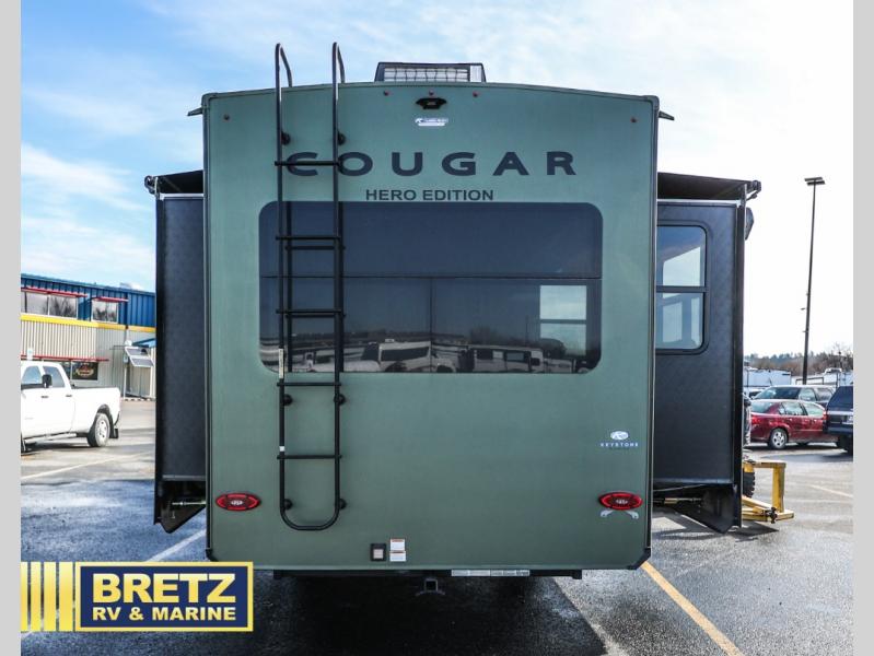 Spend more time having fun and less time worrying about your RV with the Keystone Cougar fifth wheel! These units have all that you will need for excellent vacations. The interior comes with 5/8" one-piece DynaSpan® flooring, tall slide outs for added comfort and head room, night roller shades throughout, and residential, raised-panel hardwood cabinet doors and drawers. You will also enjoy decorative crown molding, a 5,500 BTU electric fireplace with thermostat control and remote, and a Max Air exhaust fan with rain sensor. The exterior is also fully outfitted with a convenience center, friction-hinge entry door, electric four-point auto leveling system, and Lippert SolidStep® on the main entry. There is a full pass-through storage with slam-latch baggage doors, an industry-best 80-gallon fresh tank capacity, a 2" accessory hitch with 300-LB storage capacity, and an outside shower.