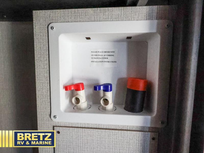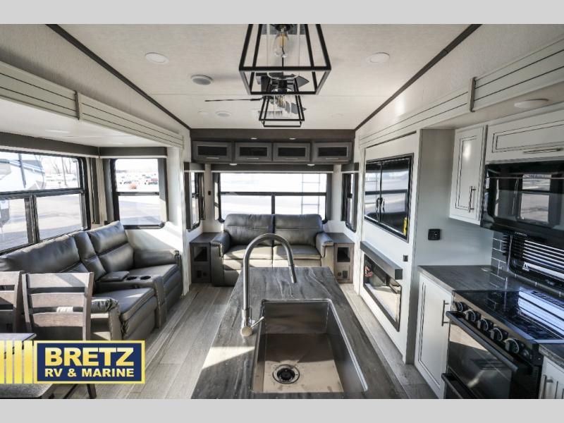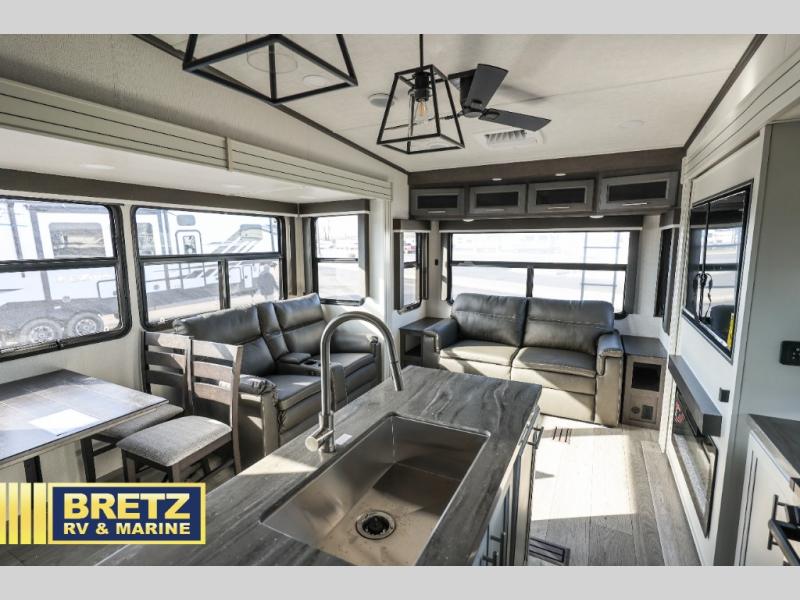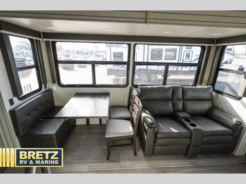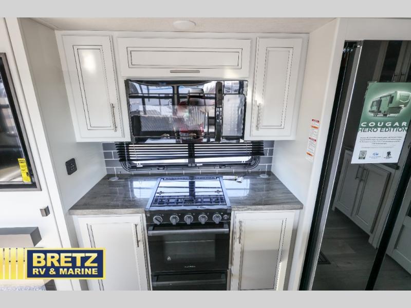 The dual-sink vanity in the full bathroom on this Cougar fifth wheel is what will make your morning routine feel just the same on the road as it does at home! You'll also sleep just as well on the queen-size bed in the front private bedroom, and there is under-bed storage, a full-height wardrobe, and a dresser with hidden storage for all of your personal belongings. As you spend time in the main living area, you'll appreciate having extra space thanks to the set of opposing slides, and the kitchen island will be easy to work around. You'll be able to relax on the tri-fold sleeper sofa and theater seating while you watch the LED HDTV with an pivoting entertainment door and hidden pantry. There is also a booth dinette with storage drawers, convenient shoe storage right as you enter the unit, and an exterior unobstructed pass-thru storage so nothing gets left behind.