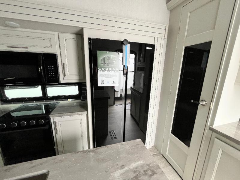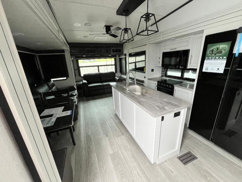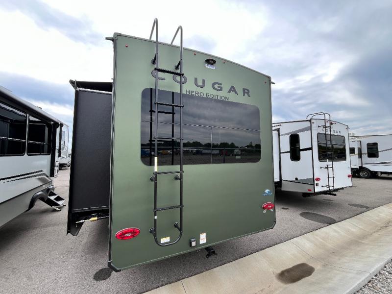 Spend more time having fun and less time worrying about your RV with the Keystone Cougar fifth wheel! These units have all that you will need for excellent vacations. The interior comes with 5/8" one-piece DynaSpan® flooring, tall slide outs for added comfort and head room, night roller shades throughout, and residential, raised-panel hardwood cabinet doors and drawers. You will also enjoy decorative crown molding, a 5,500 BTU electric fireplace with thermostat control and remote, and a Max Air exhaust fan with rain sensor. The exterior is also fully outfitted with a convenience center, friction-hinge entry door, electric four-point auto leveling system, and Lippert SolidStep® on the main entry. Each model is available with the optional Hero Edition. By choosing this edition, you can help support our nation's heros and their families by contributing to the Wounded Warrior Project. This optional package features an industry exclusive full-body paint matte finish, frameless windows, a glass entry door, blackout rims, and green LED exterior accent lighting; see dealer for more details!