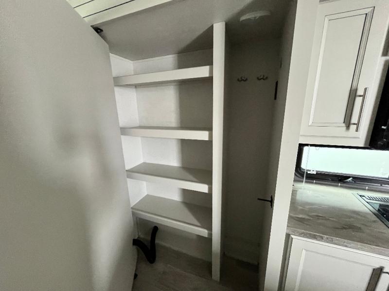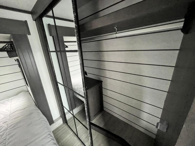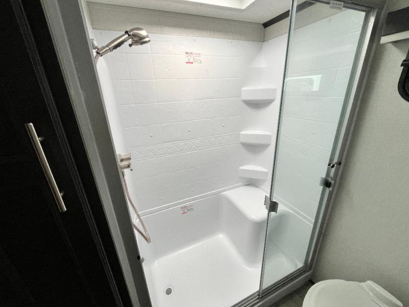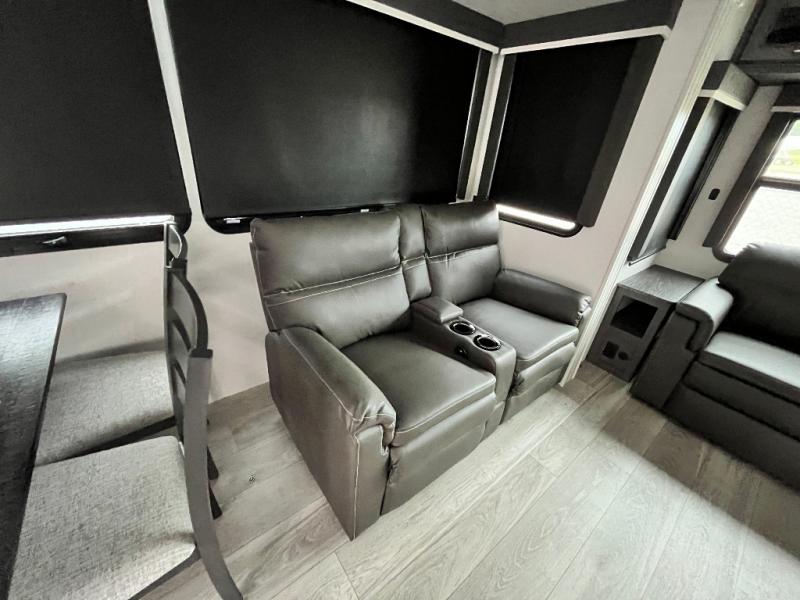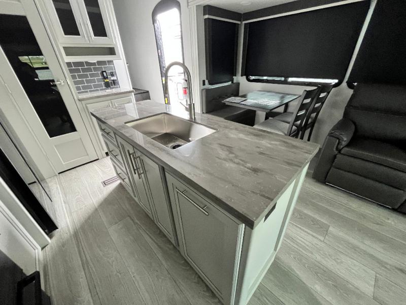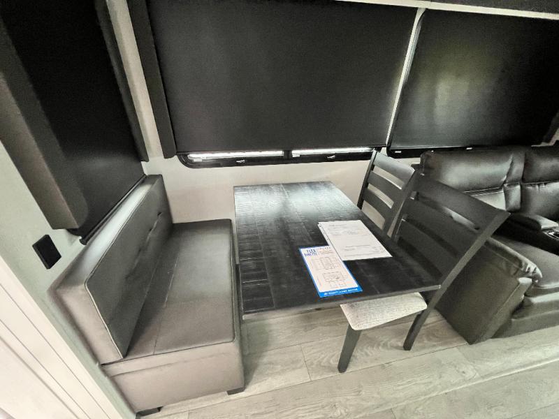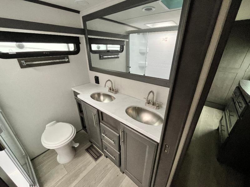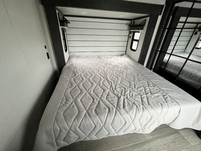 The dual-sink vanity in the full bathroom on this Cougar fifth wheel is what will make your morning routine feel just the same on the road as it does at home! You'll also sleep just as well on the queen-size bed in the front private bedroom, and there is under-bed storage, a full-height wardrobe, and a dresser with hidden storage for all of your personal belongings. As you spend time in the main living area, you'll appreciate having extra space thanks to the set of opposing slides, and the kitchen island will be easy to work around. You'll be able to relax on the tri-fold sleeper sofa and theater seating while you watch the LED HDTV with an pivoting entertainment door and hidden pantry. There is also a booth dinette with storage drawers, convenient shoe storage right as you enter the unit, and an exterior unobstructed pass-thru storage so nothing gets left behind.