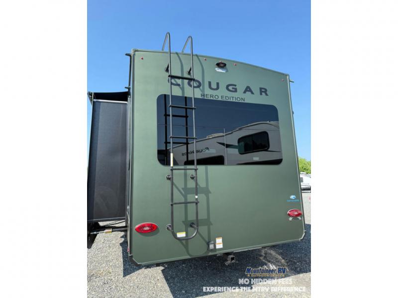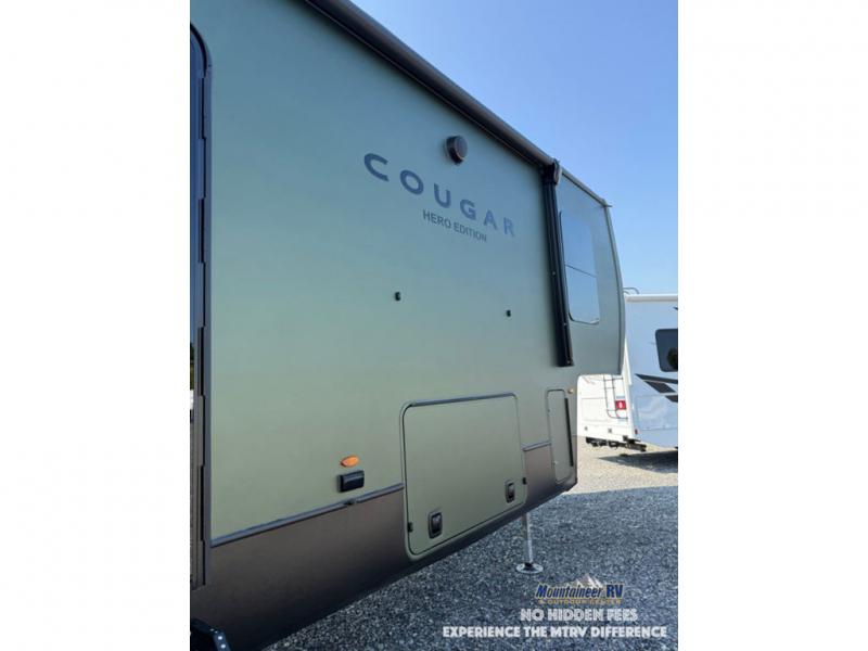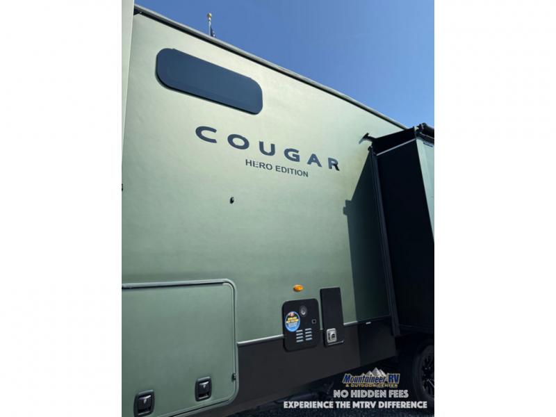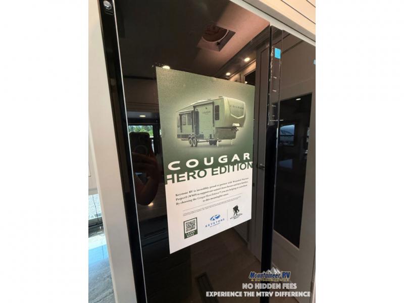 Spend more time having fun and less time worrying about your RV with the Keystone Cougar fifth wheel! These units have all that you will need for excellent vacations. The interior comes with 5/8" one-piece DynaSpan® flooring, tall slide outs for added comfort and head room, night roller shades throughout, and residential, raised-panel hardwood cabinet doors and drawers. You will also enjoy decorative crown molding, a 5,500 BTU electric fireplace with thermostat control and remote, and a Max Air exhaust fan with rain sensor. The exterior is also fully outfitted with a convenience center, friction-hinge entry door, electric four-point auto leveling system, and Lippert SolidStep® on the main entry. Each model is available with the optional Hero Edition. By choosing this edition, you can help support our nation's heros and their families by contributing to the Wounded Warrior Project. This optional package features an industry exclusive full-body paint matte finish, frameless windows, a glass entry door, blackout rims, and green LED exterior accent lighting; see dealer for more details!