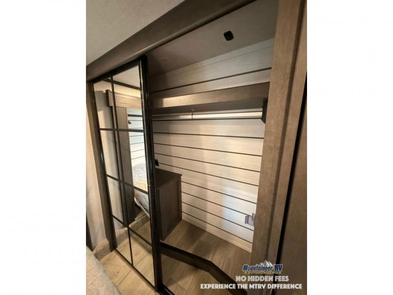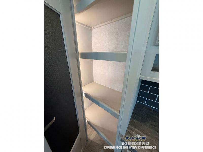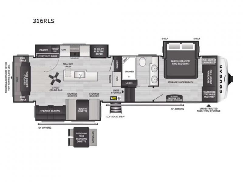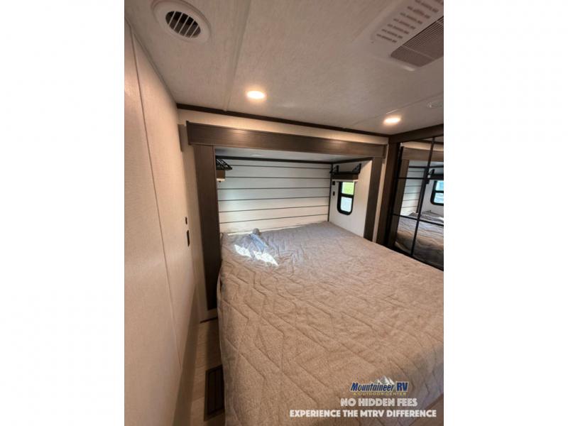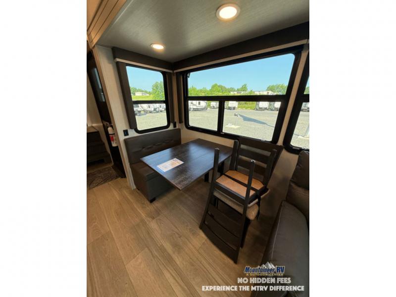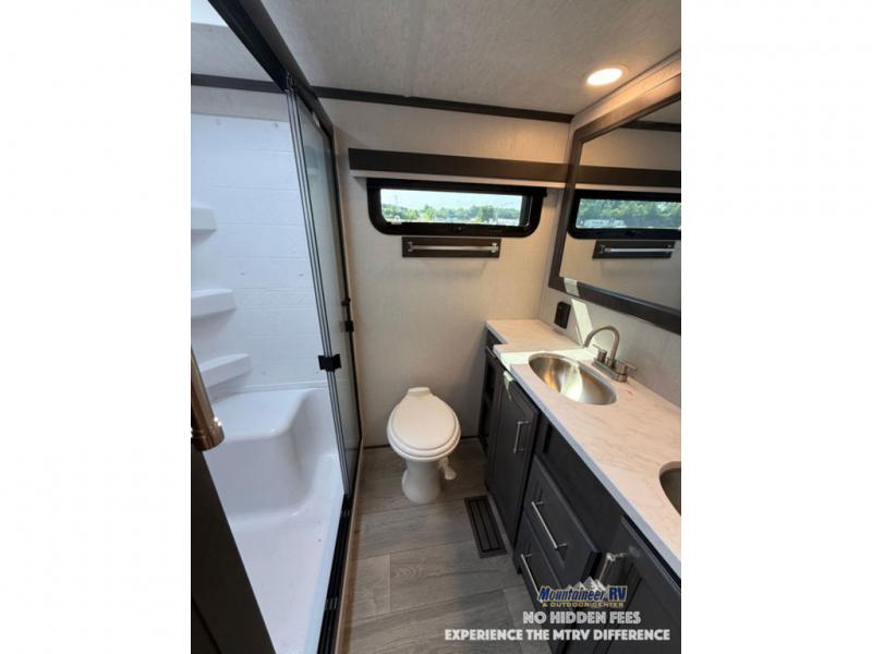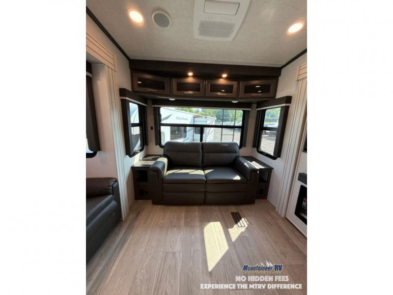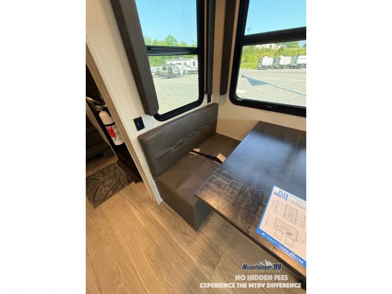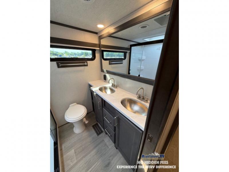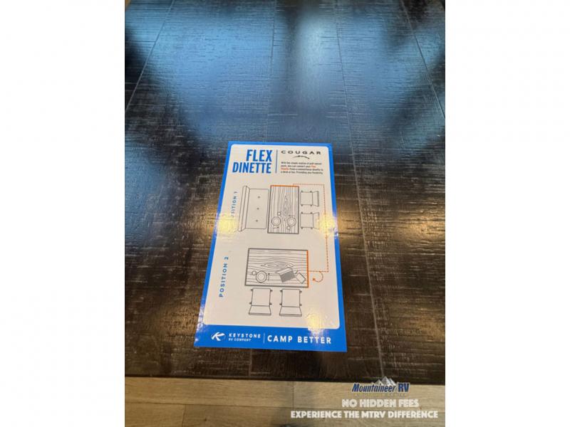 The dual-sink vanity in the full bathroom on this Cougar fifth wheel is what will make your morning routine feel just the same on the road as it does at home! You'll also sleep just as well on the queen-size bed in the front private bedroom, and there is under-bed storage, a full-height wardrobe, and a dresser with hidden storage for all of your personal belongings. As you spend time in the main living area, you'll appreciate having extra space thanks to the set of opposing slides, and the kitchen island will be easy to work around. You'll be able to relax on the tri-fold sleeper sofa and theater seating while you watch the LED HDTV with an pivoting entertainment door and hidden pantry. There is also a booth dinette with storage drawers, convenient shoe storage right as you enter the unit, and an exterior unobstructed pass-thru storage so nothing gets left behind.