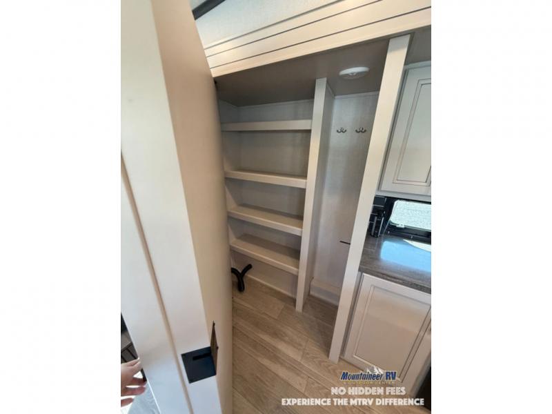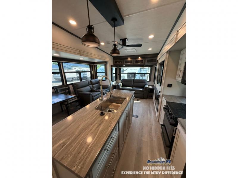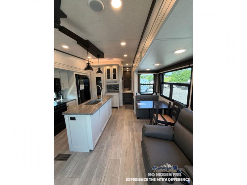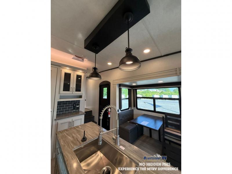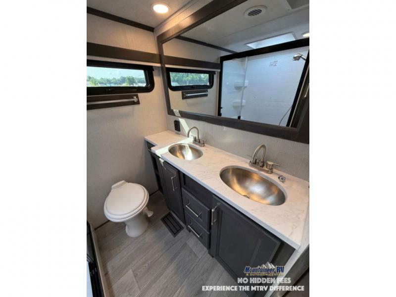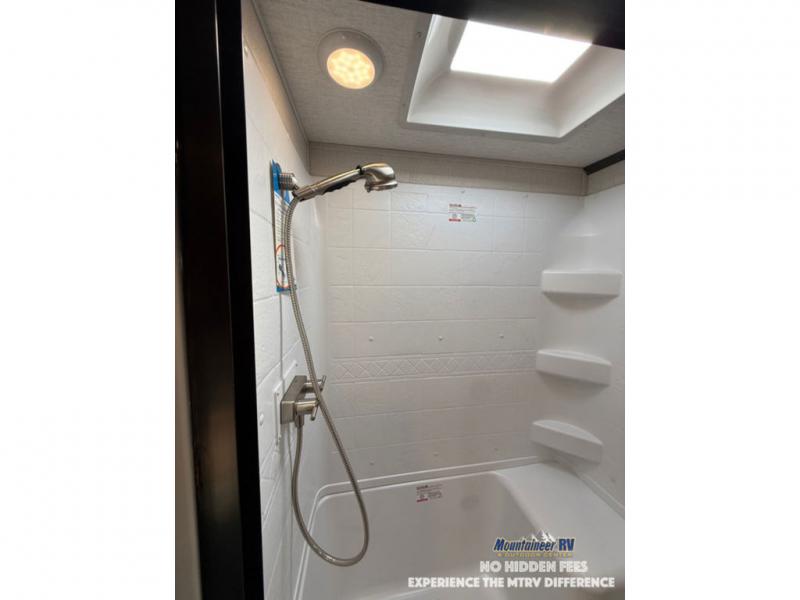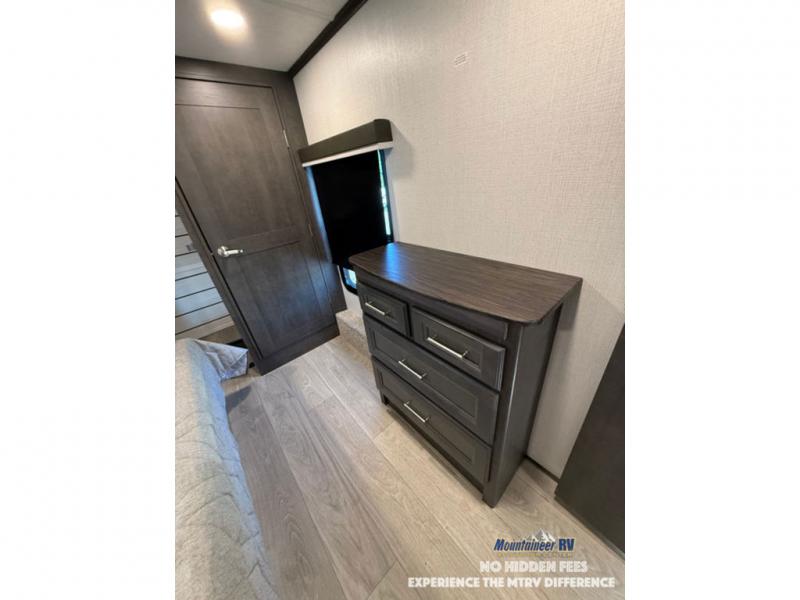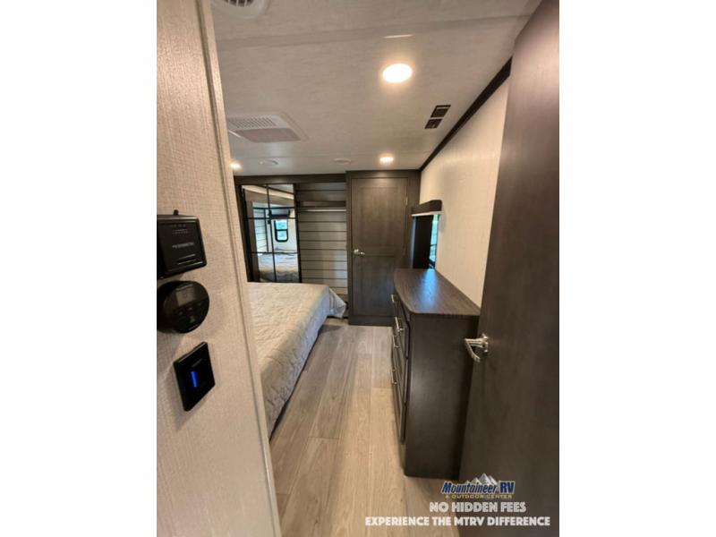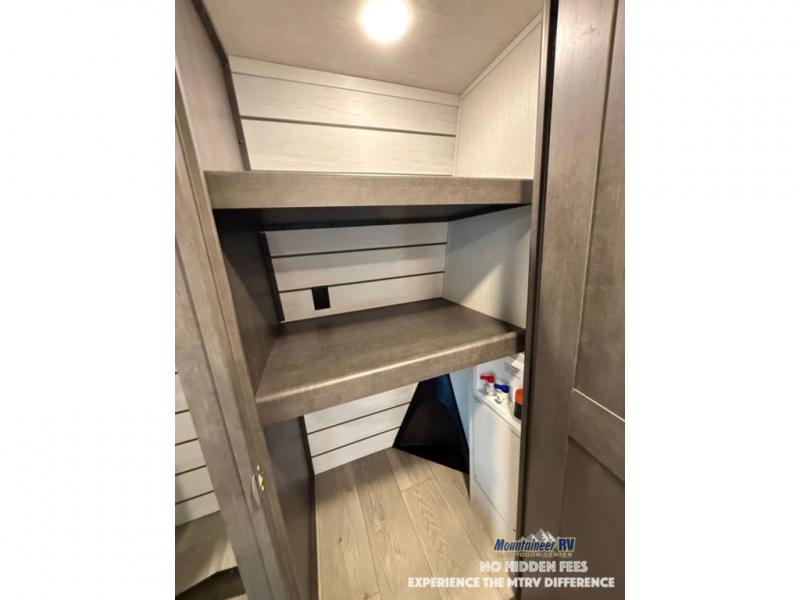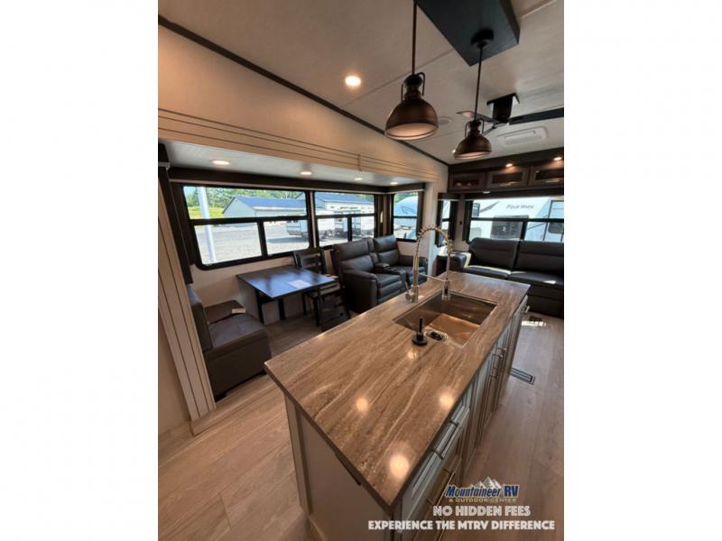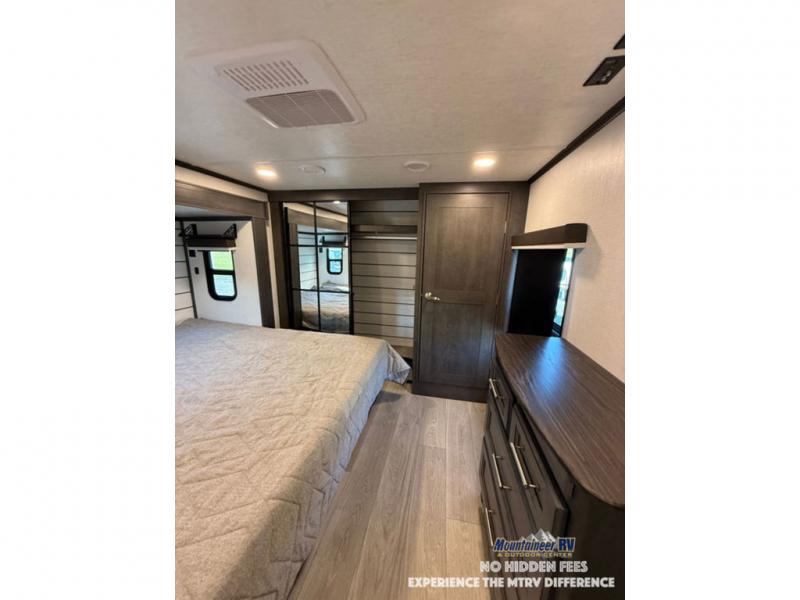 The dual-sink vanity in the full bathroom on this Cougar fifth wheel is what will make your morning routine feel just the same on the road as it does at home! You'll also sleep just as well on the queen-size bed in the front private bedroom, and there is under-bed storage, a full-height wardrobe, and a dresser with hidden storage for all of your personal belongings. As you spend time in the main living area, you'll appreciate having extra space thanks to the set of opposing slides, and the kitchen island will be easy to work around. You'll be able to relax on the tri-fold sleeper sofa and theater seating while you watch the LED HDTV with an pivoting entertainment door and hidden pantry. There is also a booth dinette with storage drawers, convenient shoe storage right as you enter the unit, and an exterior unobstructed pass-thru storage so nothing gets left behind.