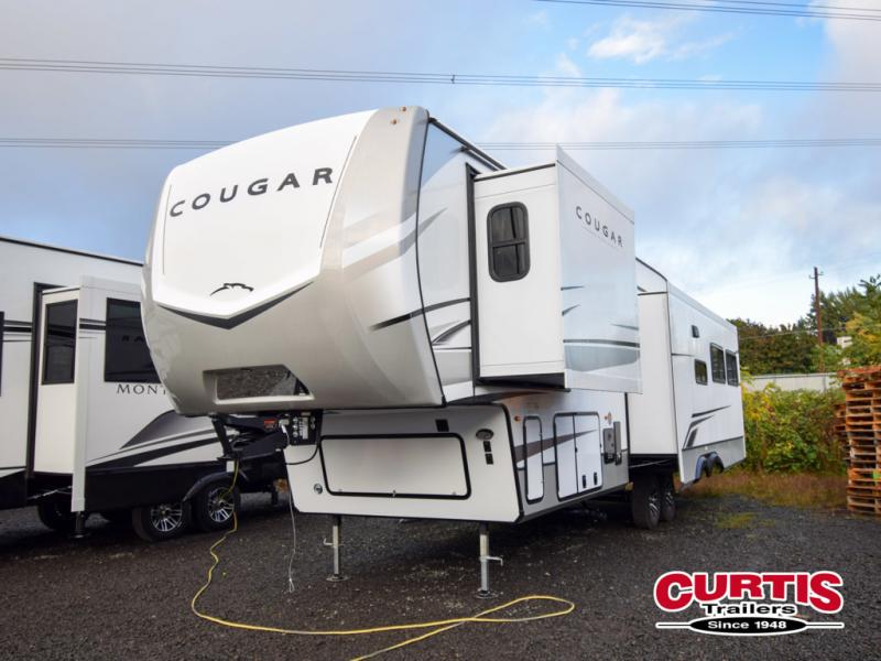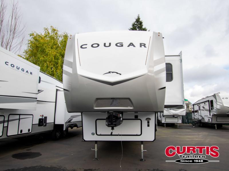 Spend more time having fun and less time worrying about your RV with the Keystone Cougar fifth wheel! These units have all that you will need for excellent vacations. The interior comes with 5/8" one-piece DynaSpan® flooring, tall slide outs for added comfort and head room, night roller shades throughout, and residential, raised-panel hardwood cabinet doors and drawers. You will also enjoy decorative crown molding, a 5,500 BTU electric fireplace with thermostat control and remote, and a Max Air exhaust fan with rain sensor. The exterior is also fully outfitted with a convenience center, friction-hinge entry door, electric four-point auto leveling system, and Lippert SolidStep® on the main entry. There is a full pass-through storage with slam-latch baggage doors, an industry-best 80-gallon fresh tank capacity, a 2" accessory hitch with 300-LB storage capacity, and an outside shower.