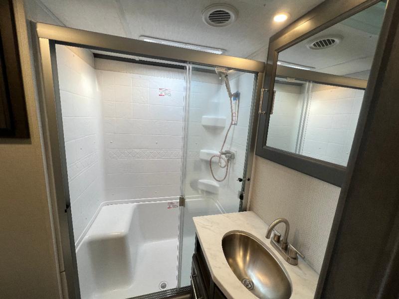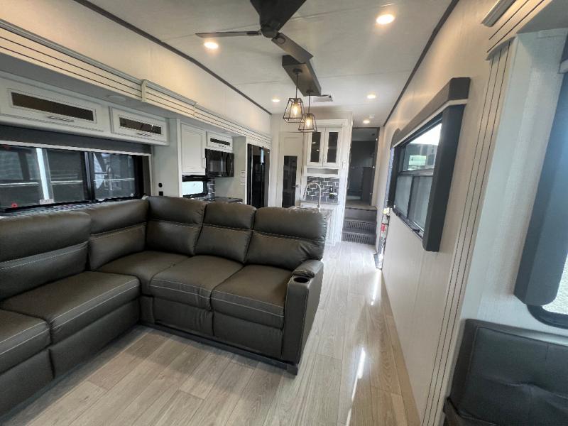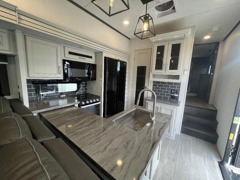 Time at the campground will be spent in comfort thanks to this fifth wheel that can sleep four to six people comfortably. The rear living area/den includes a huge L-shaped sofa with theater seats and a king tri-fold sofa, plus a free-standing dinette with an ottoman on one side, a fireplace, and an LED HDTV for movie nights. The chef of your group will love the additional counter space in the kitchen, along with a 21" Furrion range, plus a pantry and 16 cu. ft. 12V refrigerator. The full bath allows you to clean up each day and the front private bedroom will provide you with your own space at night. Here, you'll find a queen bed slide out that can optioned out for a king bed, plus a full height wardrobe, a second wardrobe with washer and dryer prep, and a dresser with a sliding top and hidden storage for valuables!